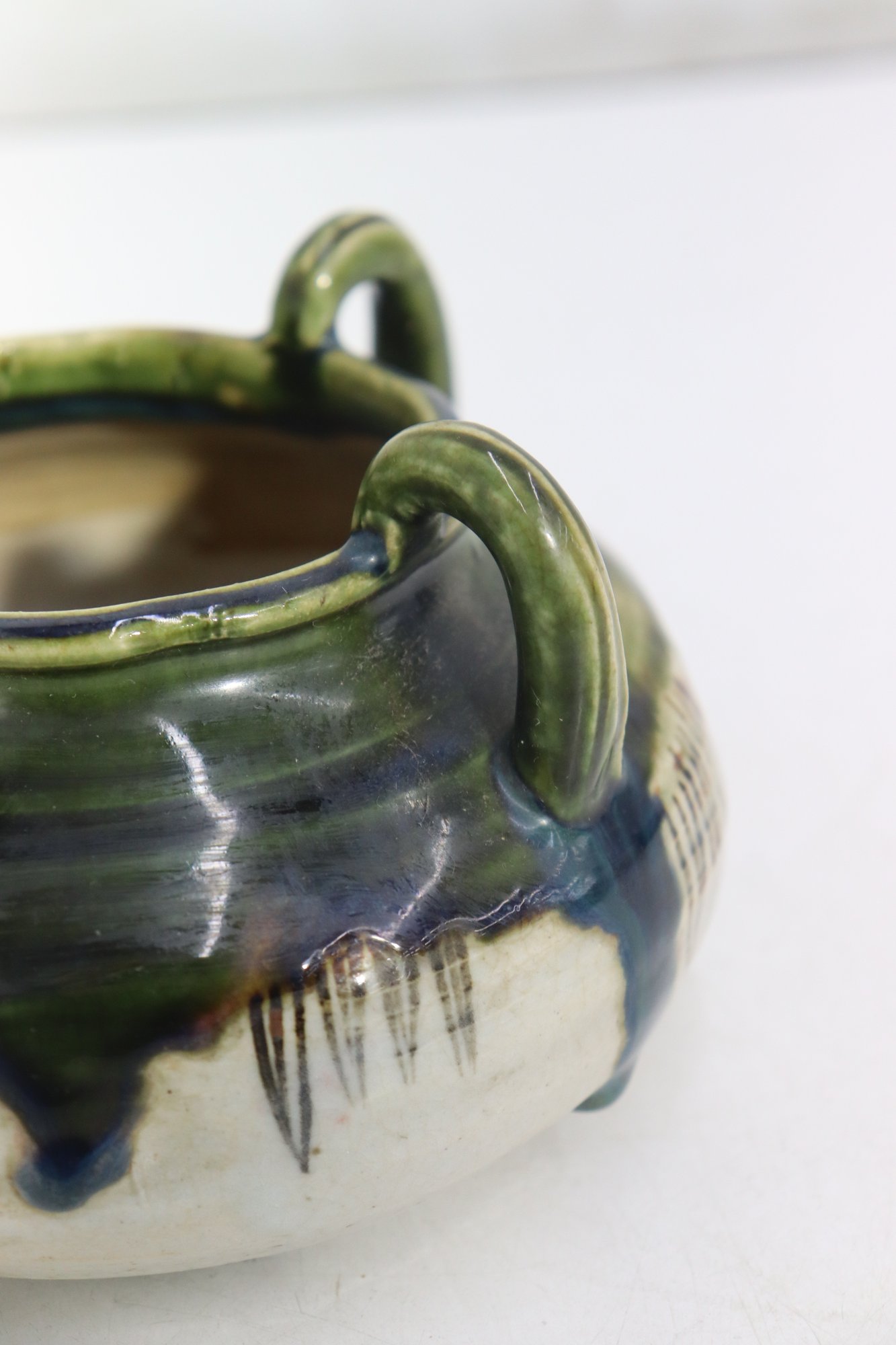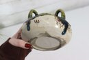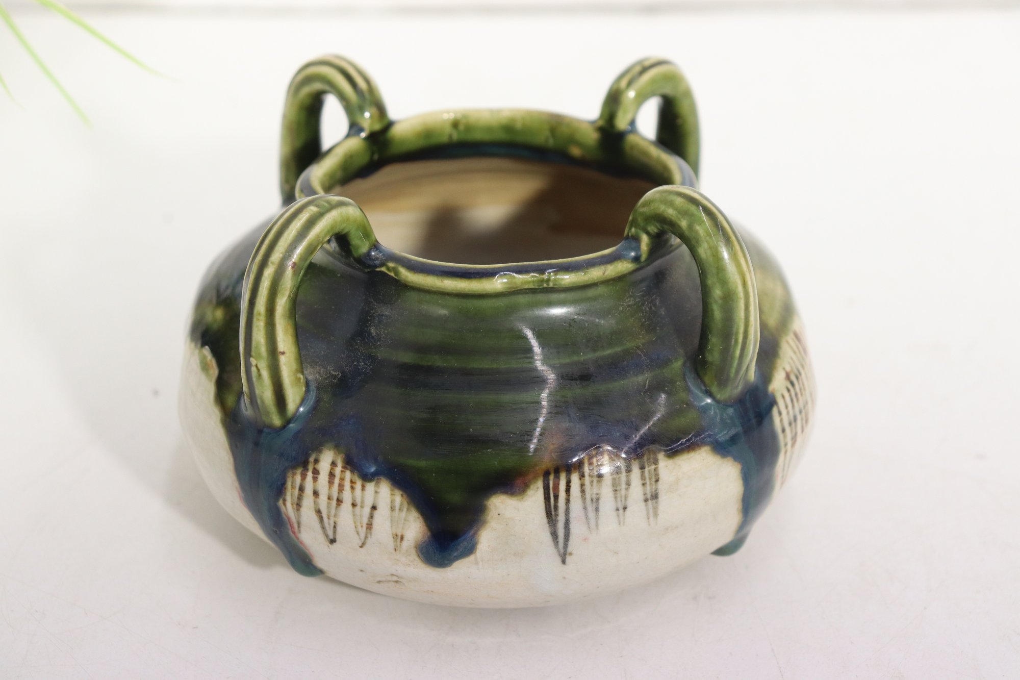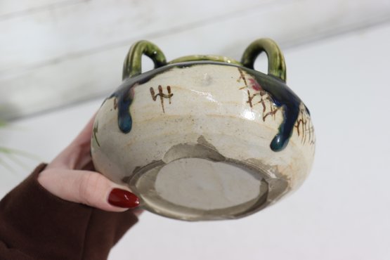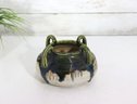 vintage art pottery bowl, standing approximately 4 inches high, featuring a rounded, cauldron-like form with four applied loop handles around the rim. This piece is finished in an attractive green and deep blue drip glaze over a natural stoneware body, giving it wonderful texture and visual depth.