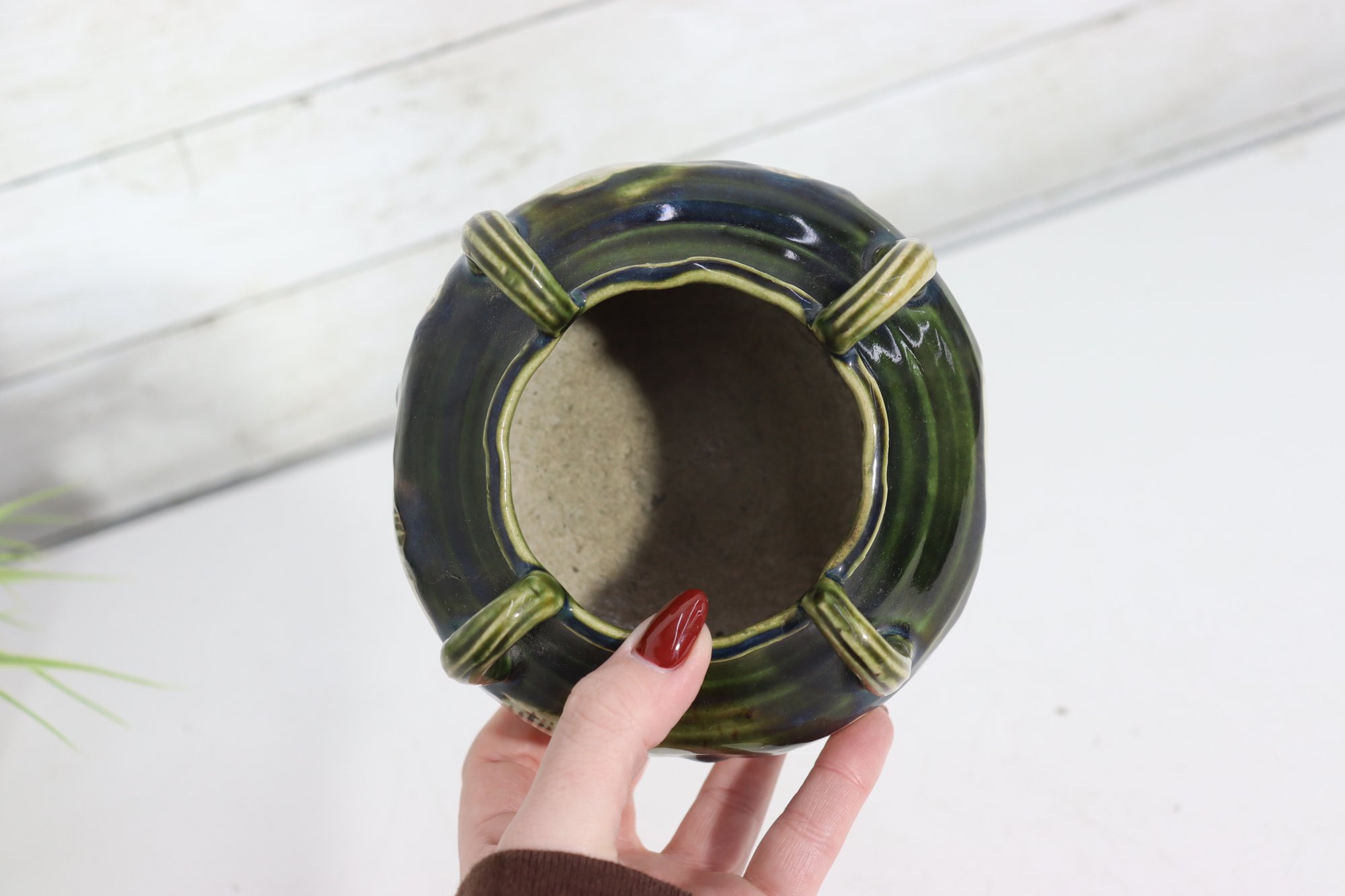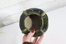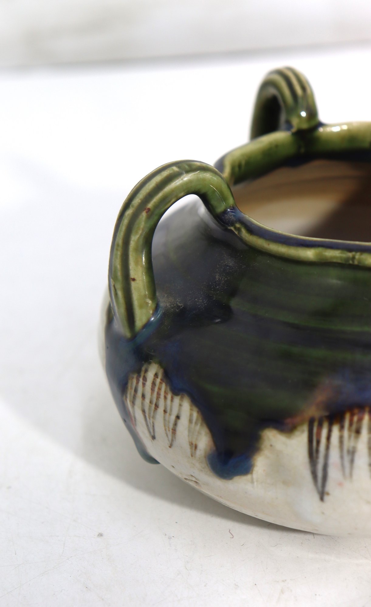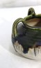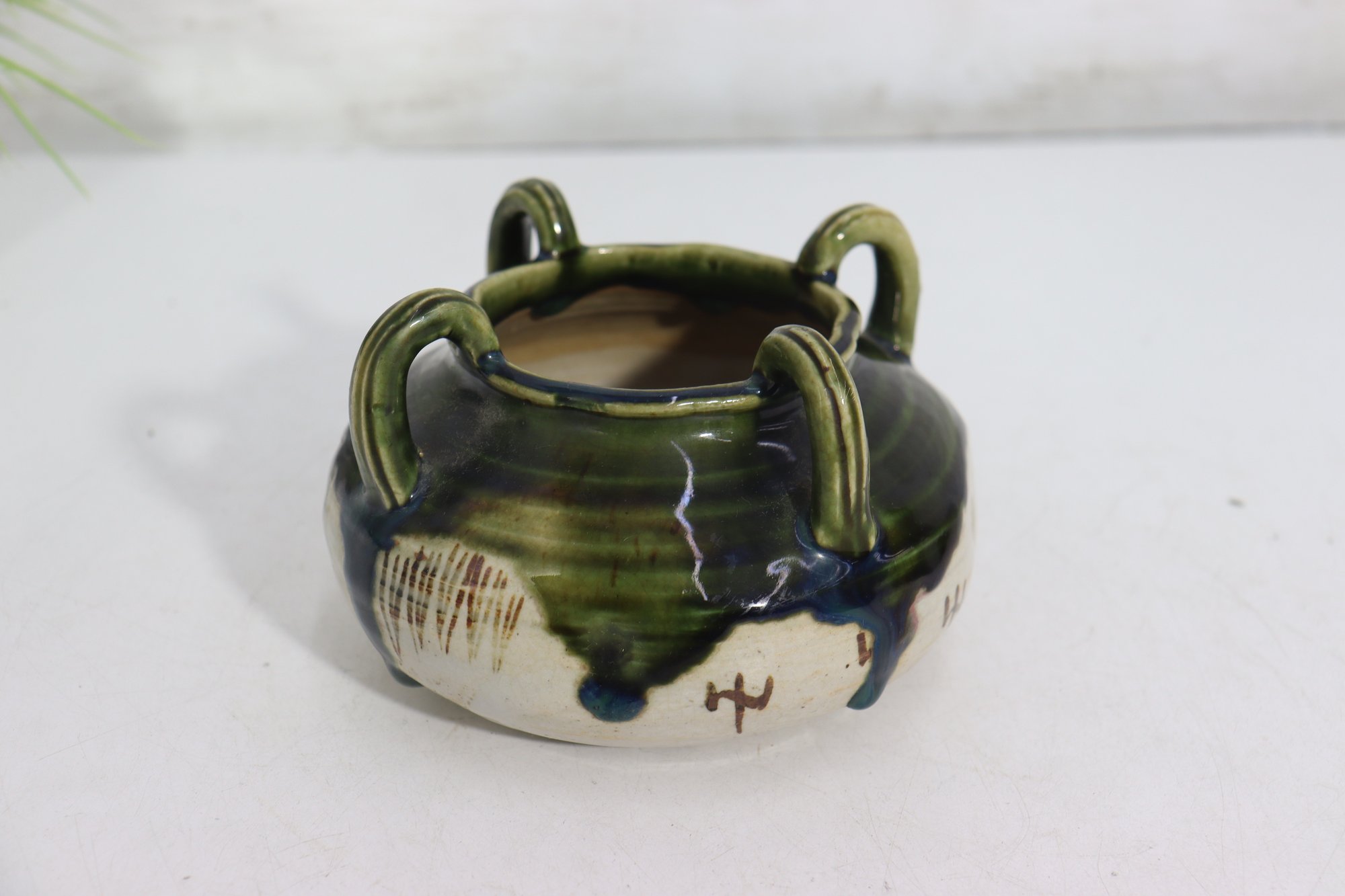 vintage art pottery bowl, standing approximately 4 inches high, featuring a rounded, cauldron-like form with four applied loop handles around the rim. This piece is finished in an attractive green and deep blue drip glaze over a natural stoneware body, giving it wonderful texture and visual depth.