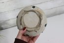 The handcrafted nature is evident in the organic shape, glaze flow, and subtle variations throughout. The interior is glazed, while the underside shows the raw pottery base and kiln marks typical of studio pottery.