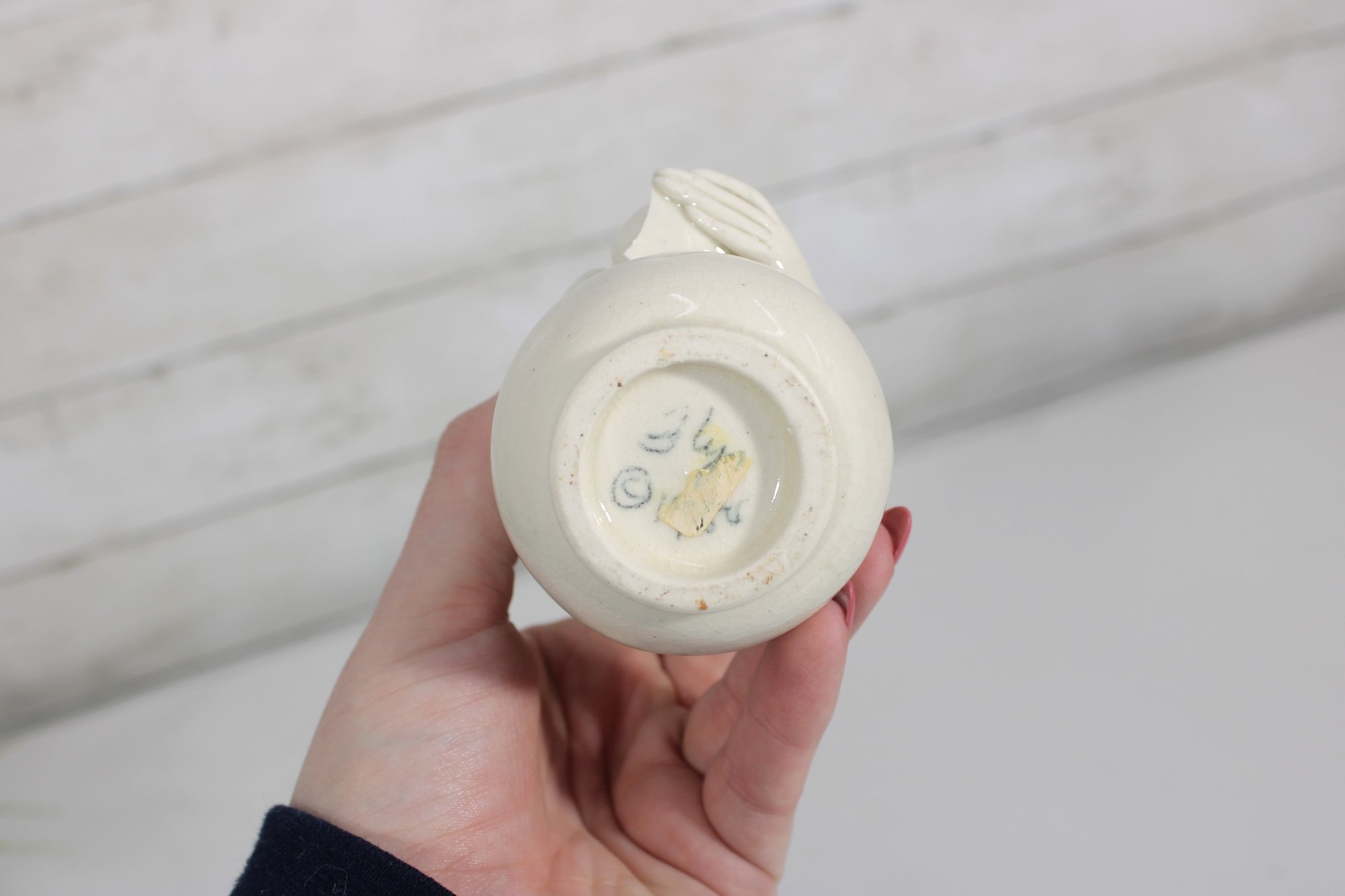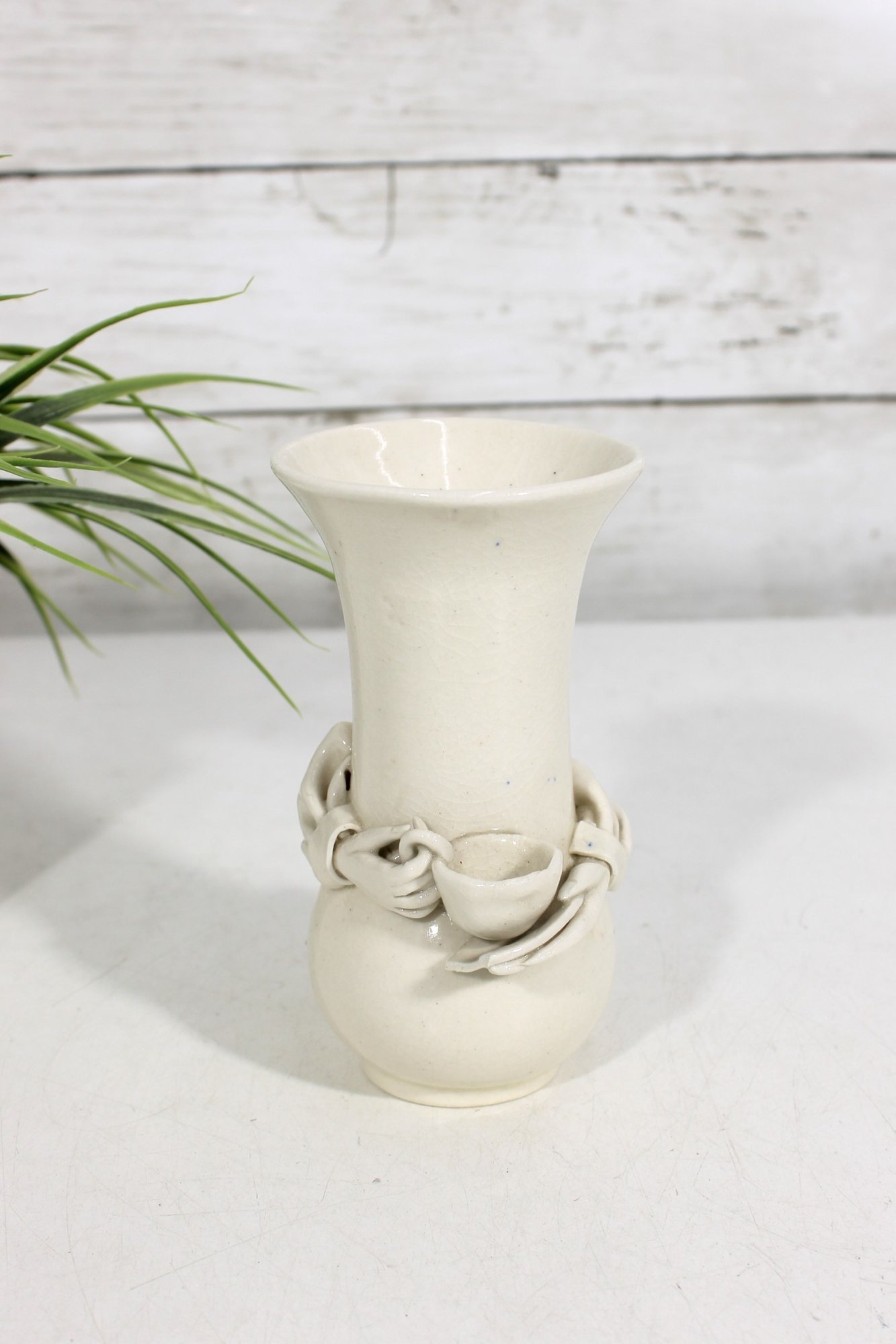 The vase stands approximately 5 inches tall and displays excellent craftsmanship, with carefully molded hand details that wrap around the midsection. The underside shows a maker’s mark on the base (see photos), adding interest for collectors of studio pottery or unusual decorative ceramics.