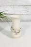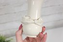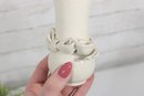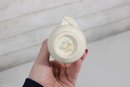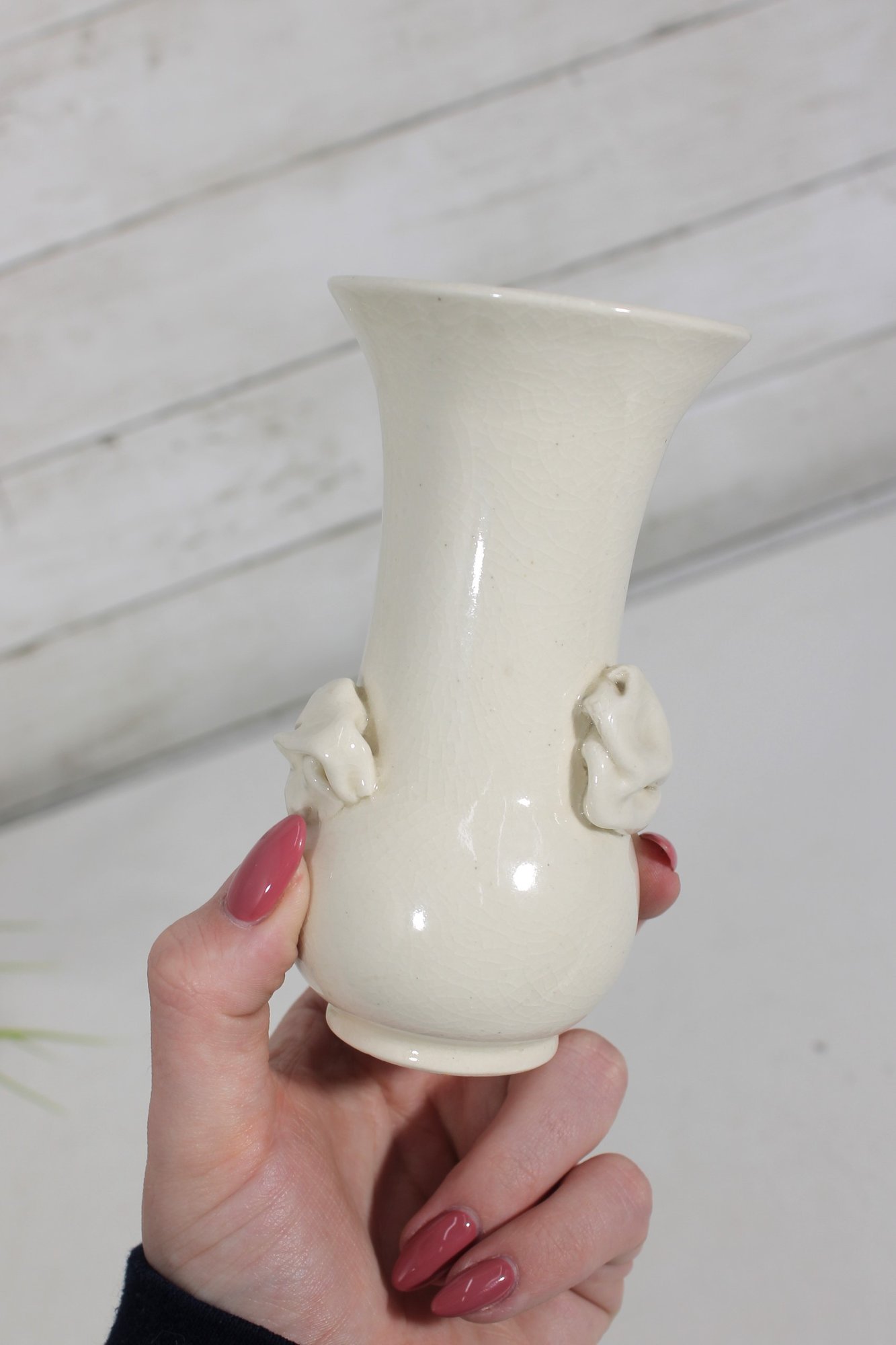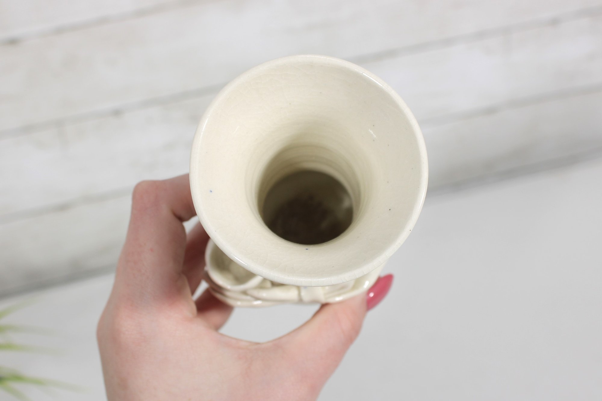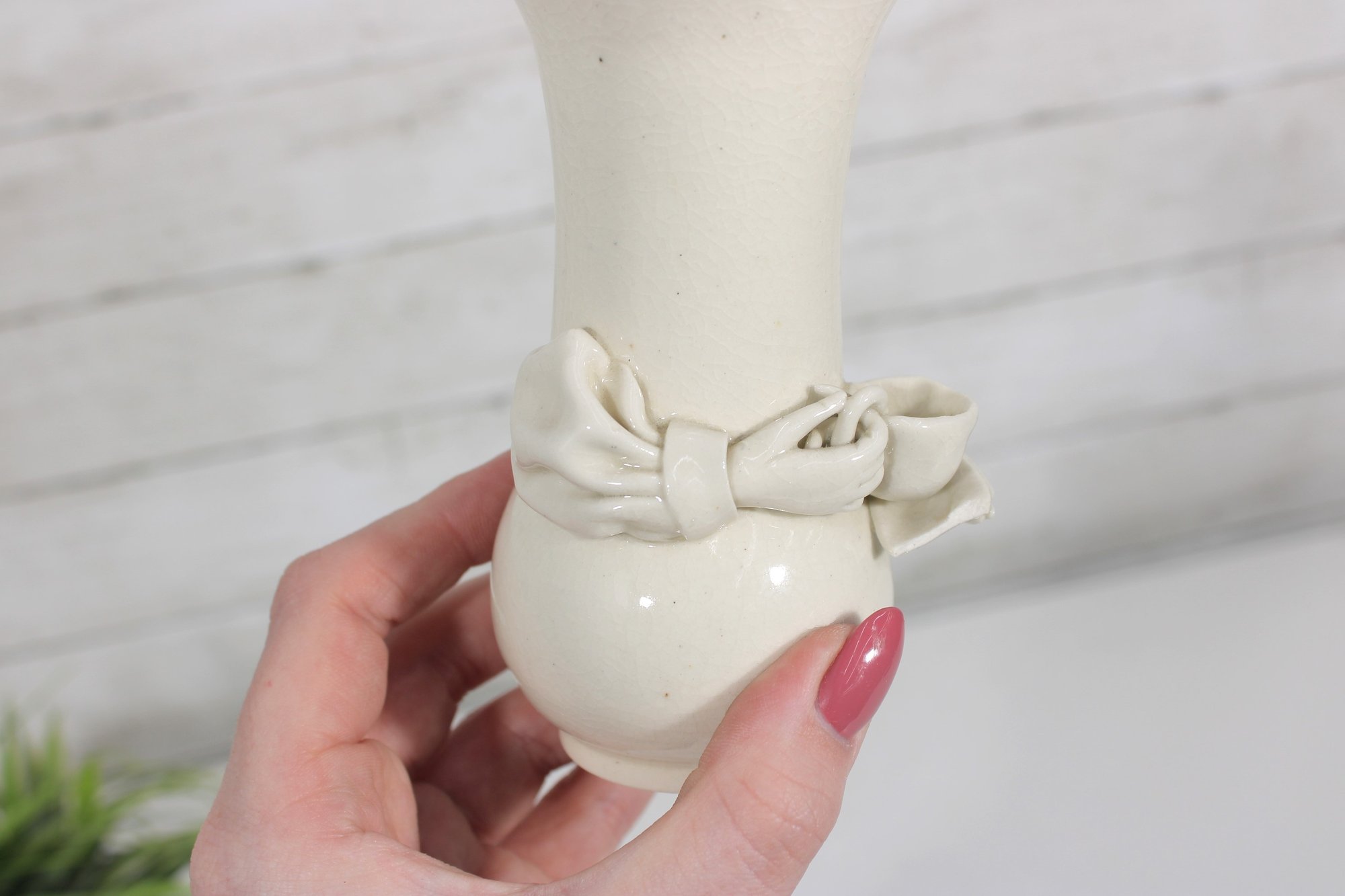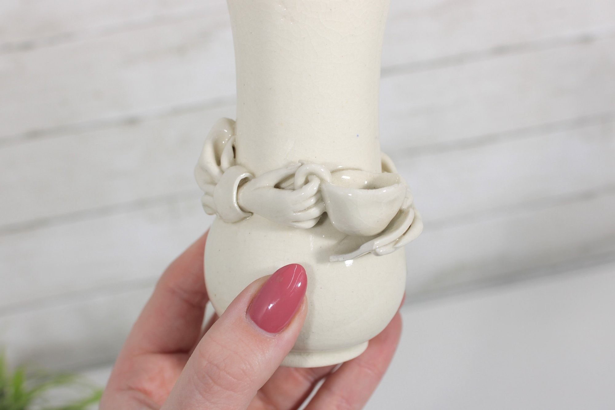 This unique vintage art pottery vase features an eye-catching sculptural design with detailed hands encircling the body while appearing to hold a small cup or vessel. The piece has a soft cream or ivory glaze and an elegant flared neck that gives it a striking, artistic presence despite its small size.