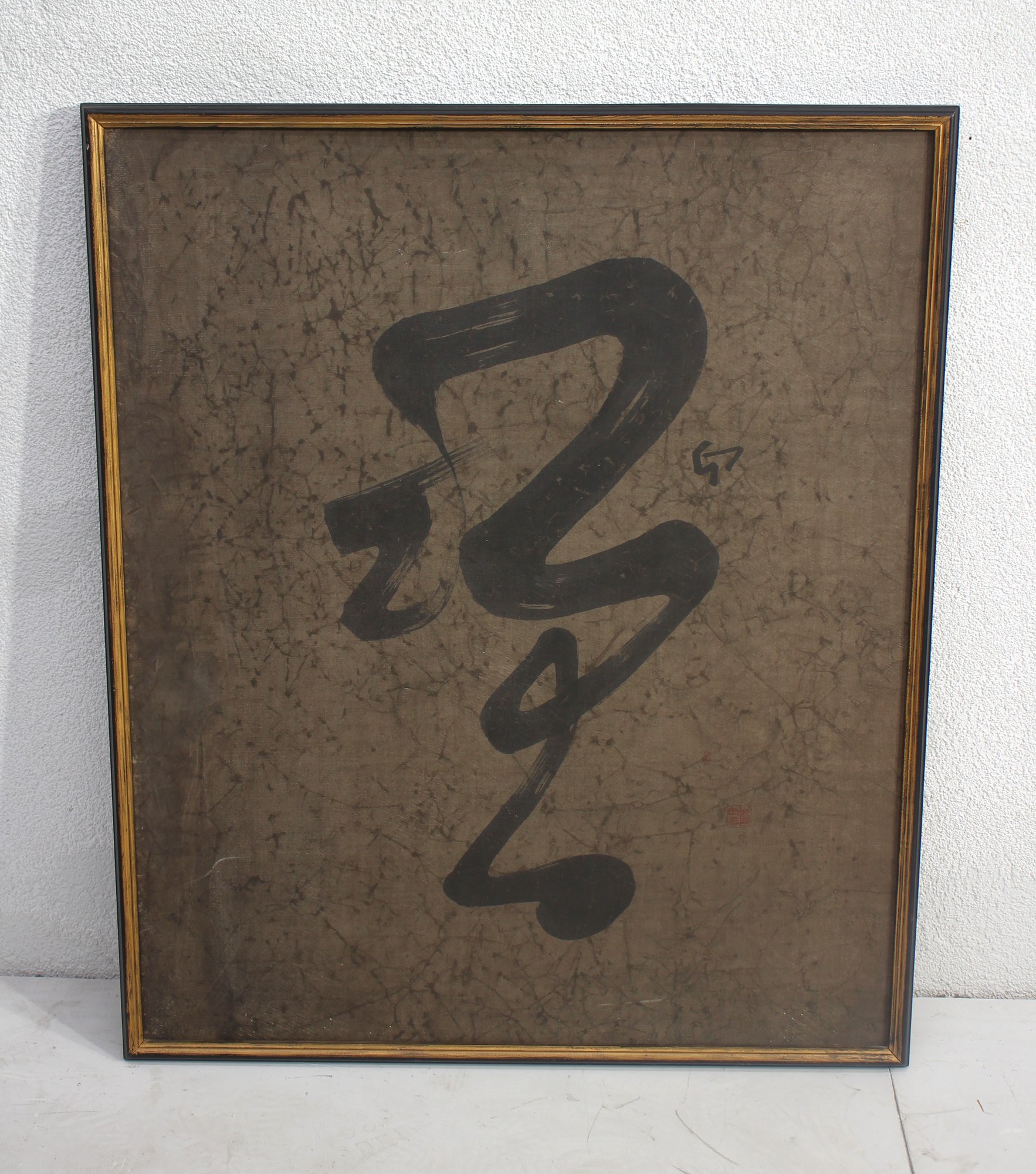 a beautiful vintage Asian calligraphy print, featuring a bold, abstract character in deep black ink on a textured background. The artwork has a striking minimalist aesthetic, evoking traditional Zen ink painting and calligraphy styles.