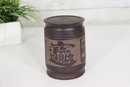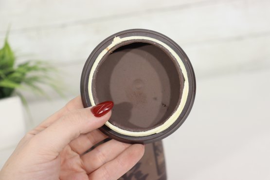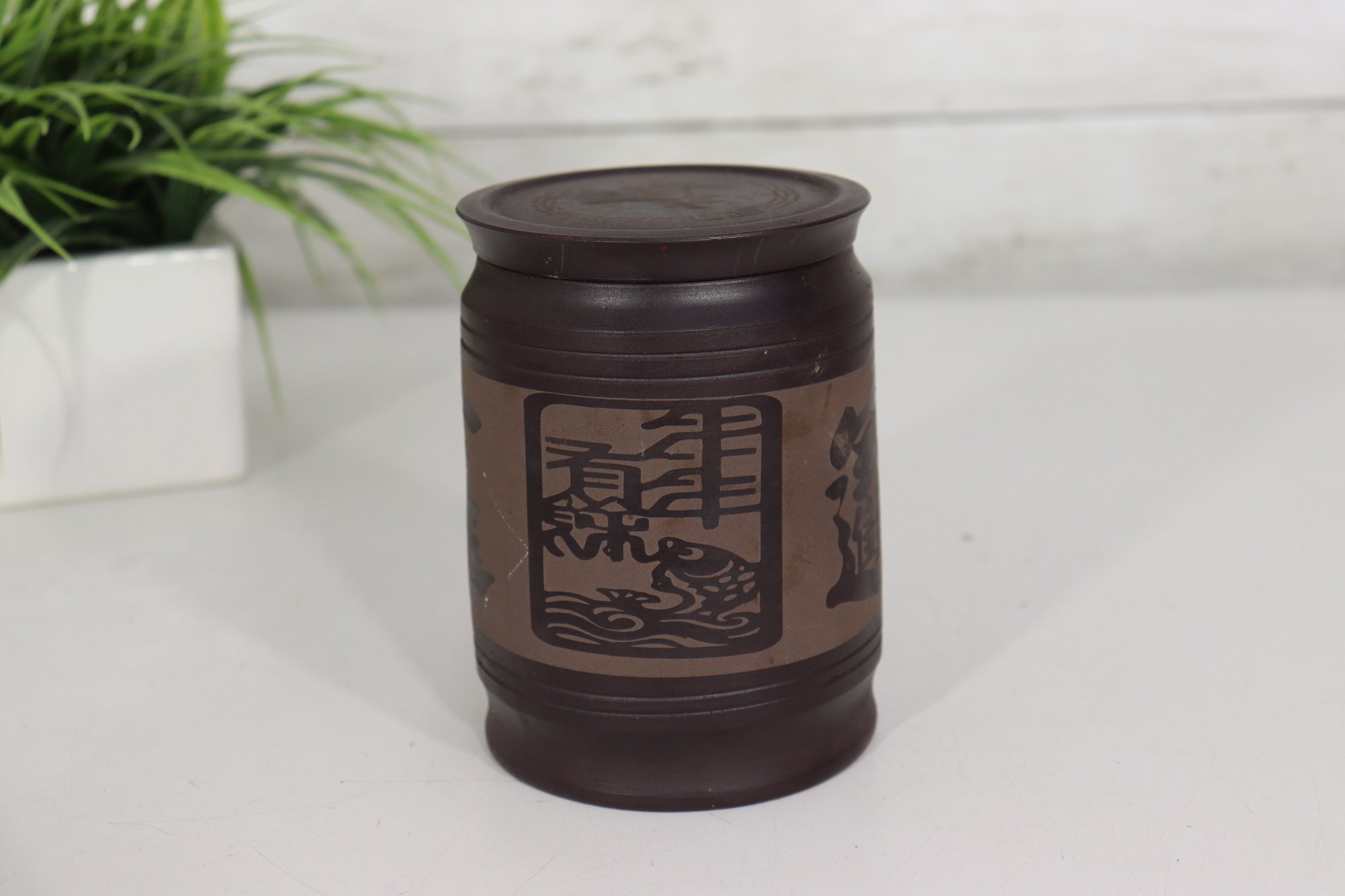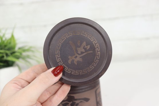 Vintage dark brown ceramic lidded jar / canister featuring Asian script characters and decorative panel imagery around the sides. Lid has matching design detail and fits securely. Base is maker stamped.