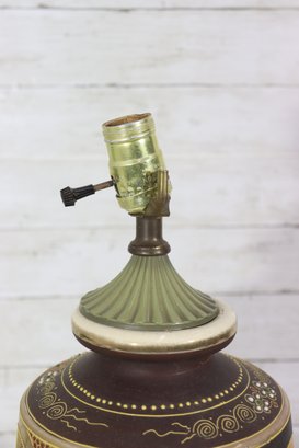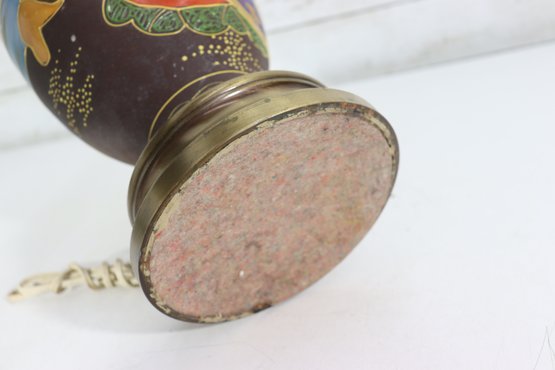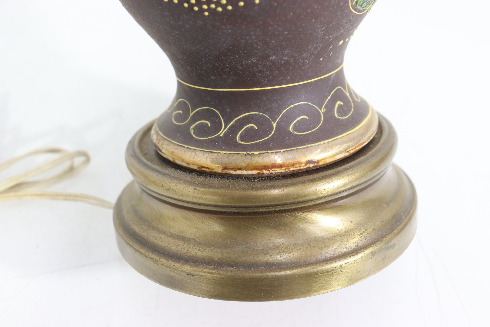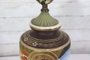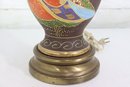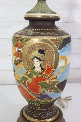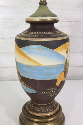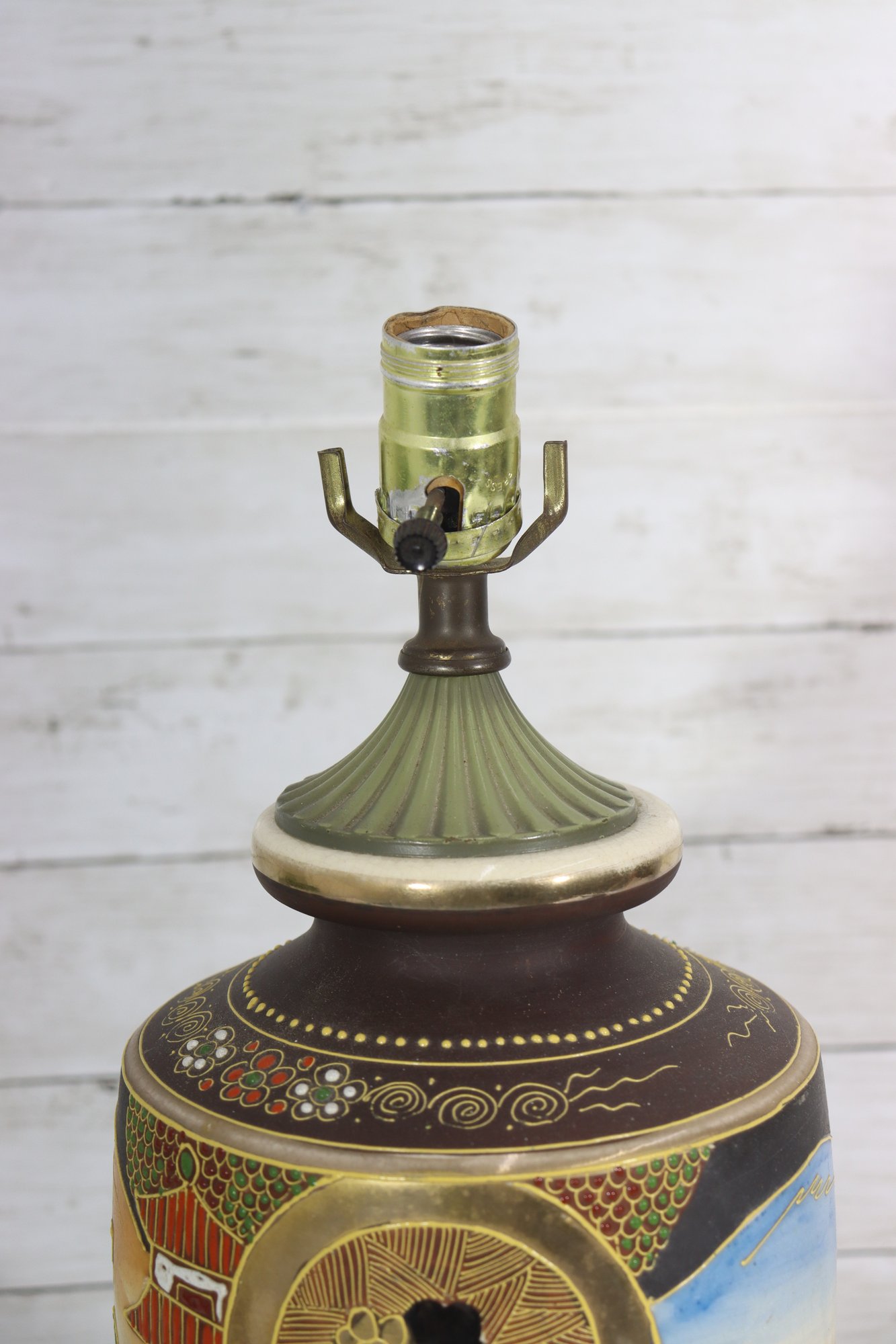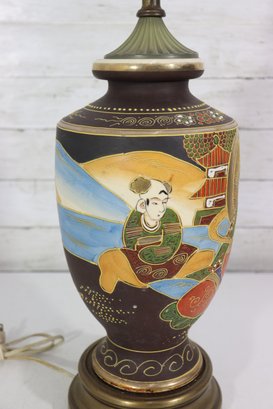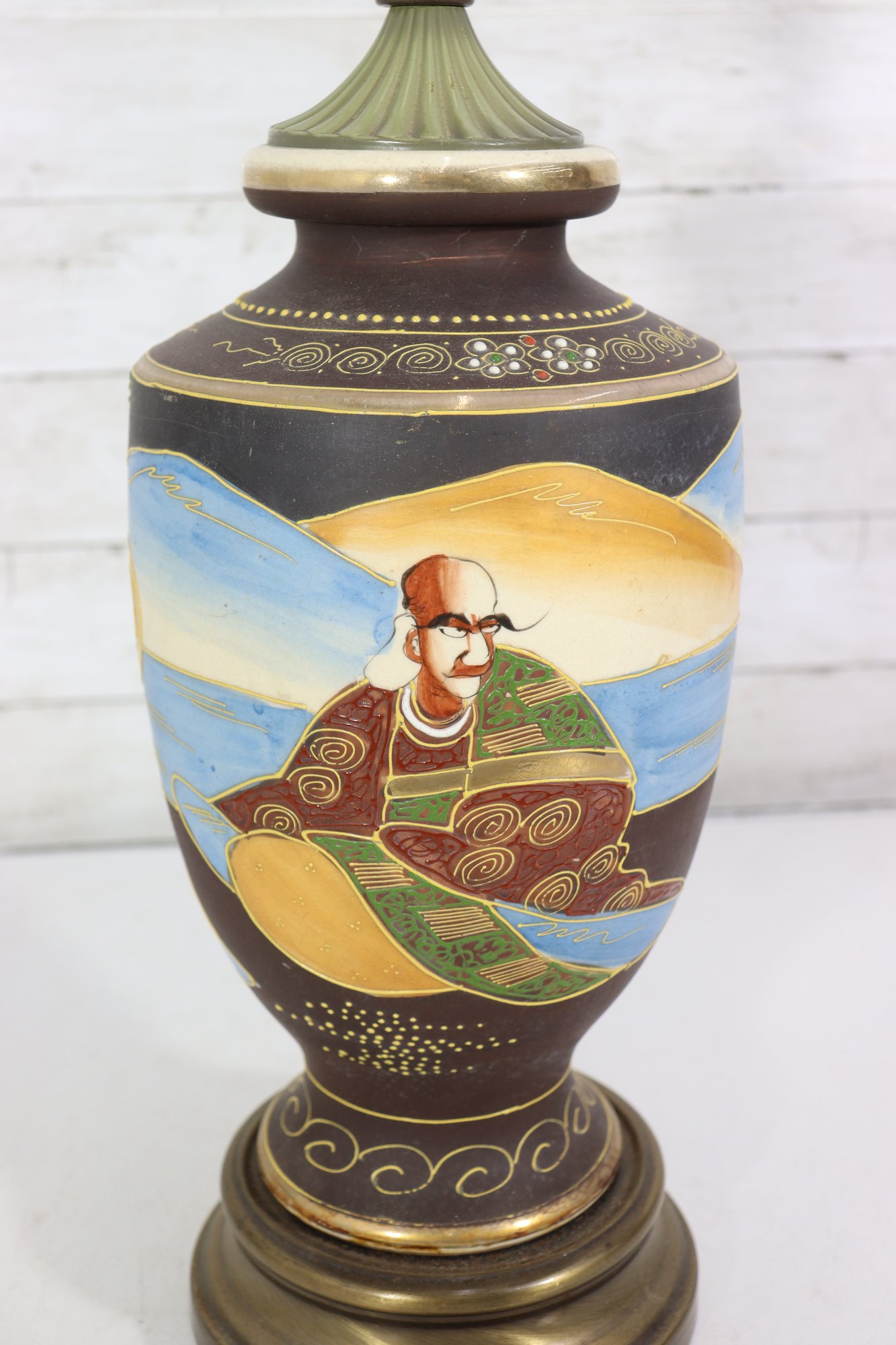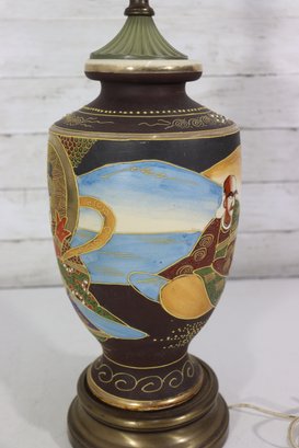 vintage Asian-inspired ceramic table lamp, beautifully hand painted with detailed figural scenes set against a rich, dark ground with gilt-style accents. The artwork features traditionally dressed figures in a landscape setting, giving the lamp a classic Oriental / Satsuma-style decorative appeal.