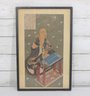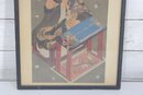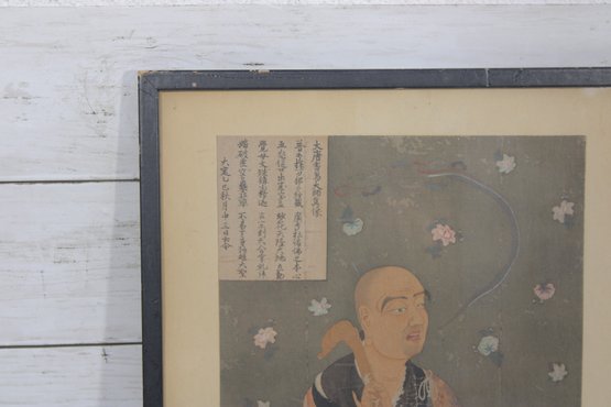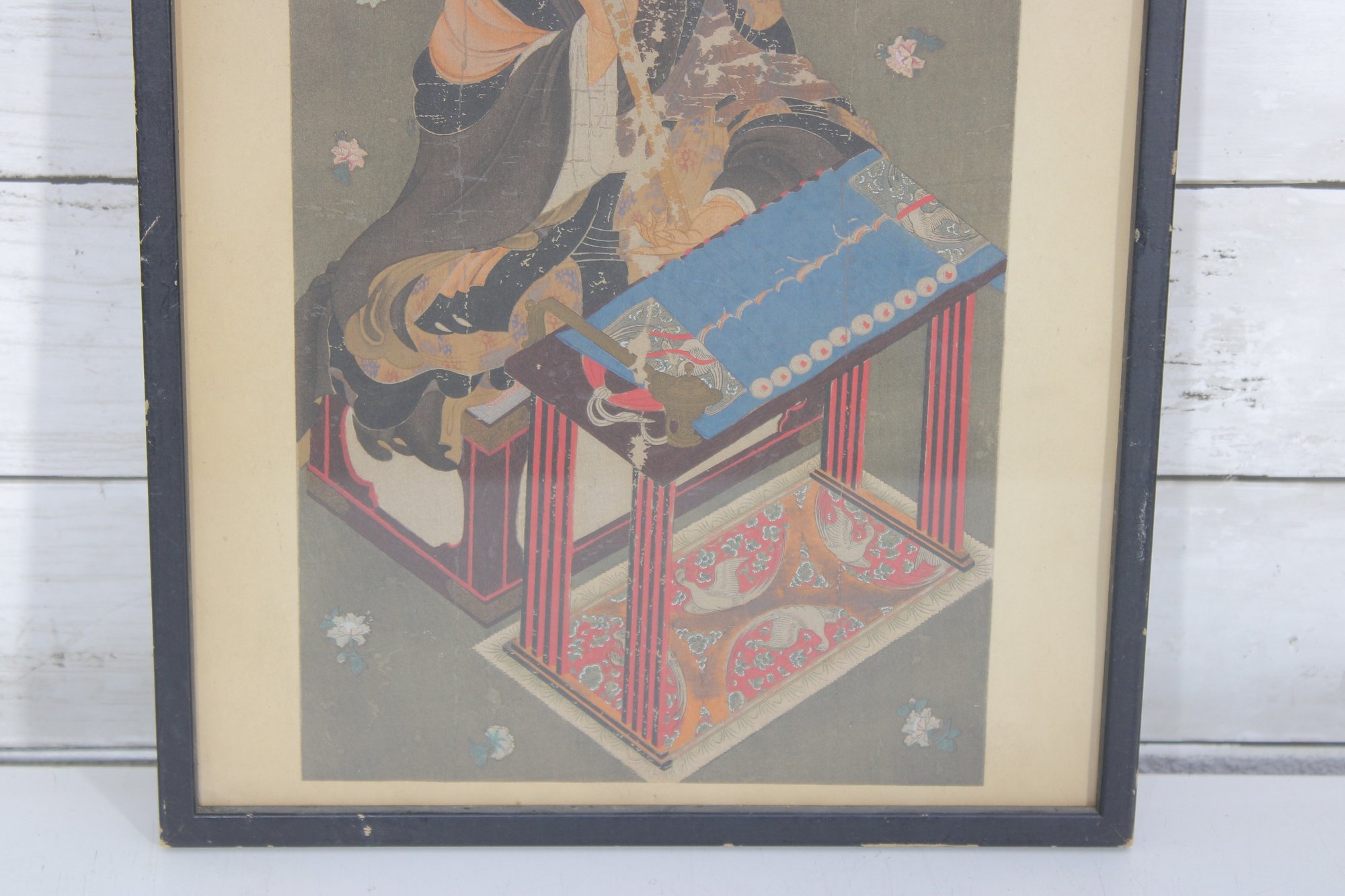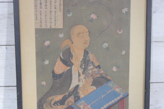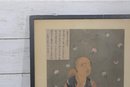 Vintage Asian-style figural artwork depicting a seated scholar or monk beside a decorative table, accented with delicate floral motifs and traditional calligraphy. The piece features soft, muted tones with refined detailing, giving it a serene and contemplative presence. Presented in a simple dark frame, this artwork makes a tasteful addition to a gallery wall, study, or traditional décor setting.