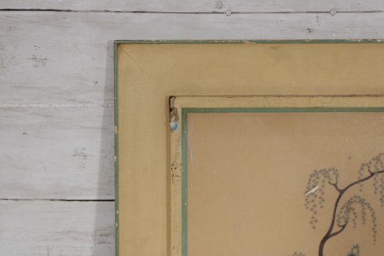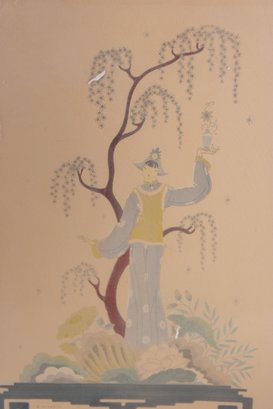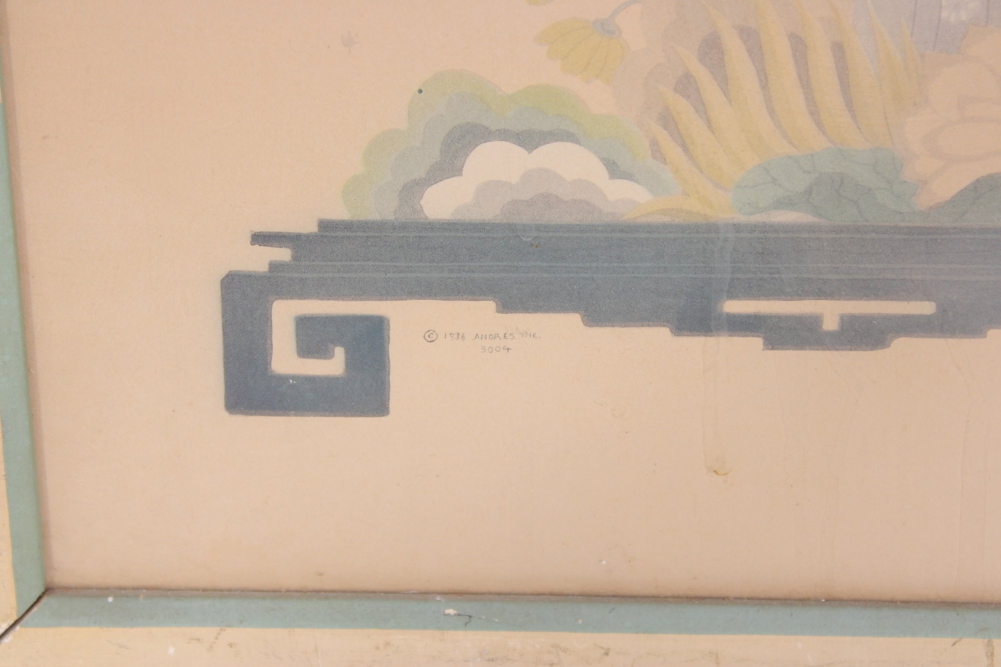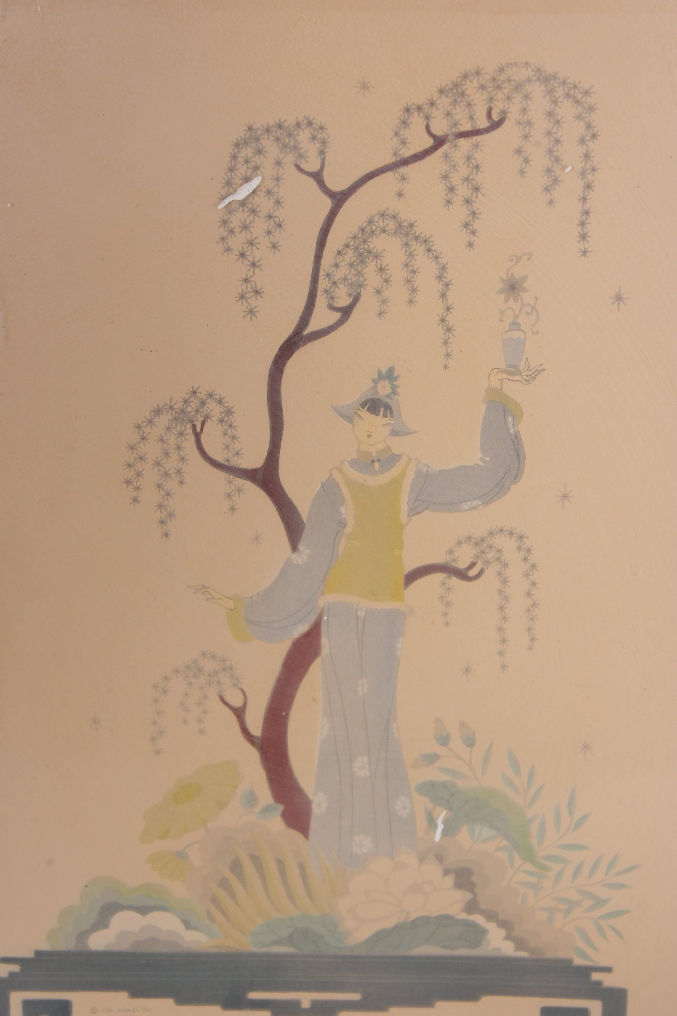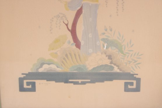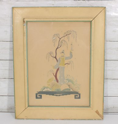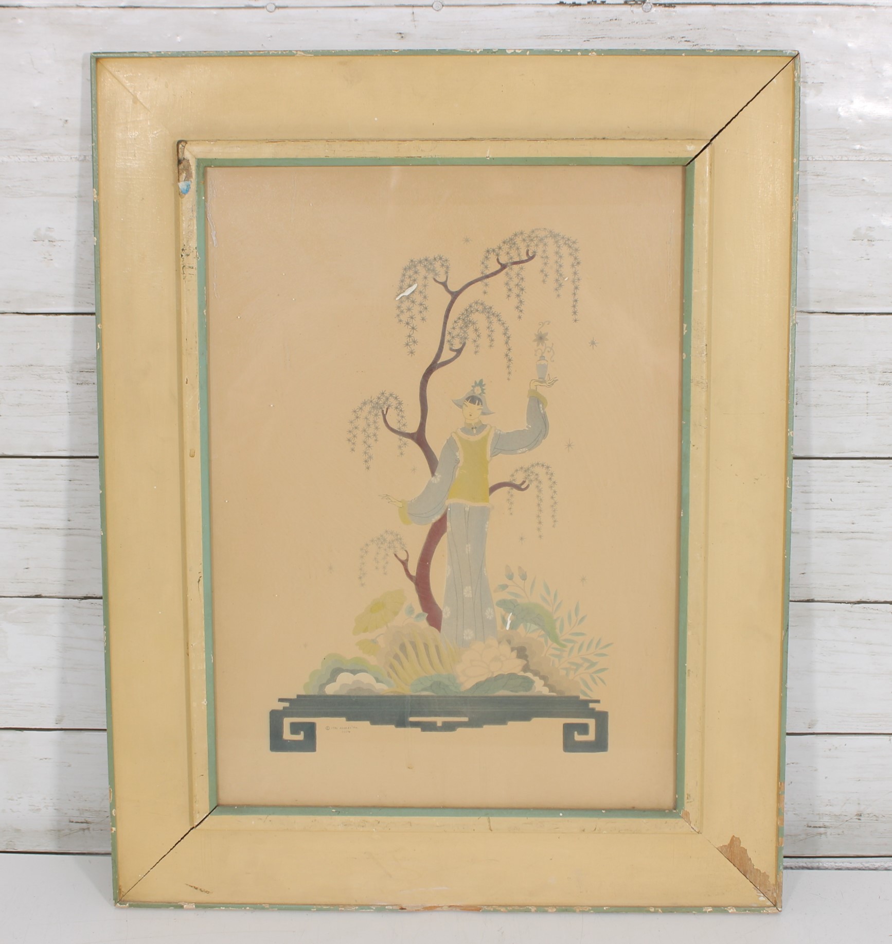 a vintage framed print featuring an elegant Asian-inspired figural scene, rendered in a soft Art Deco–influenced style.