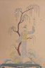 The composition depicts a graceful woman standing beneath a stylized willow tree, surrounded by decorative foliage and geometric base elements. The muted pastel palette—soft greens, blues, creams, and subtle earth tones—creates a calm and refined aesthetic.