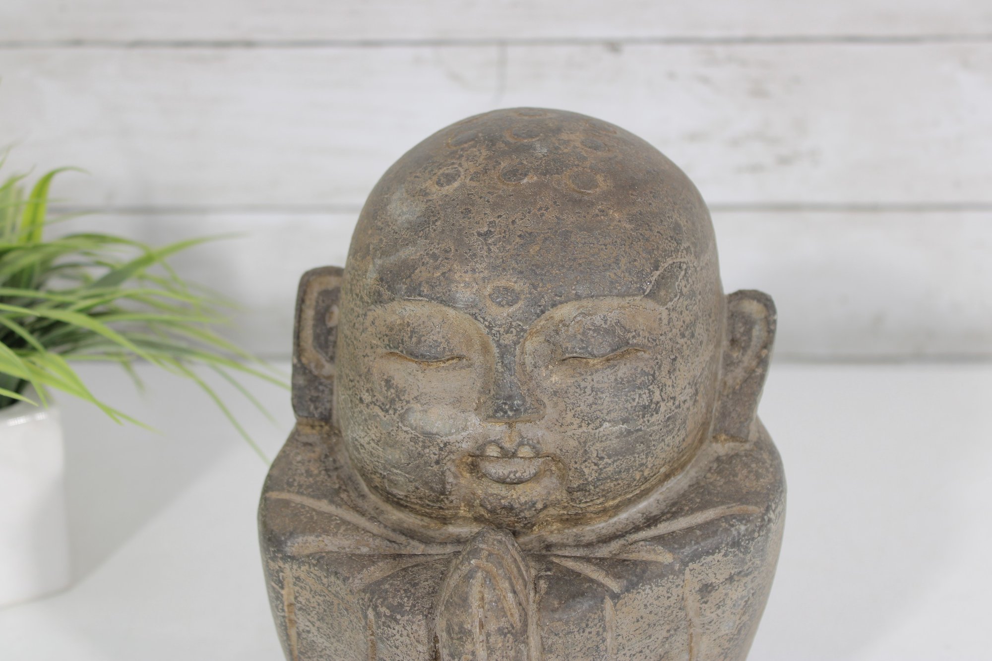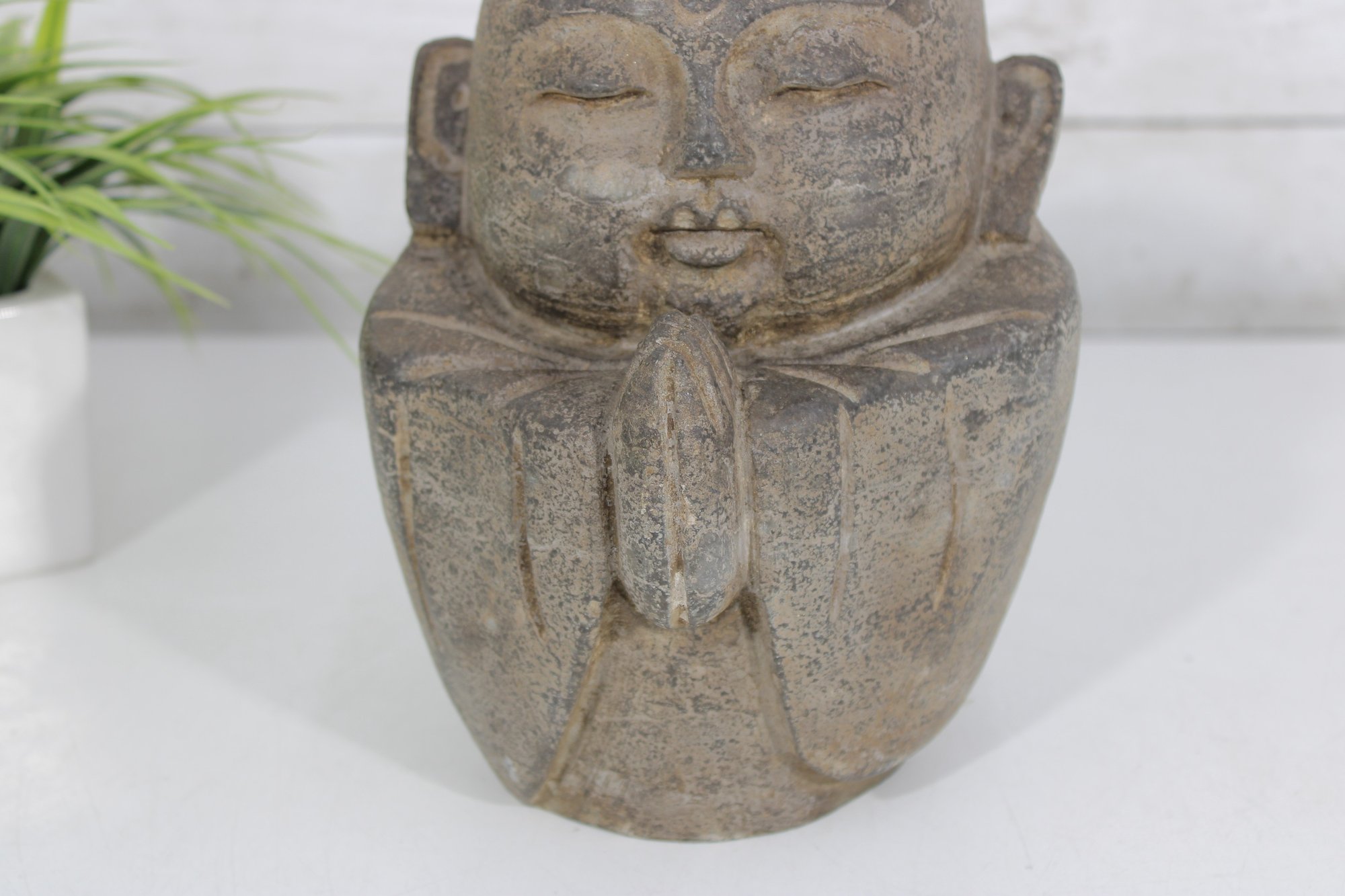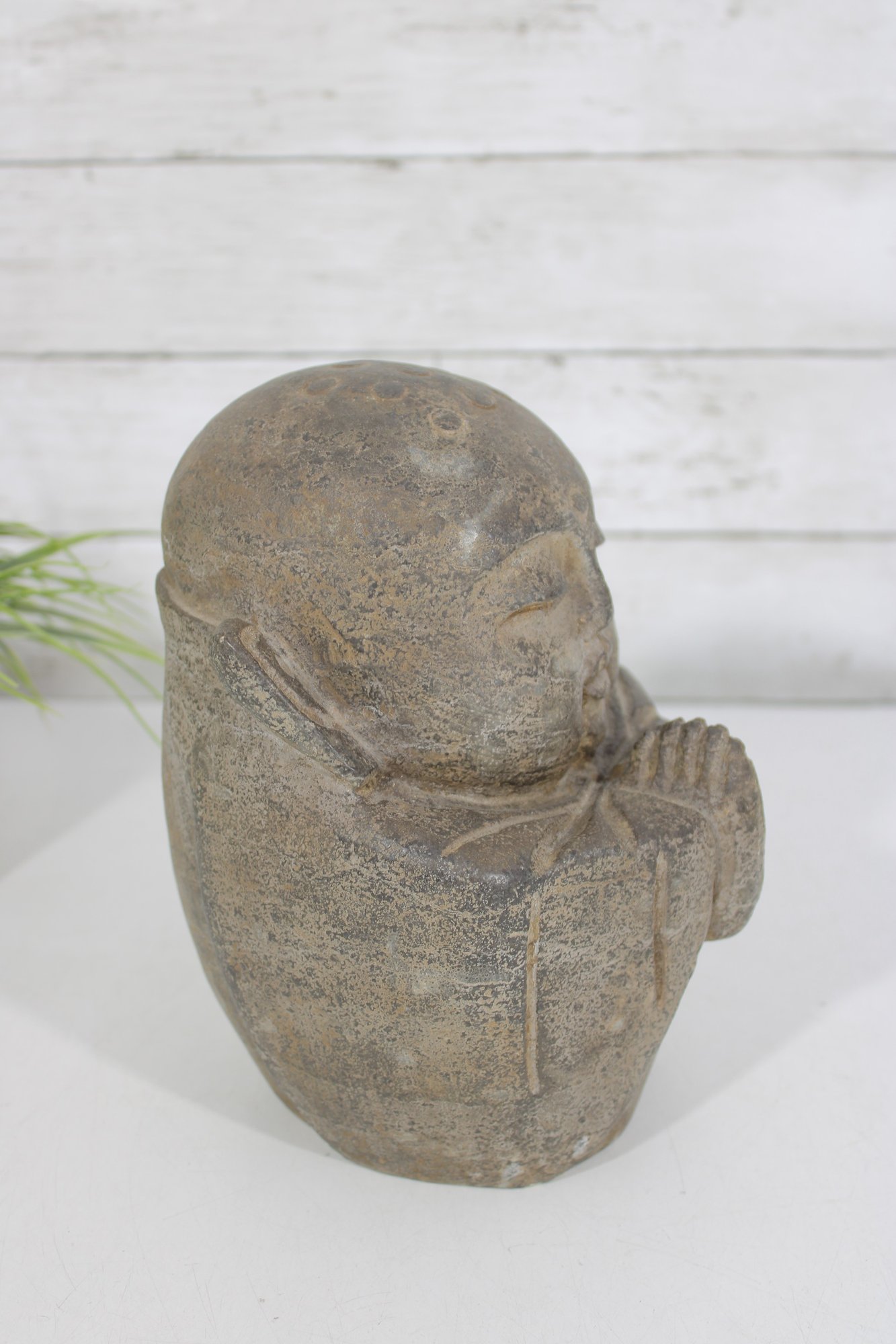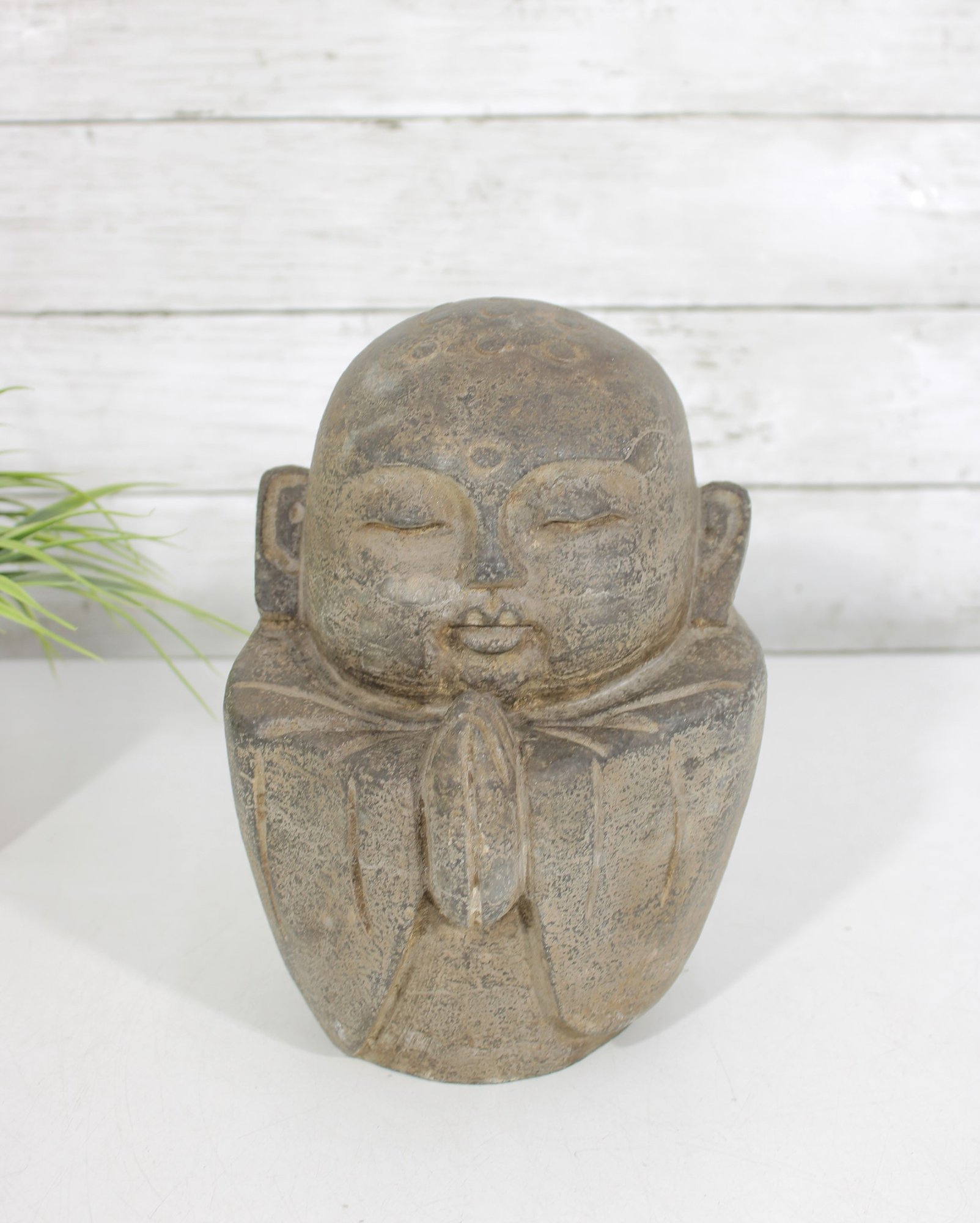 Charming vintage-style sculpture depicting a serene monk figure in a prayerful pose. The figure features closed eyes, gentle facial expression, and hands pressed together, symbolizing peace, mindfulness, and spirituality.