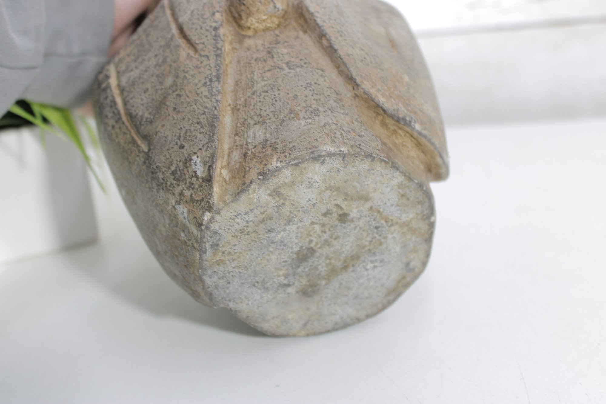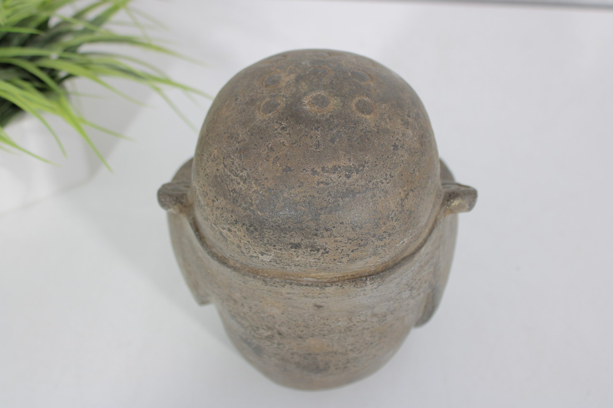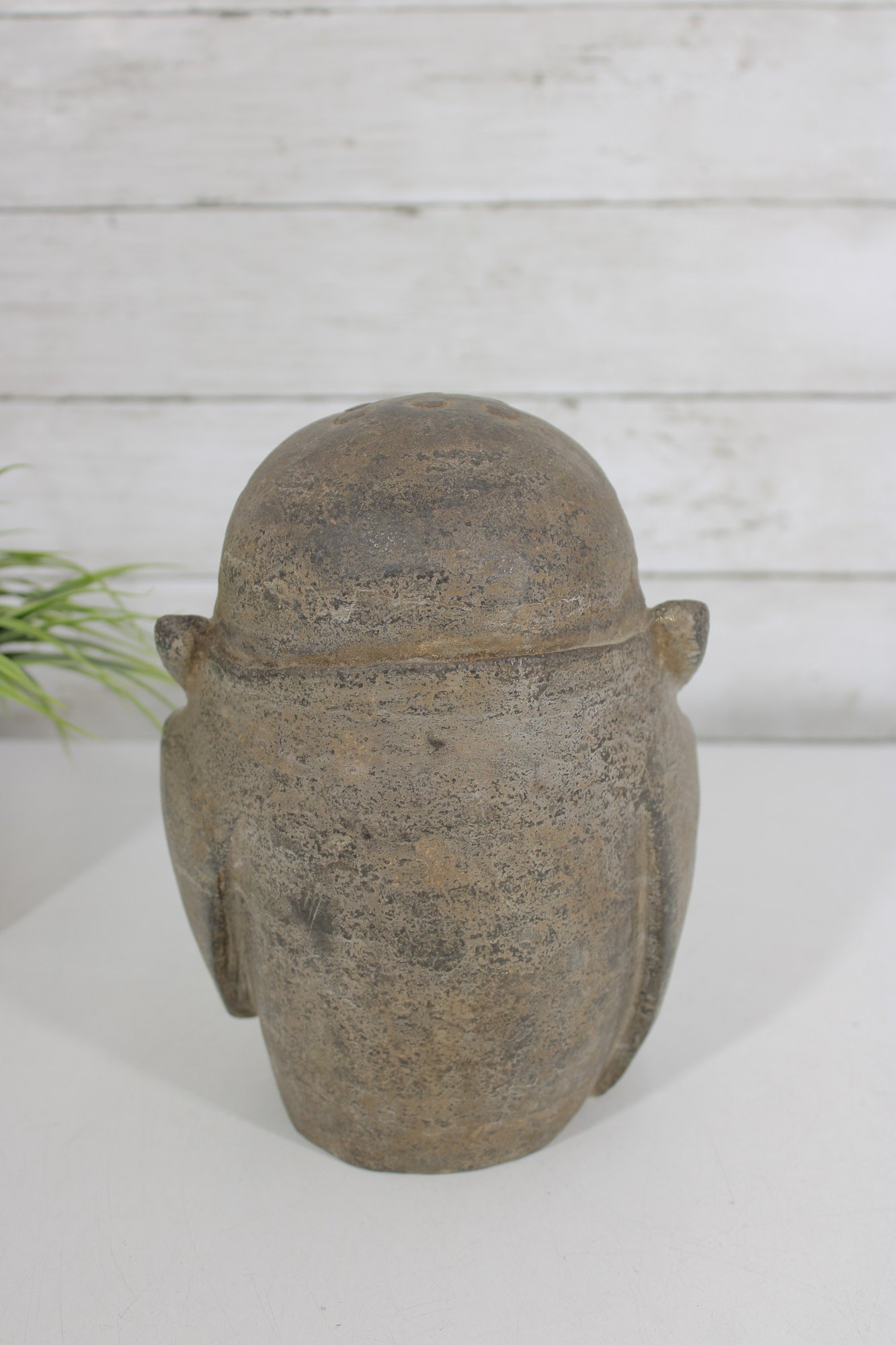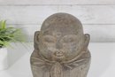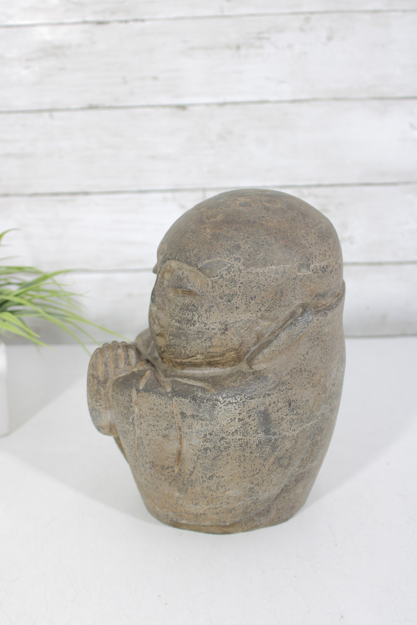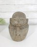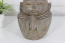 Crafted in a stone or concrete-like material with a natural textured finish, the piece has an aged patina that enhances its rustic, tranquil appeal. Its compact size makes it perfect for display on a shelf, tabletop, or as part of a meditation or garden setting.