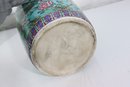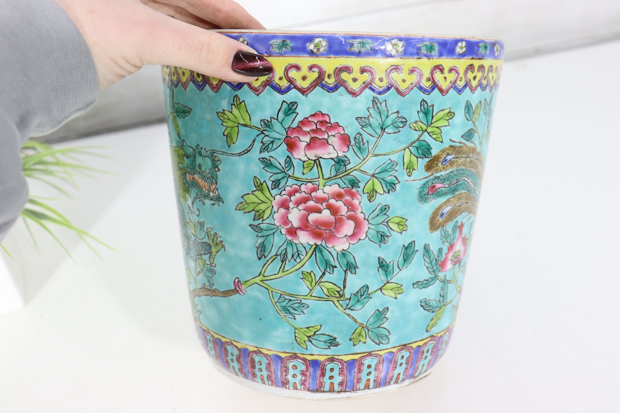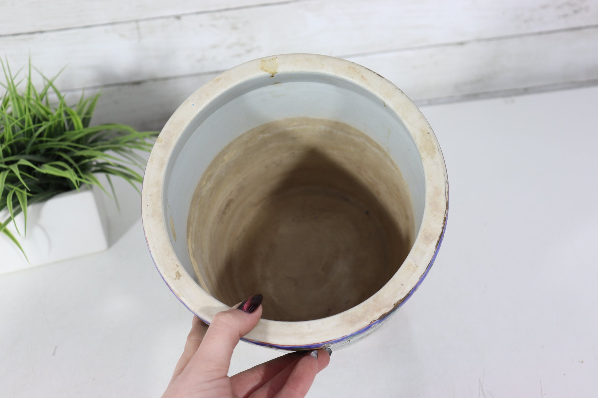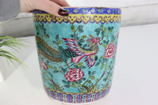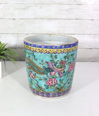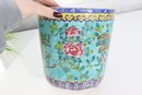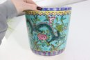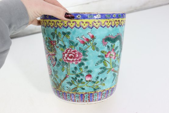 Beautiful vintage porcelain cache pot featuring a vibrant dragon and phoenix motif set against a turquoise blue background. This richly detailed piece is decorated with colorful florals, traditional borders, and intricate hand-applied style detailing, making it a striking accent for any room.