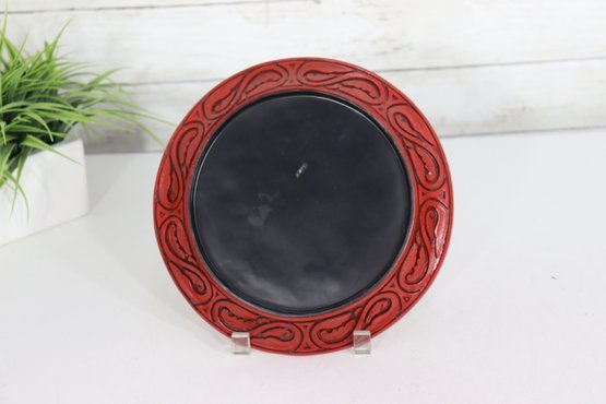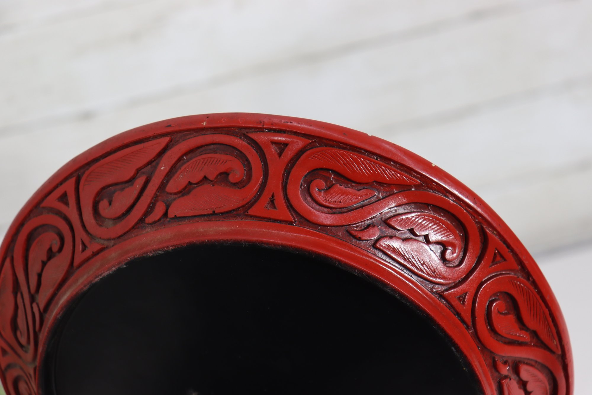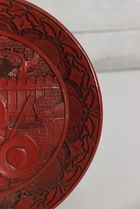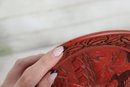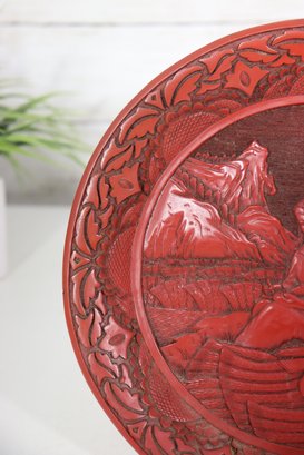 Beautiful vintage red cinnabar style carved decorative plate featuring an intricate raised scene of a seated figure in a countryside landscape with mountains, trees, baskets, and detailed surroundings. The border is deeply carved with scrolling floral / foliate pattern work that adds great depth and visual richness.