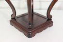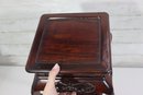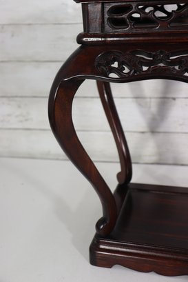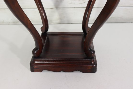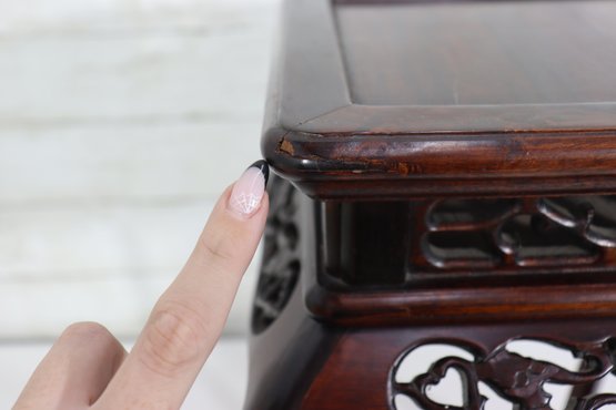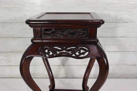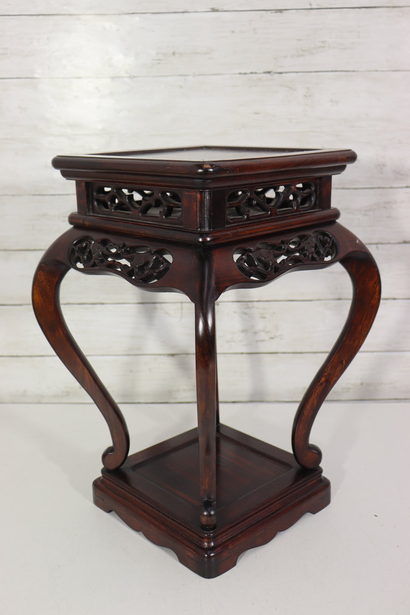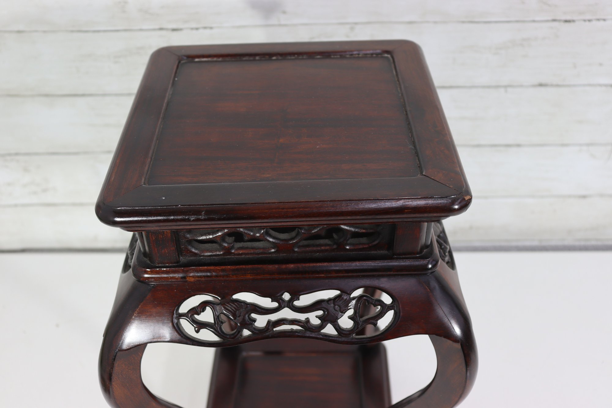 vintage carved wooden display pedestal stand with Asian / Oriental style design. Beautiful rich dark wood finish with ornate openwork carving around the top and sides and gracefully curved legs. This piece is perfect for displaying a vase, statue, sculpture, plant, porcelain, bronze figure or decorative collectible.