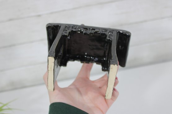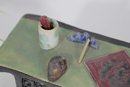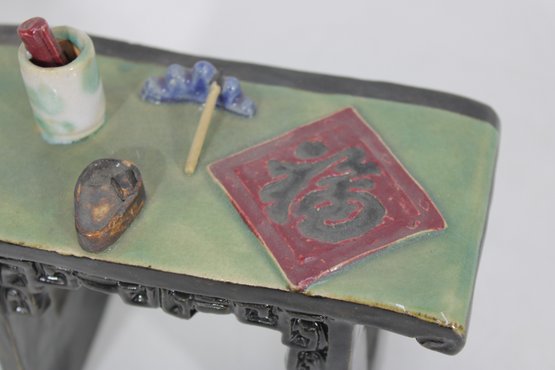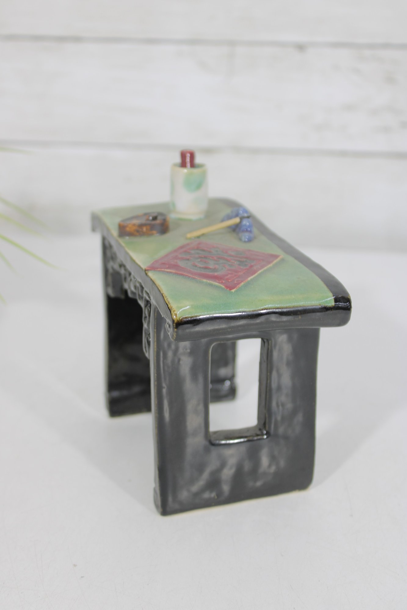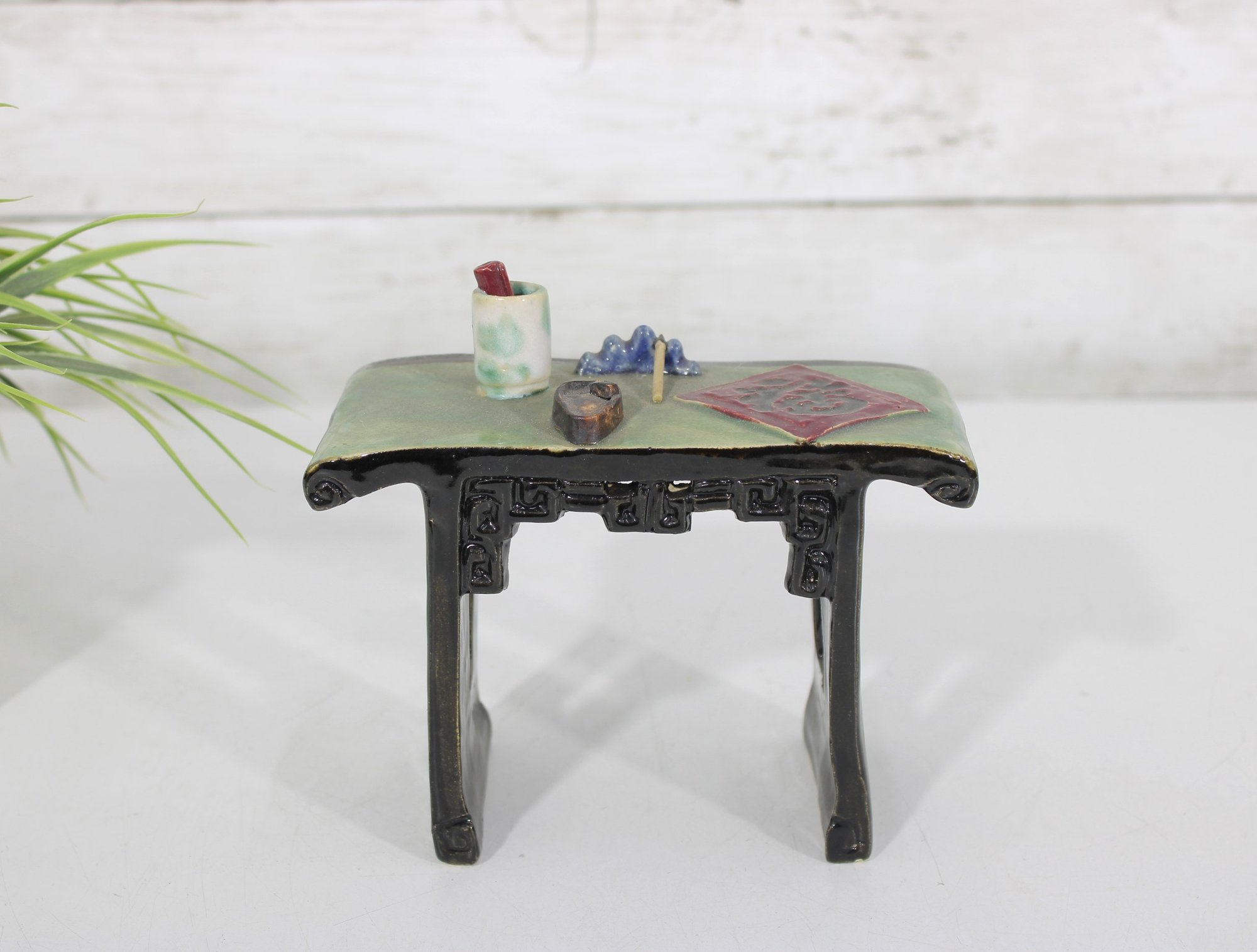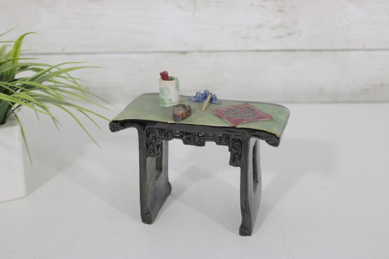 a vintage Asian-style decorative figurine depicting a traditional scholar’s desk, measuring approximately 4.5 inches high, 6 inches wide, and 3 inches deep.