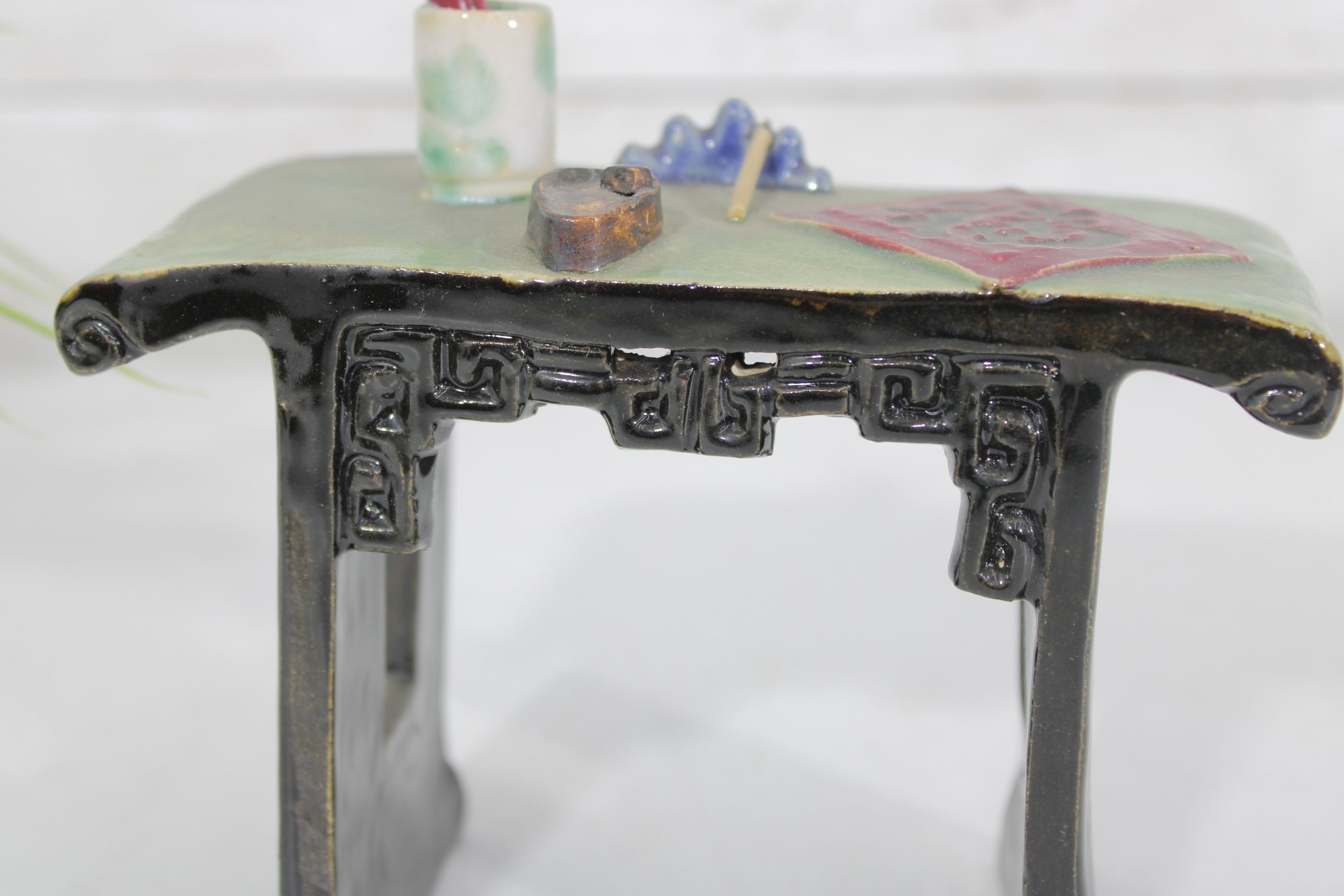 The piece features a miniature table with detailed carved-style legs and a colorful tabletop scene. The top is decorated with calligraphy-themed items, including a brush, ink stone, writing paper with Chinese characters, and a small brush holder. The sculpted details and painted accents give the piece a charming scholar’s studio motif reminiscent of traditional Chinese writing tables.