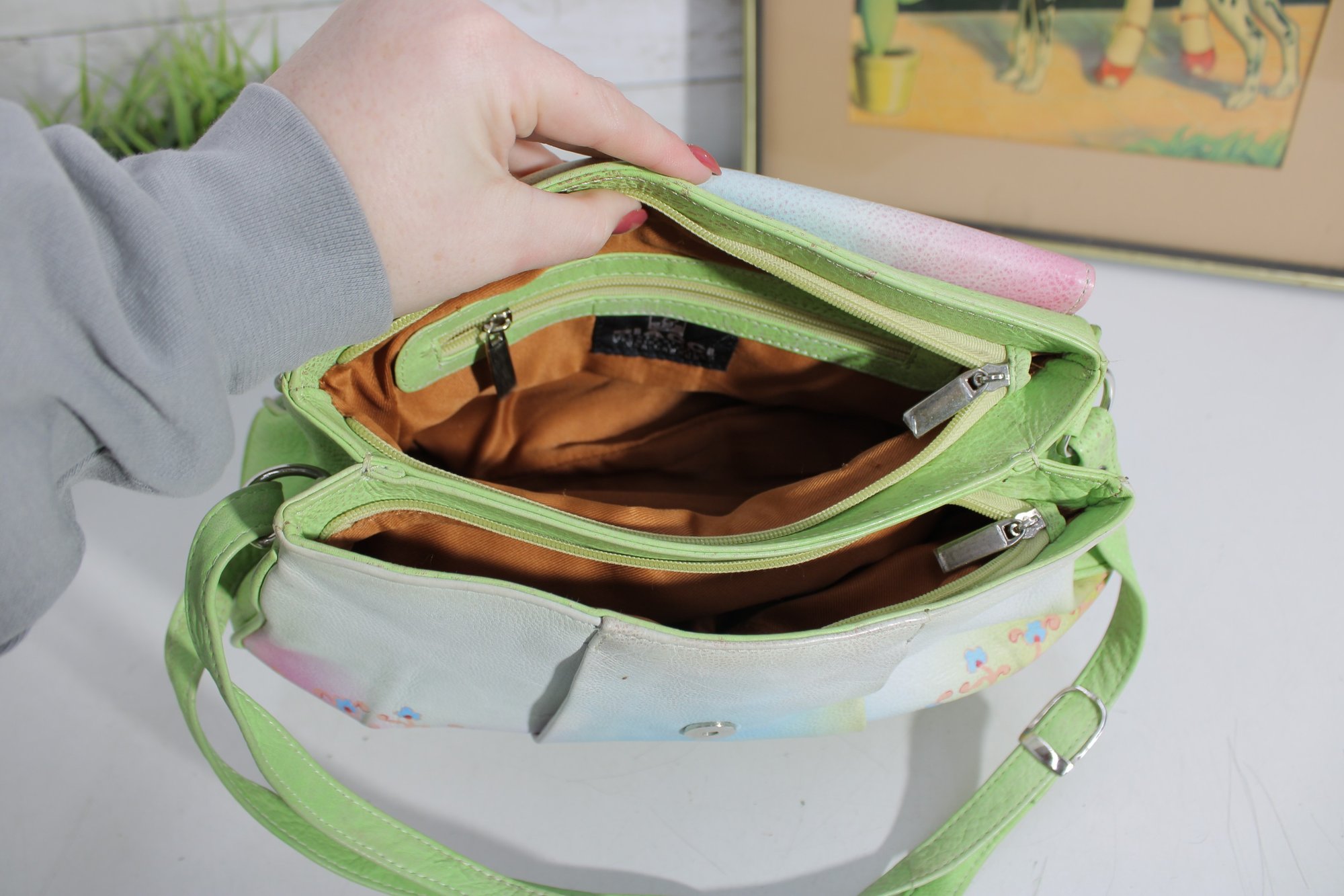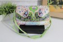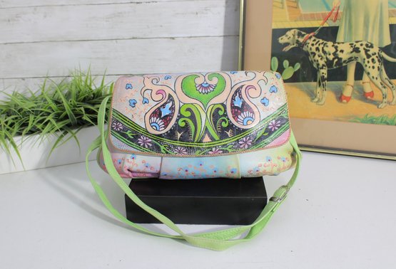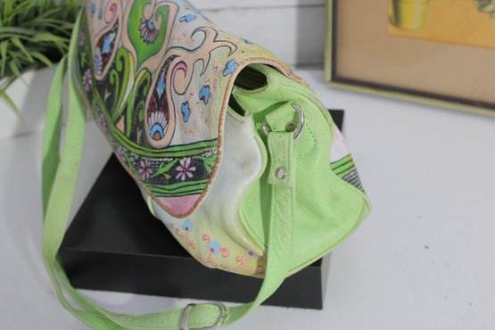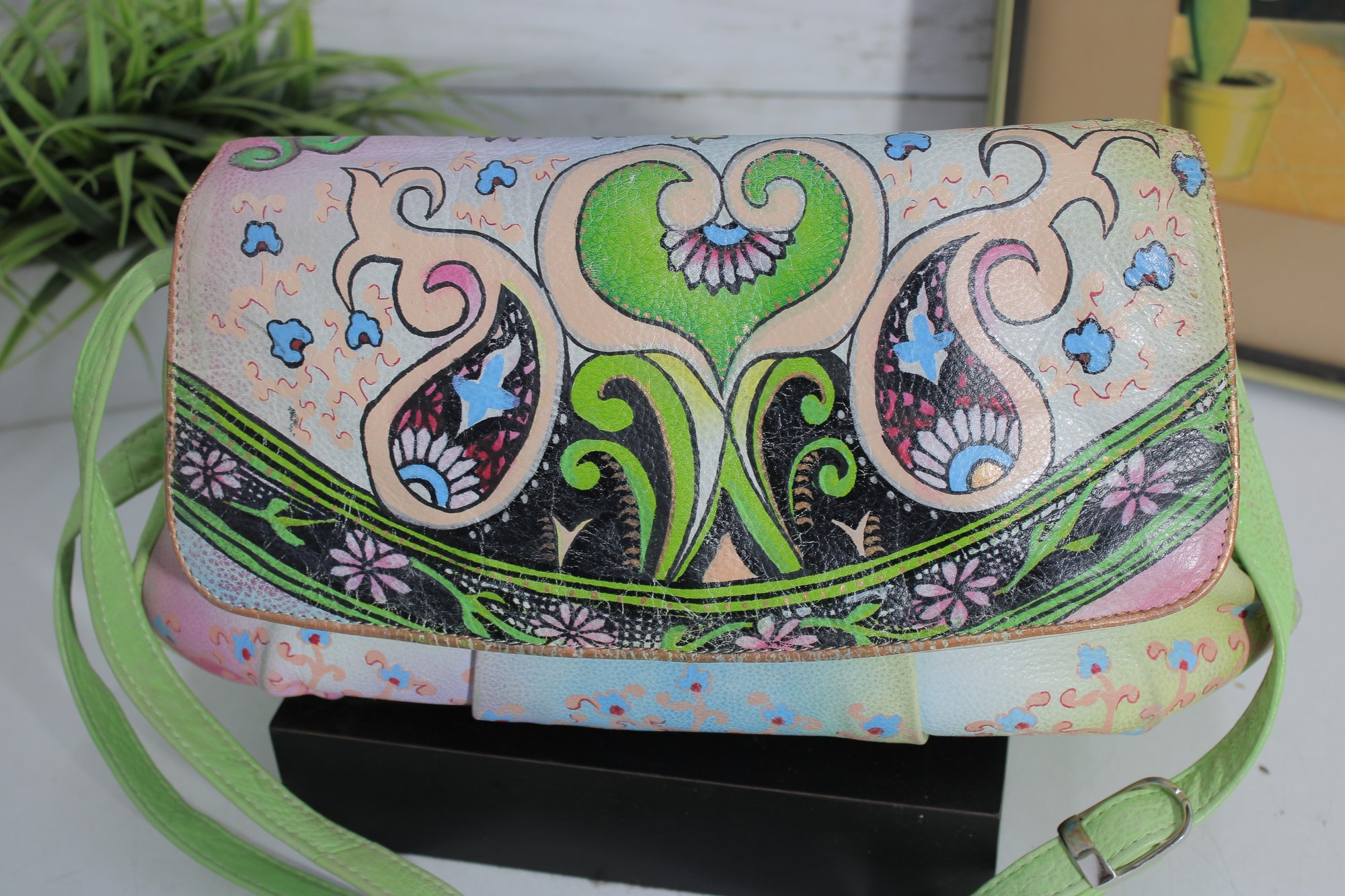 Charming vintage crossbody bag by Baci featuring a vibrant paisley and floral design in soft pastel tones with bold green accents. This eye-catching purse blends retro flair with everyday practicality, making it a fun statement piece for casual wear or festival styling.