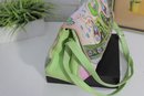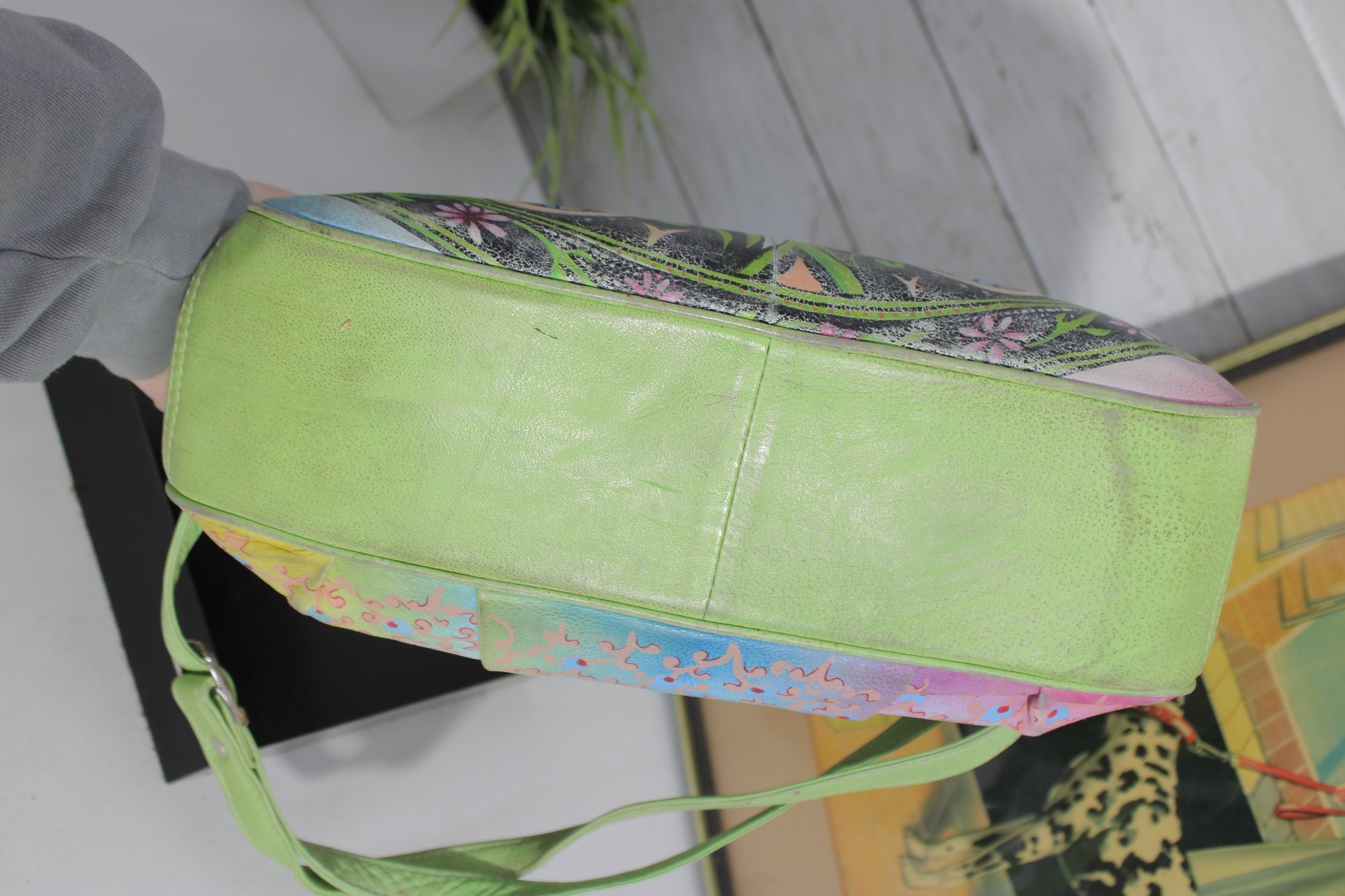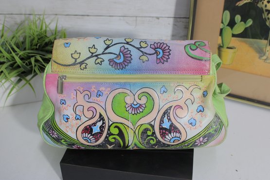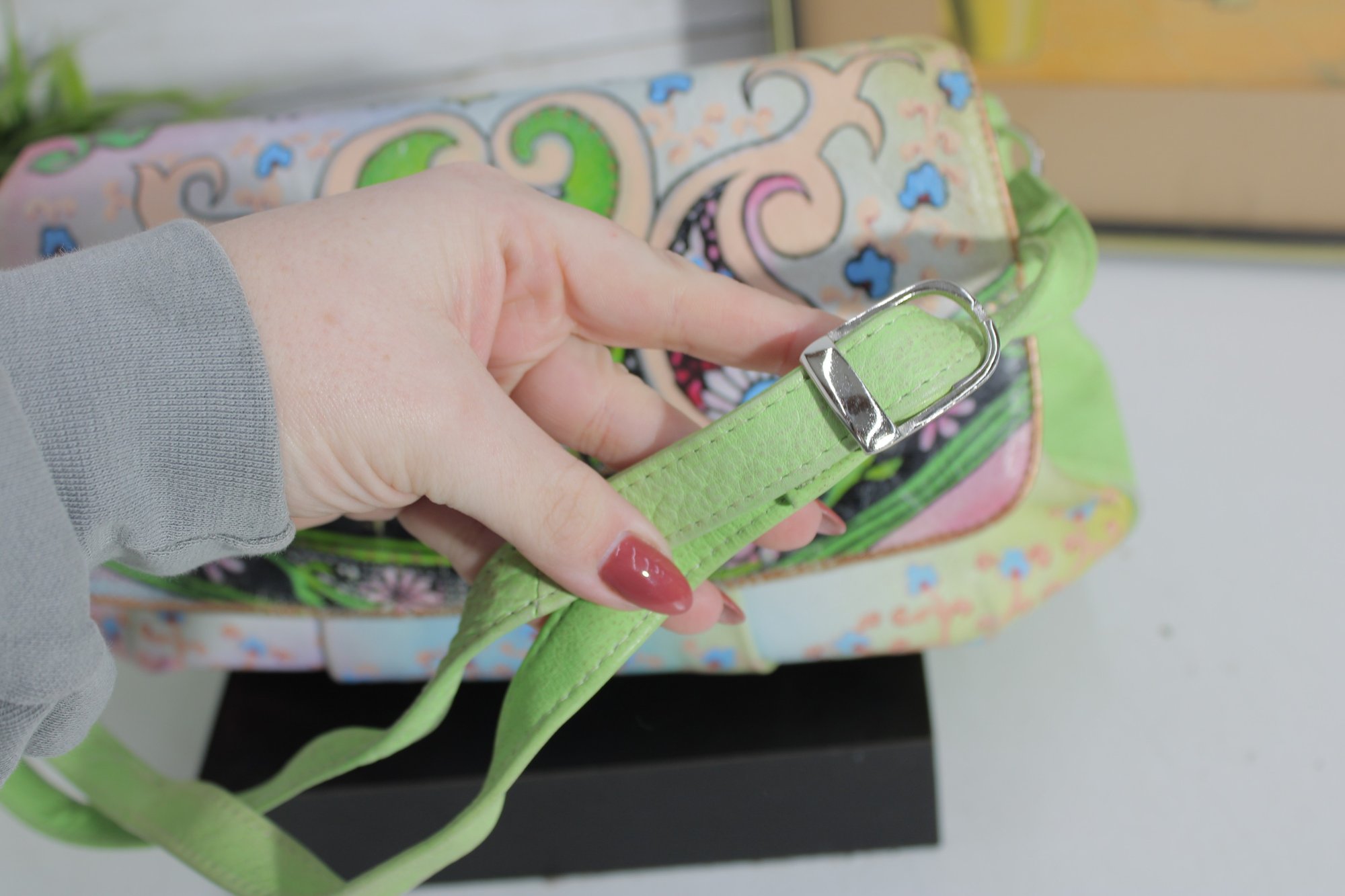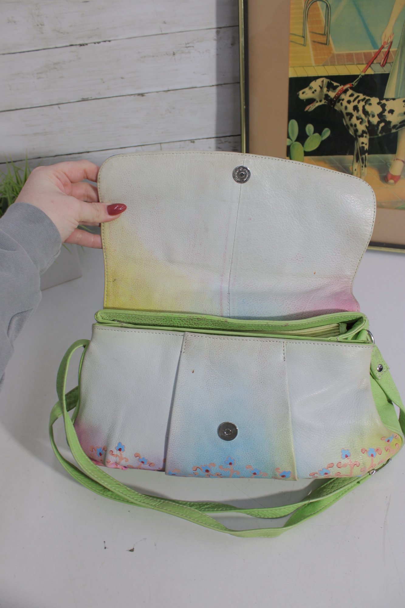 Charming vintage crossbody bag by Baci featuring a vibrant paisley and floral design in soft pastel tones with bold green accents. This eye-catching purse blends retro flair with everyday practicality, making it a fun statement piece for casual wear or festival styling.