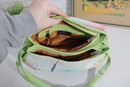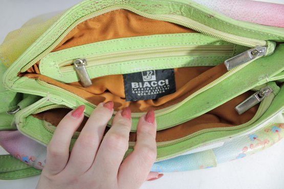 The bag includes an adjustable green shoulder strap and a thoughtfully designed interior with multiple zip compartments for easy organization. Inside is fully lined and labeled “Baci,” offering space for your phone, wallet, keys, and daily essentials while keeping everything neatly separated.