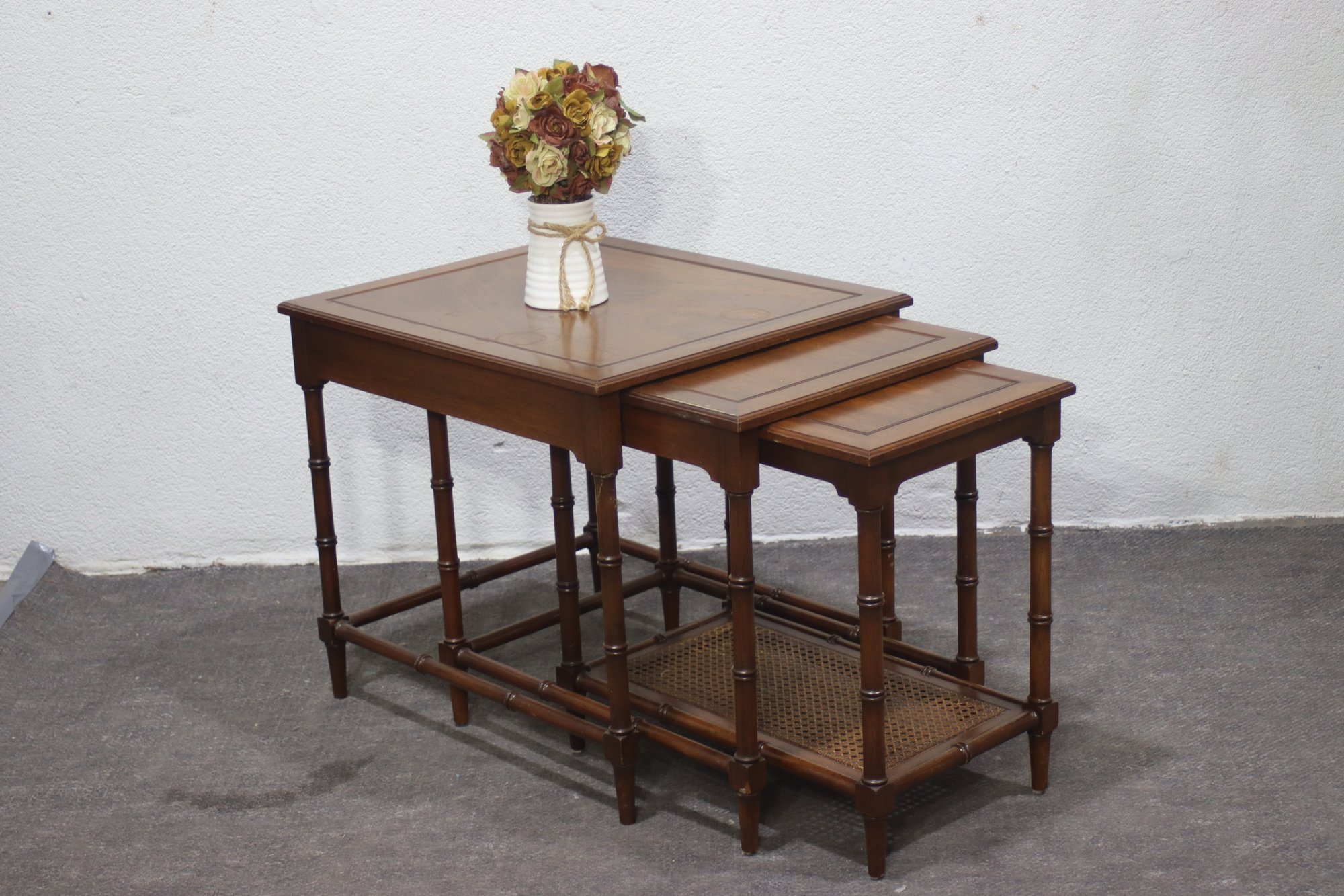 vintage set of three nesting tables features a stunning faux bamboo design with cane accents, offering both functionality and timeless elegance. The tables are designed to neatly stack under one another, making them ideal for space-saving solutions while maintaining a chic, classic aesthetic.