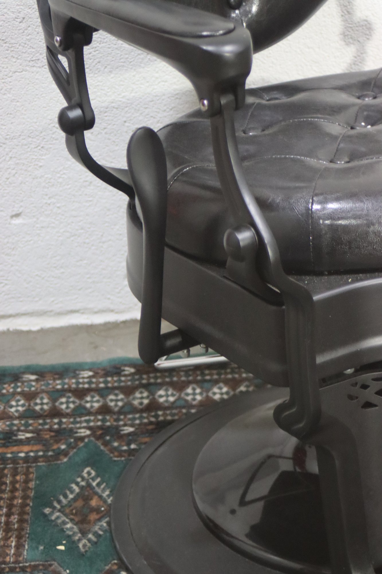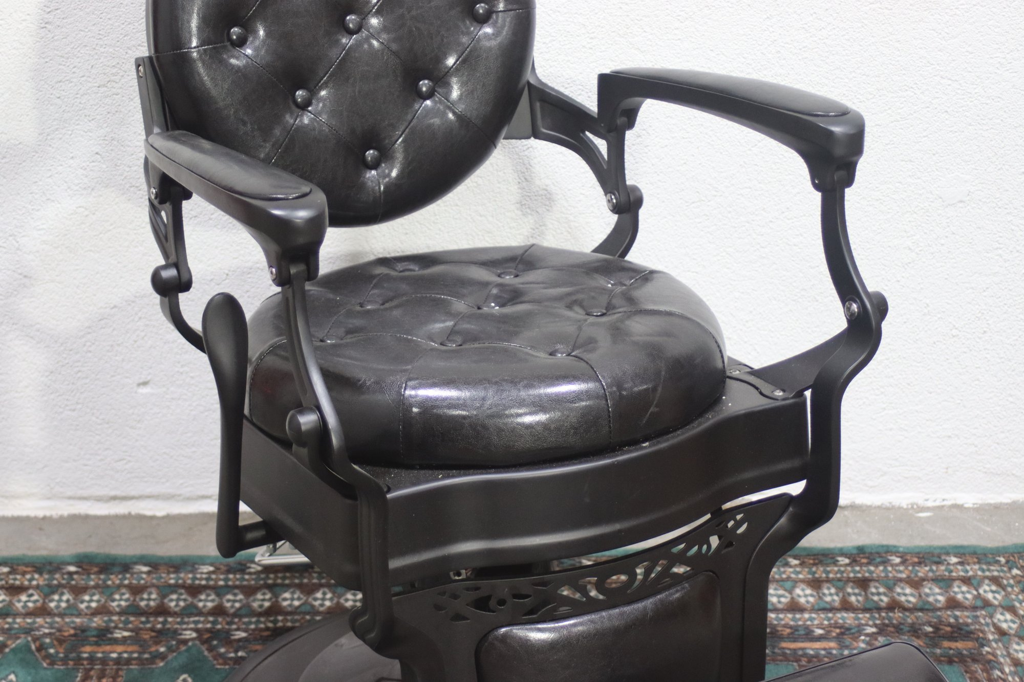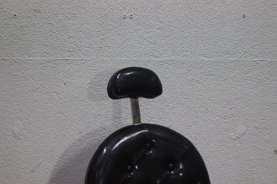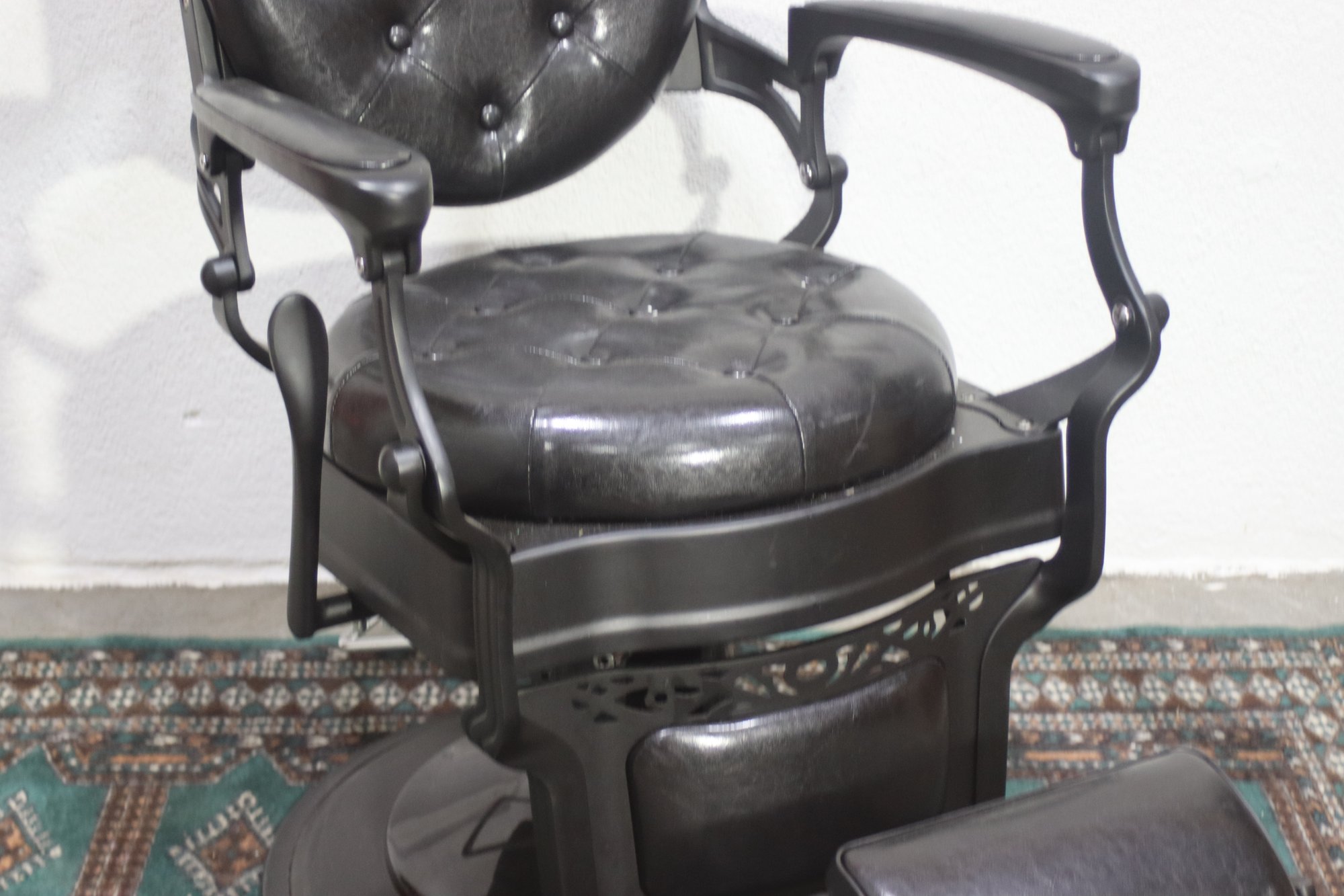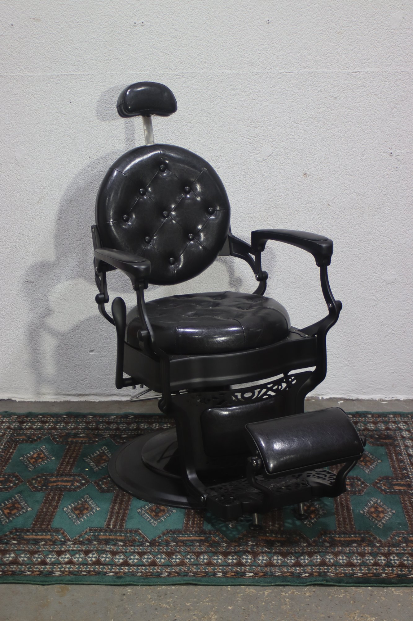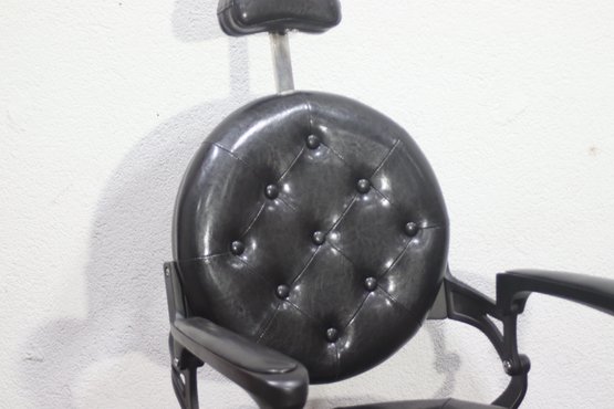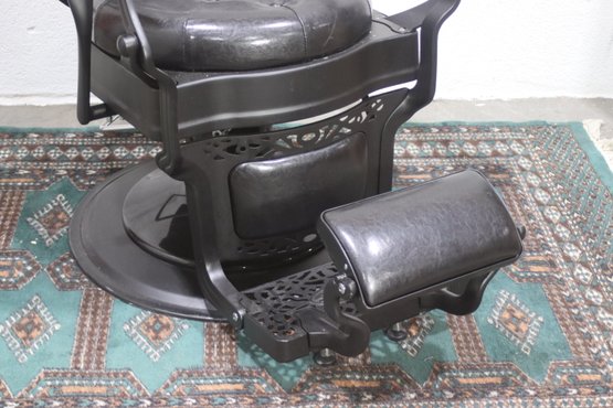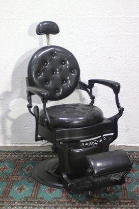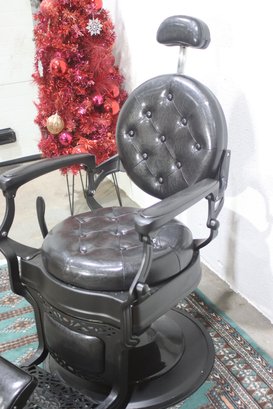 This striking vintage barber chair is a masterpiece of functionality and design, featuring a sturdy cast iron frame and luxurious black tufted leather upholstery. The chair is equipped with a reclining backrest, adjustable headrest, and a pivoting footrest, all showcasing exceptional craftsmanship and attention to detail.