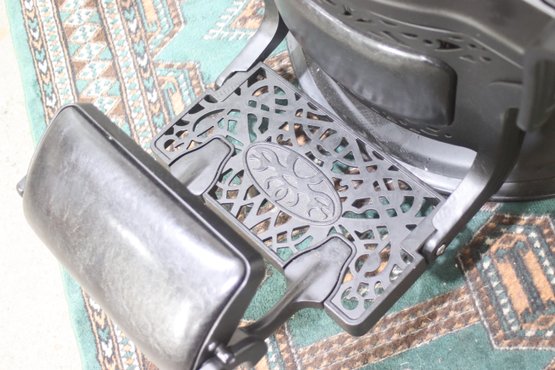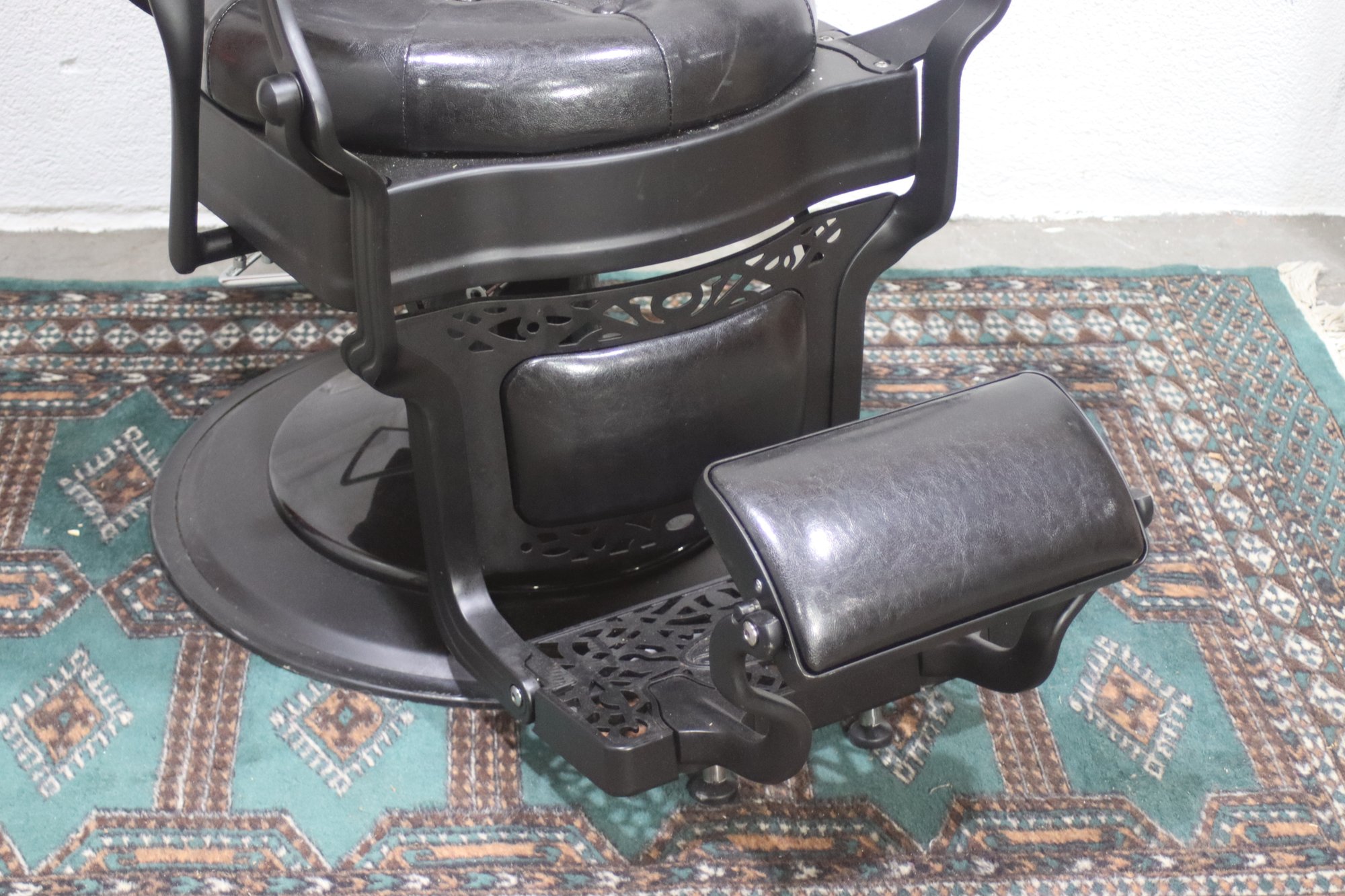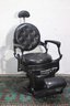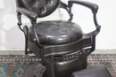 The ornate cast iron base and footplate are beautifully detailed, adding a sense of elegance to its robust construction. This chair is not only a functional piece of history but also a decorative statement for any barbershop, salon, or vintage-inspired space.