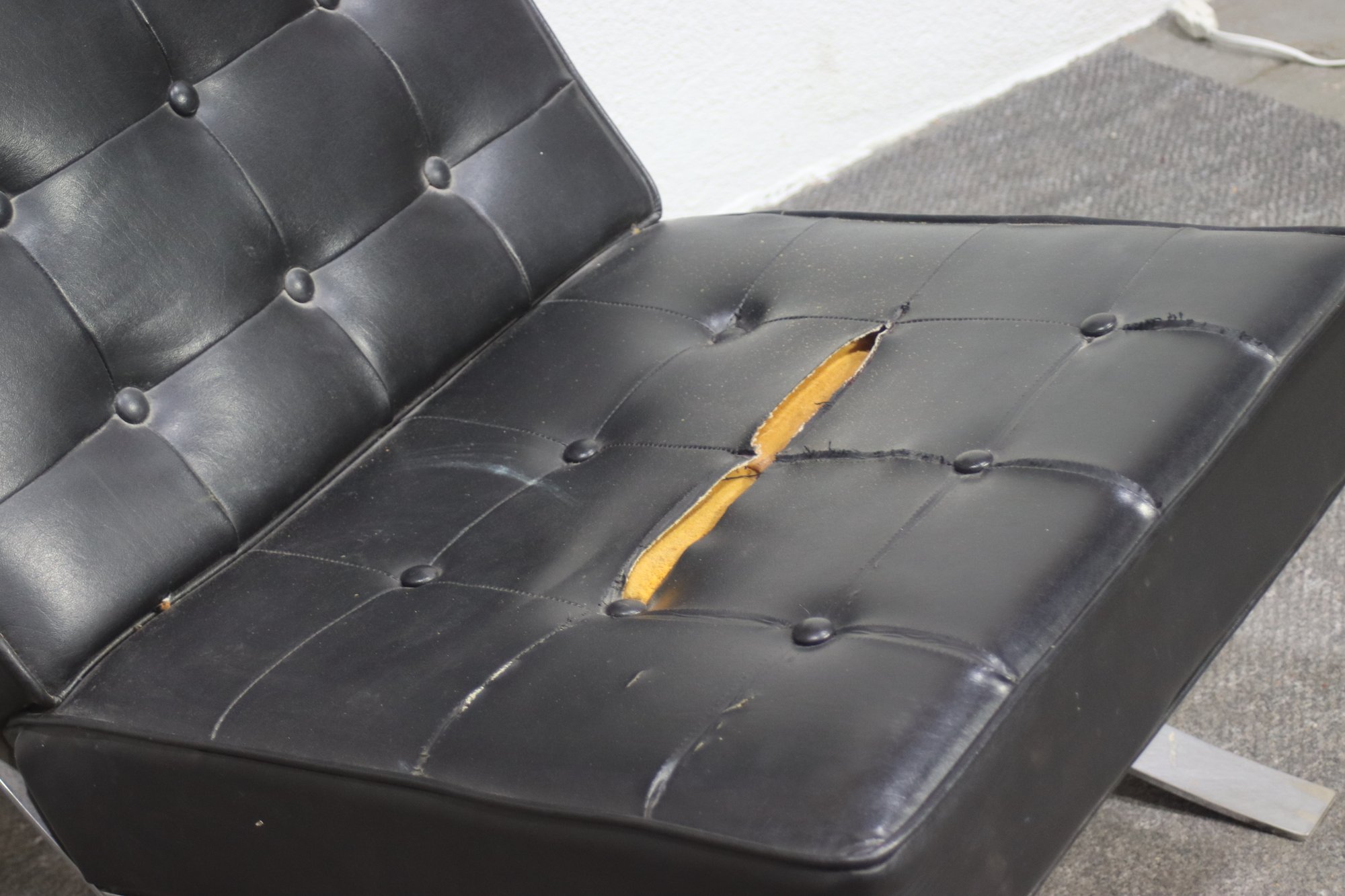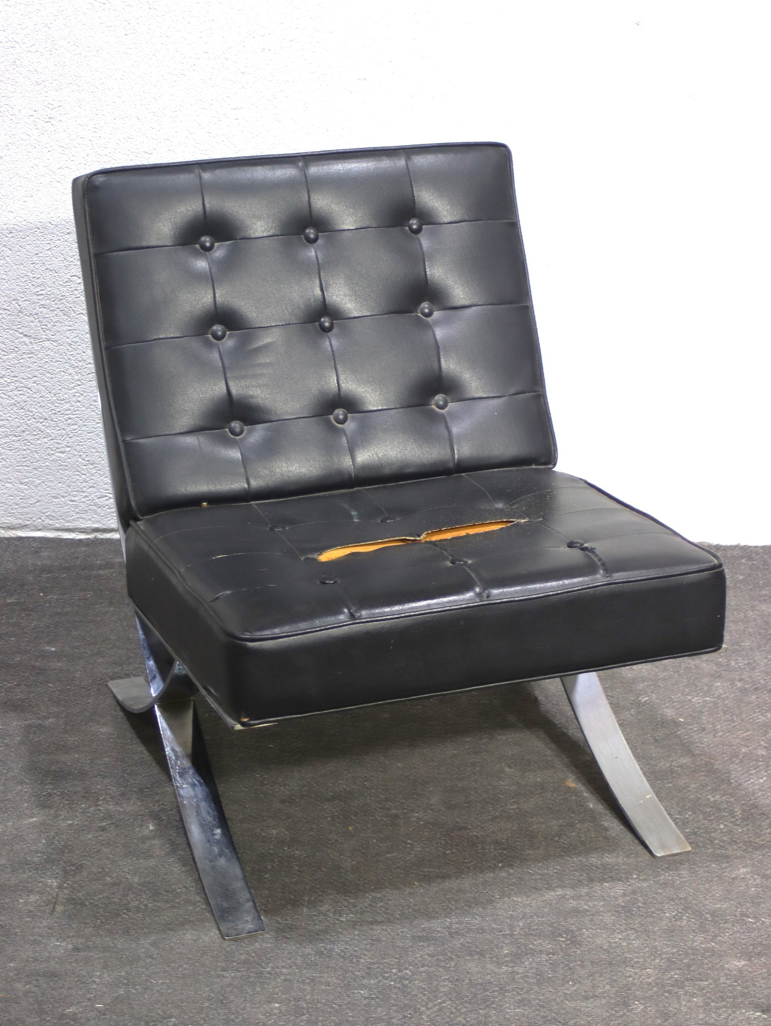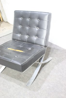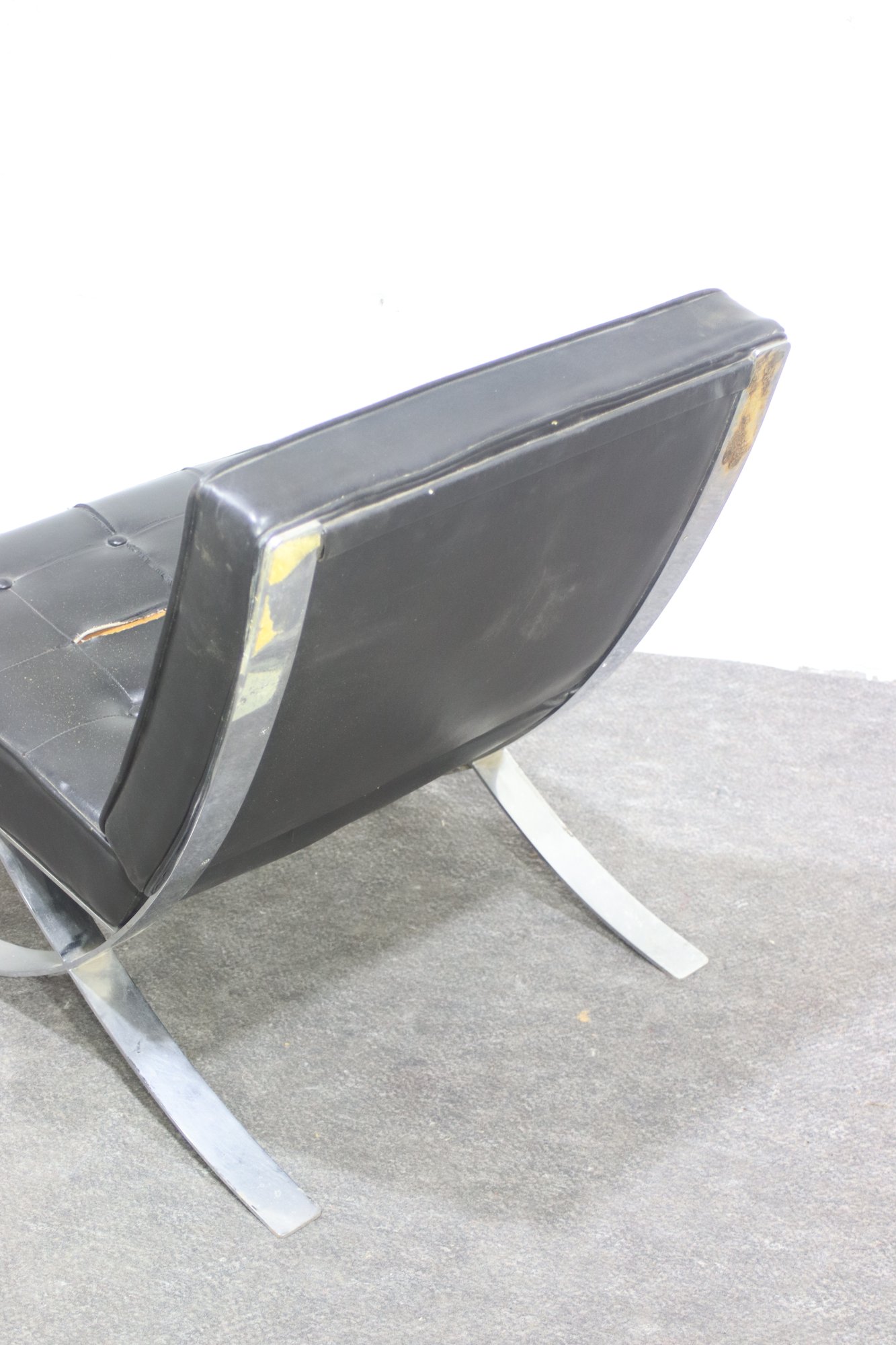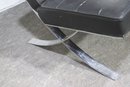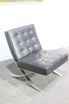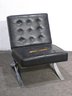 this iconic Barcelona-style lounge chair, featuring a sleek chrome frame and black tufted leather upholstery. Inspired by the timeless modernist design, this chair is perfect for adding a sophisticated touch to any living room, office, or lounge area.