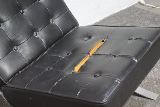 This chair is in vintage condition with visible wear. The seat upholstery has a tear, exposing the inner material (as shown in photos), and the chrome frame shows signs of oxidation and patina. It can be enjoyed as-is for a raw, industrial look or restored for a pristine finish.