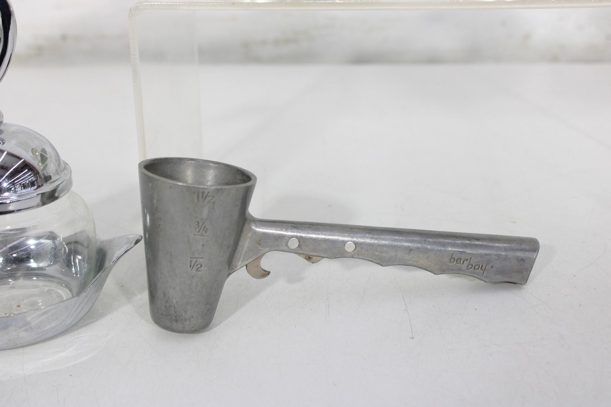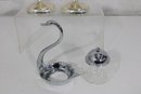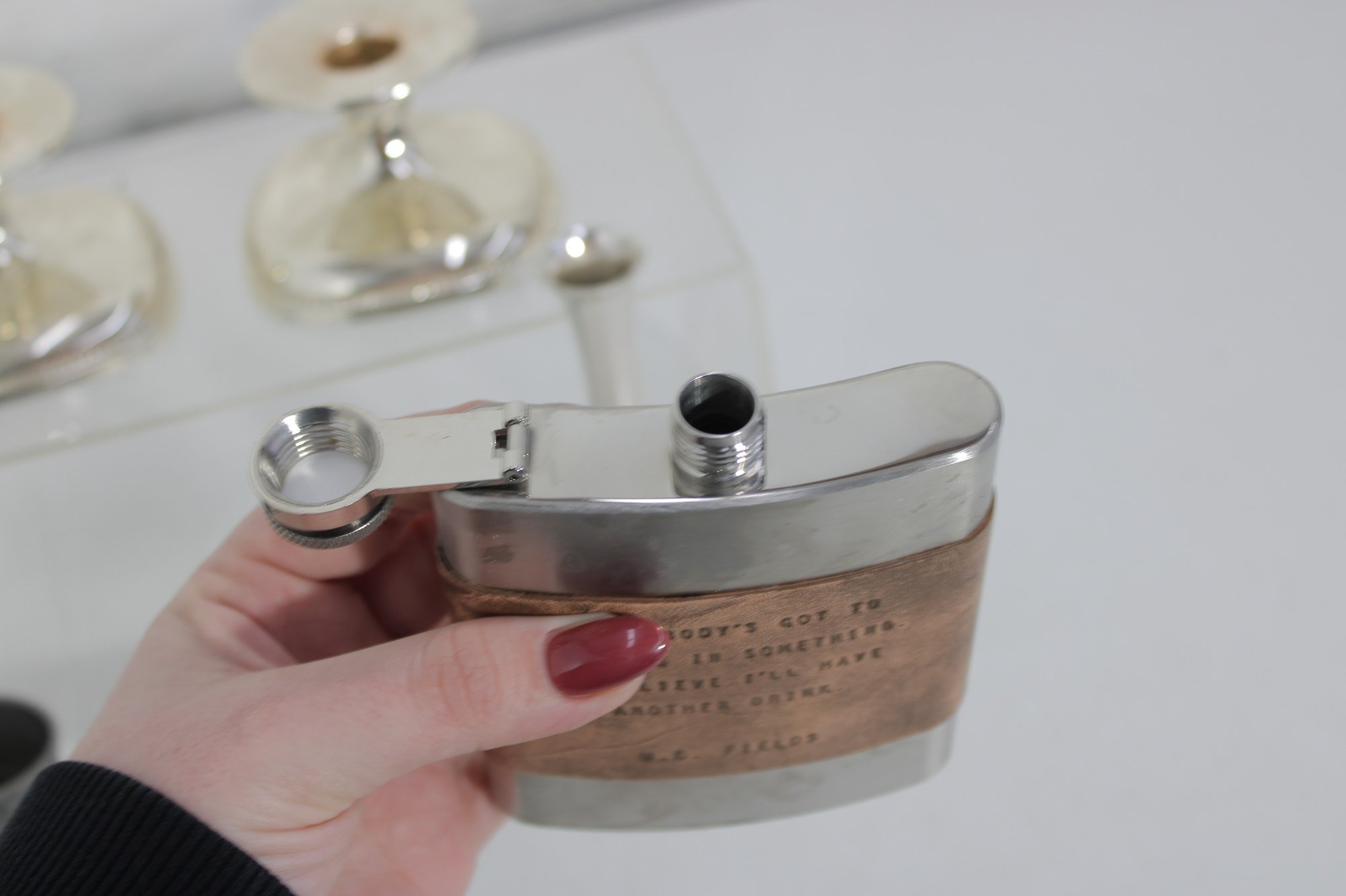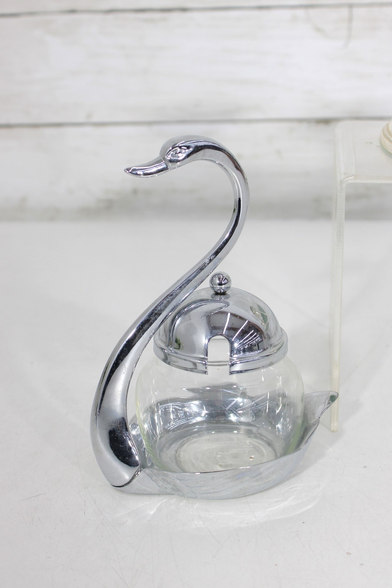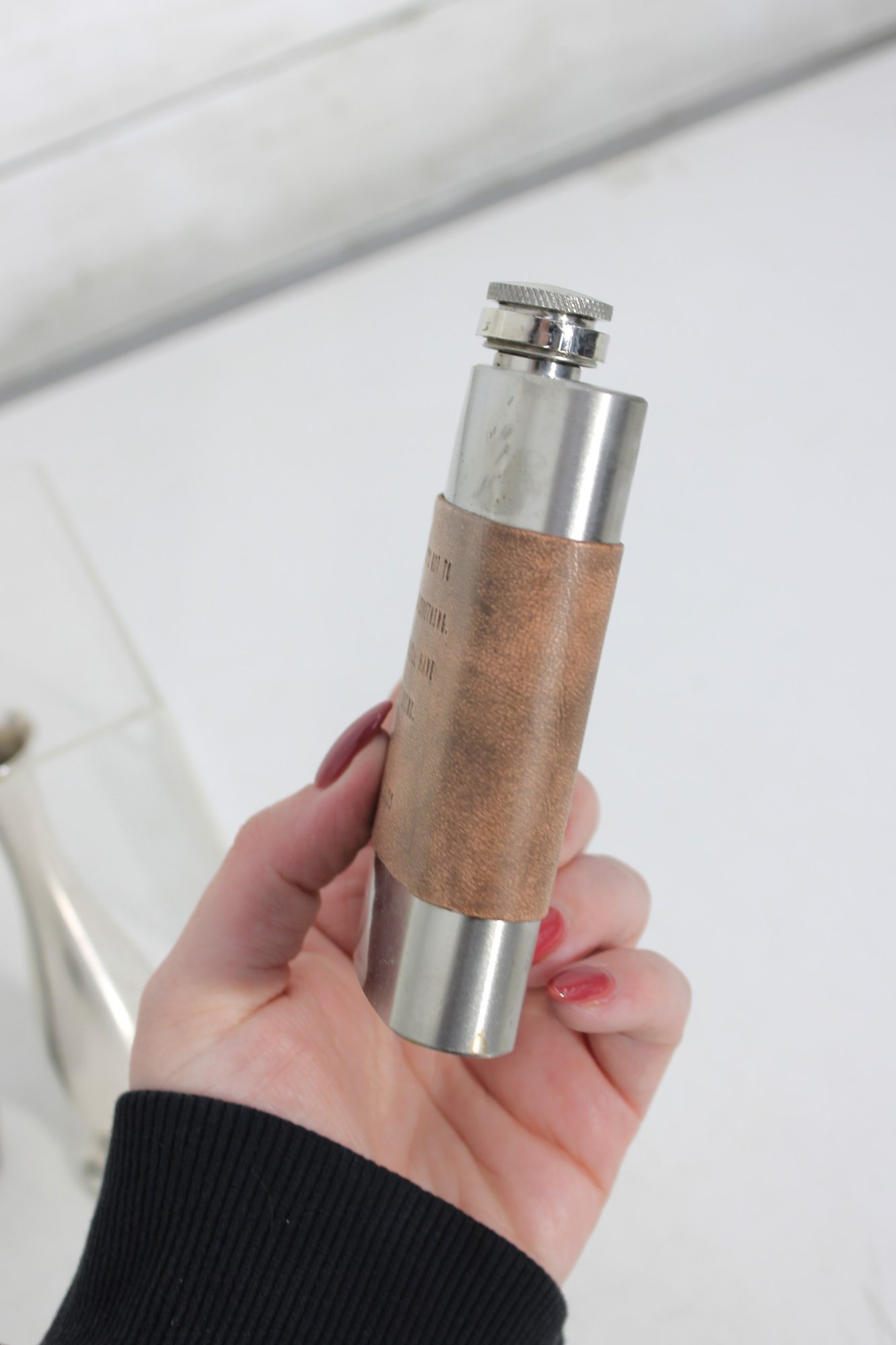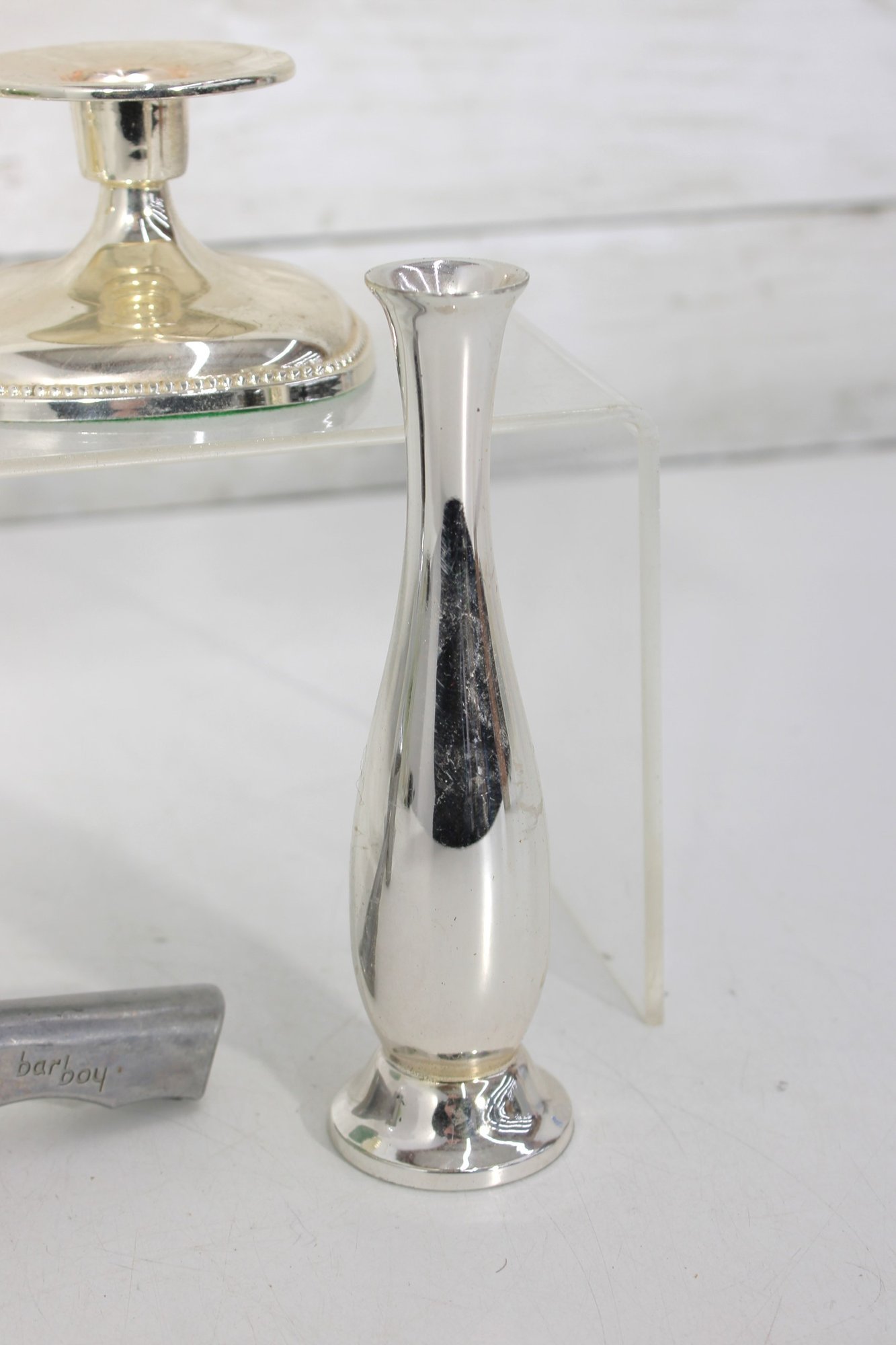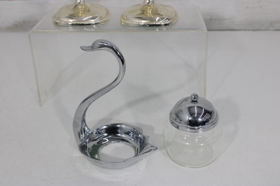 Assorted vintage barware and silverplate decorative mix lot featuring a variety of unique pieces. This eclectic group includes a metal flask with engraved plaque, pair of candlesticks, swan-shaped dish with lidded jar, small flared vase, metal shot cup with corkscrew-style handle, and additional bar or serving accessories.
