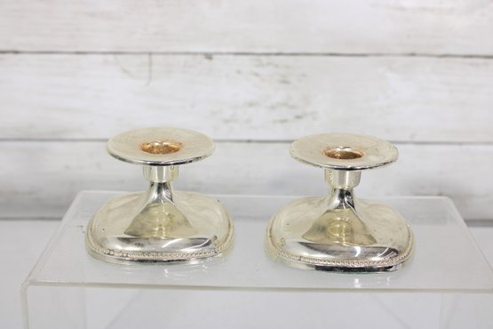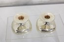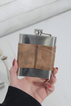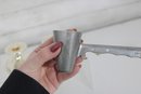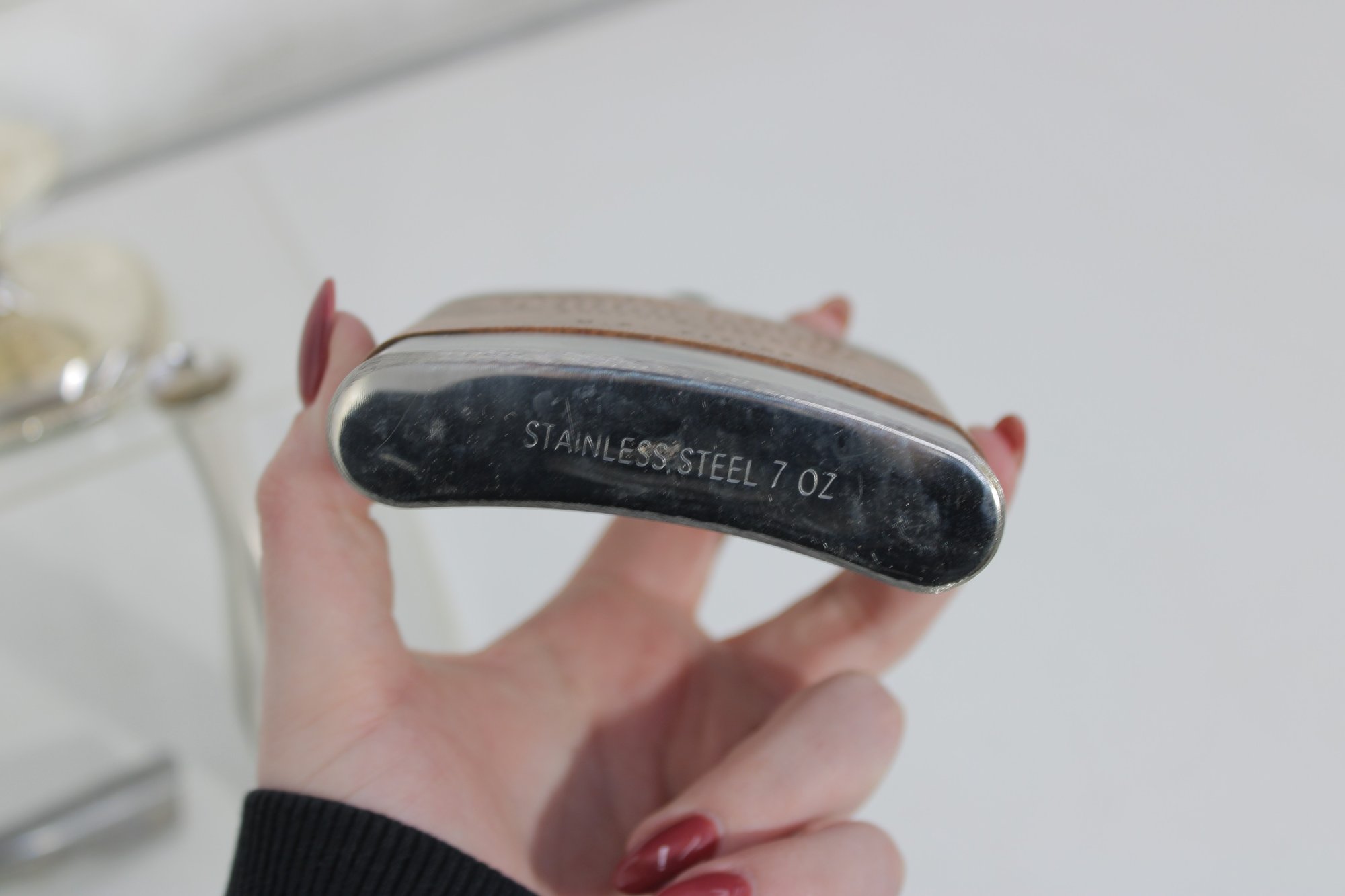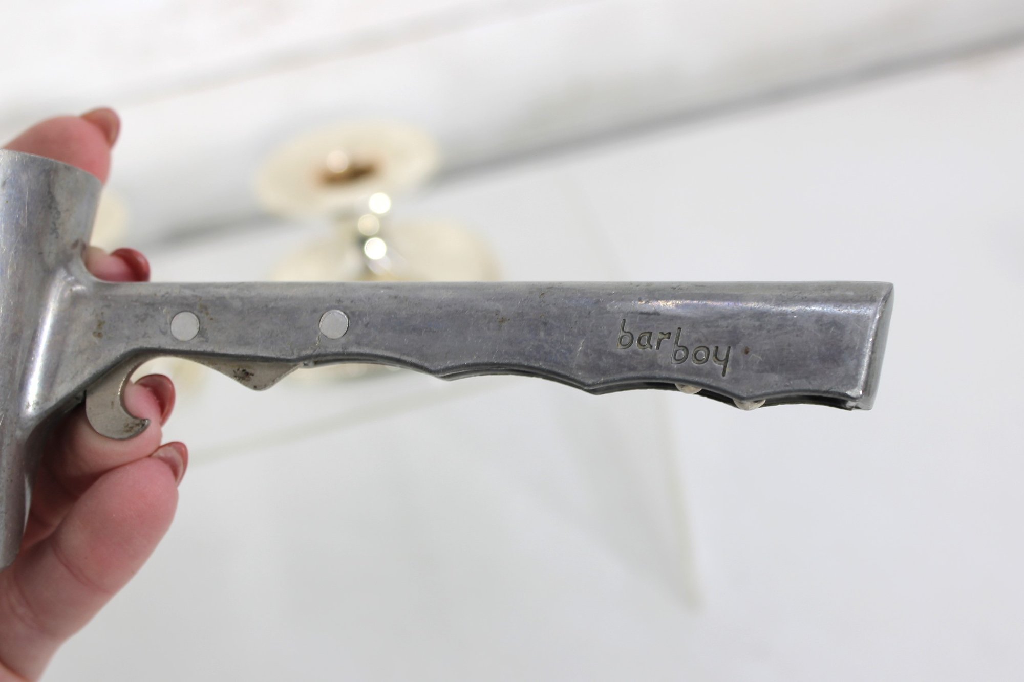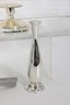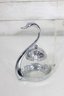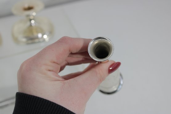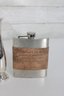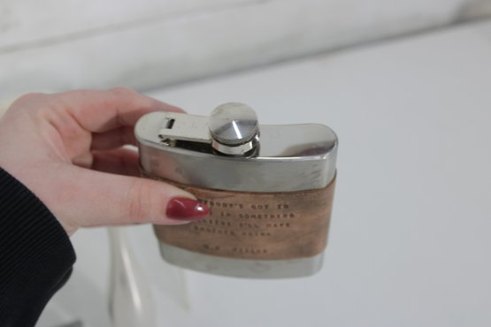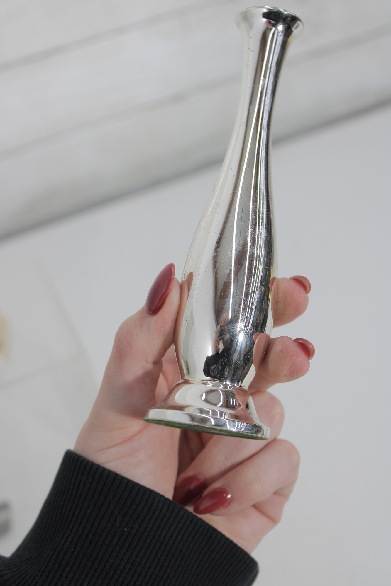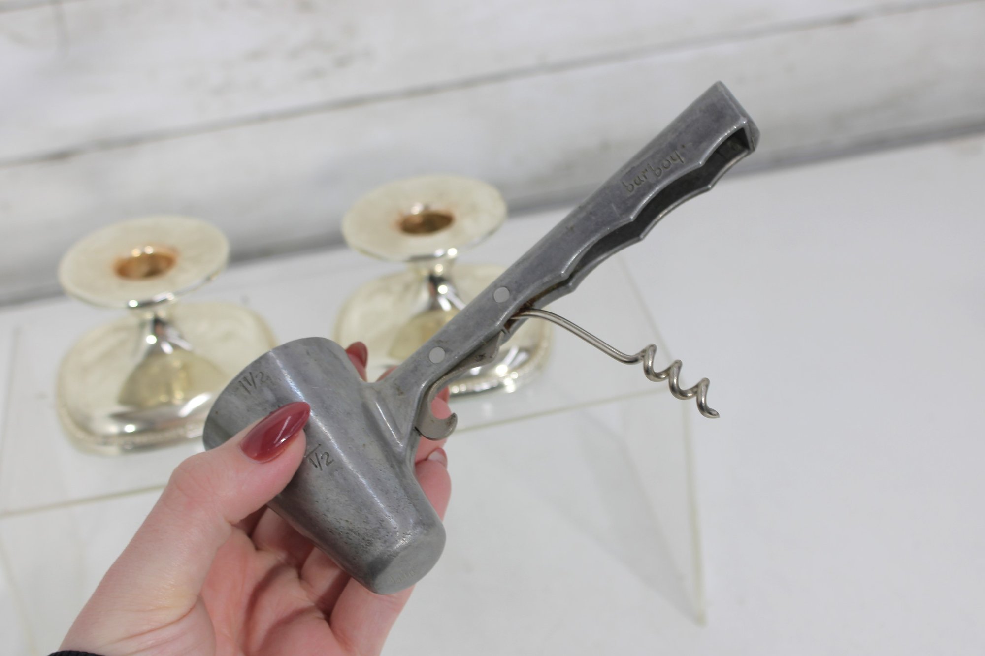 Assorted vintage barware and silverplate decorative mix lot featuring a variety of unique pieces. This eclectic group includes a metal flask with engraved plaque, pair of candlesticks, swan-shaped dish with lidded jar, small flared vase, metal shot cup with corkscrew-style handle, and additional bar or serving accessories.