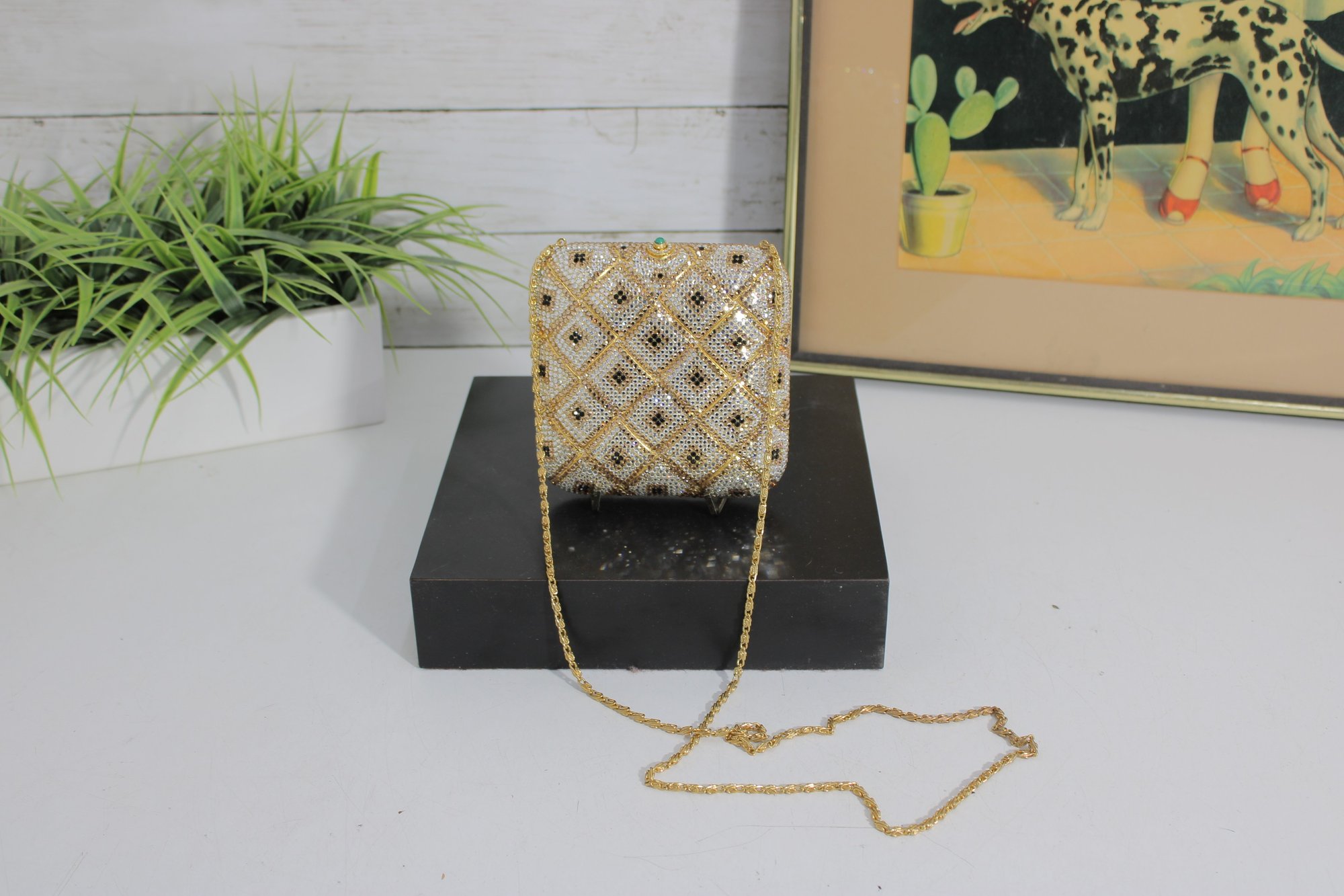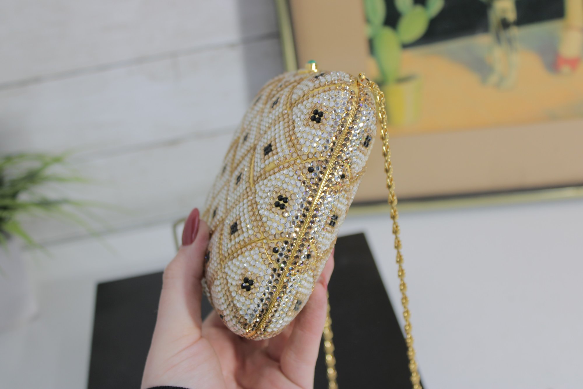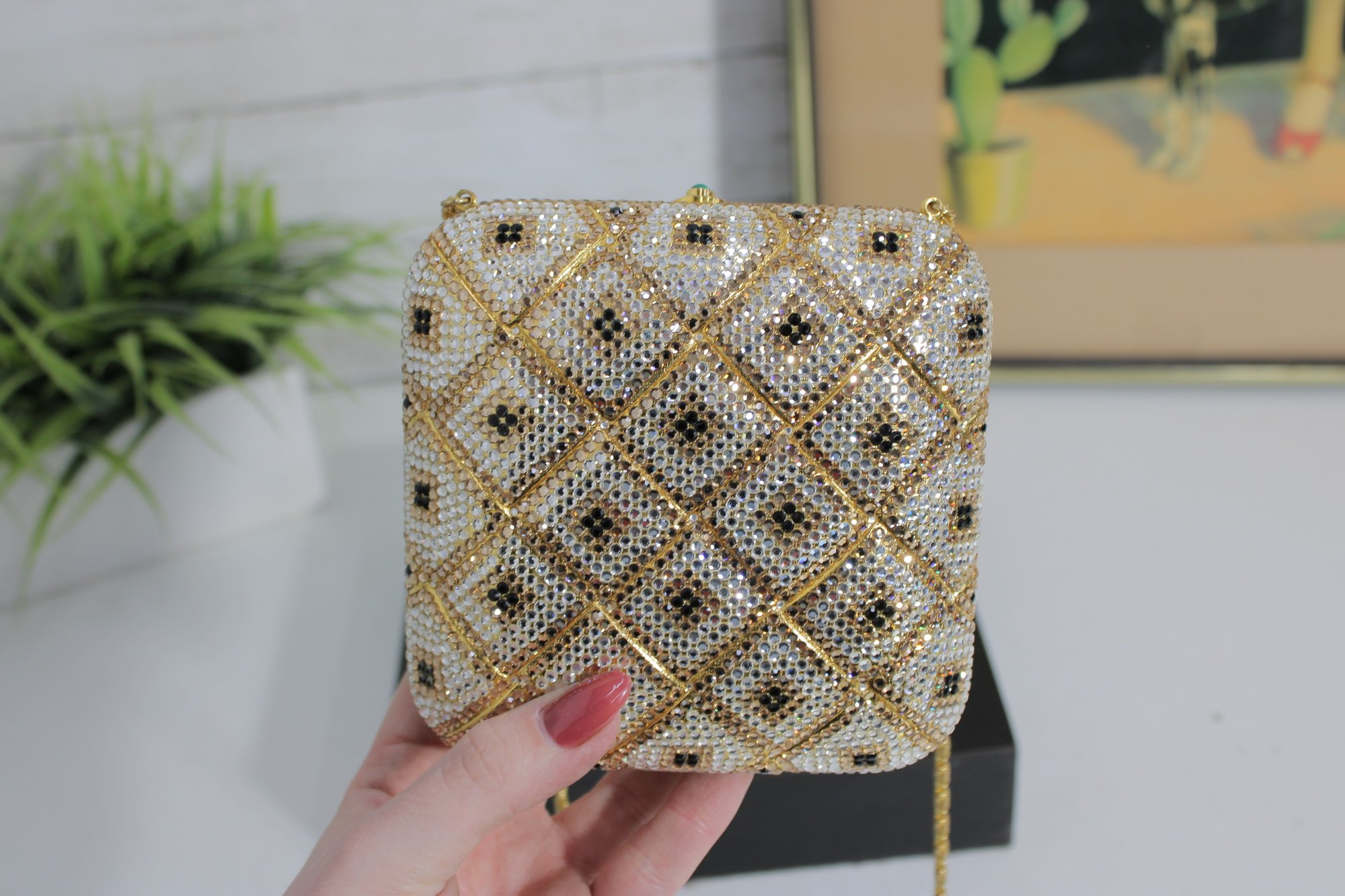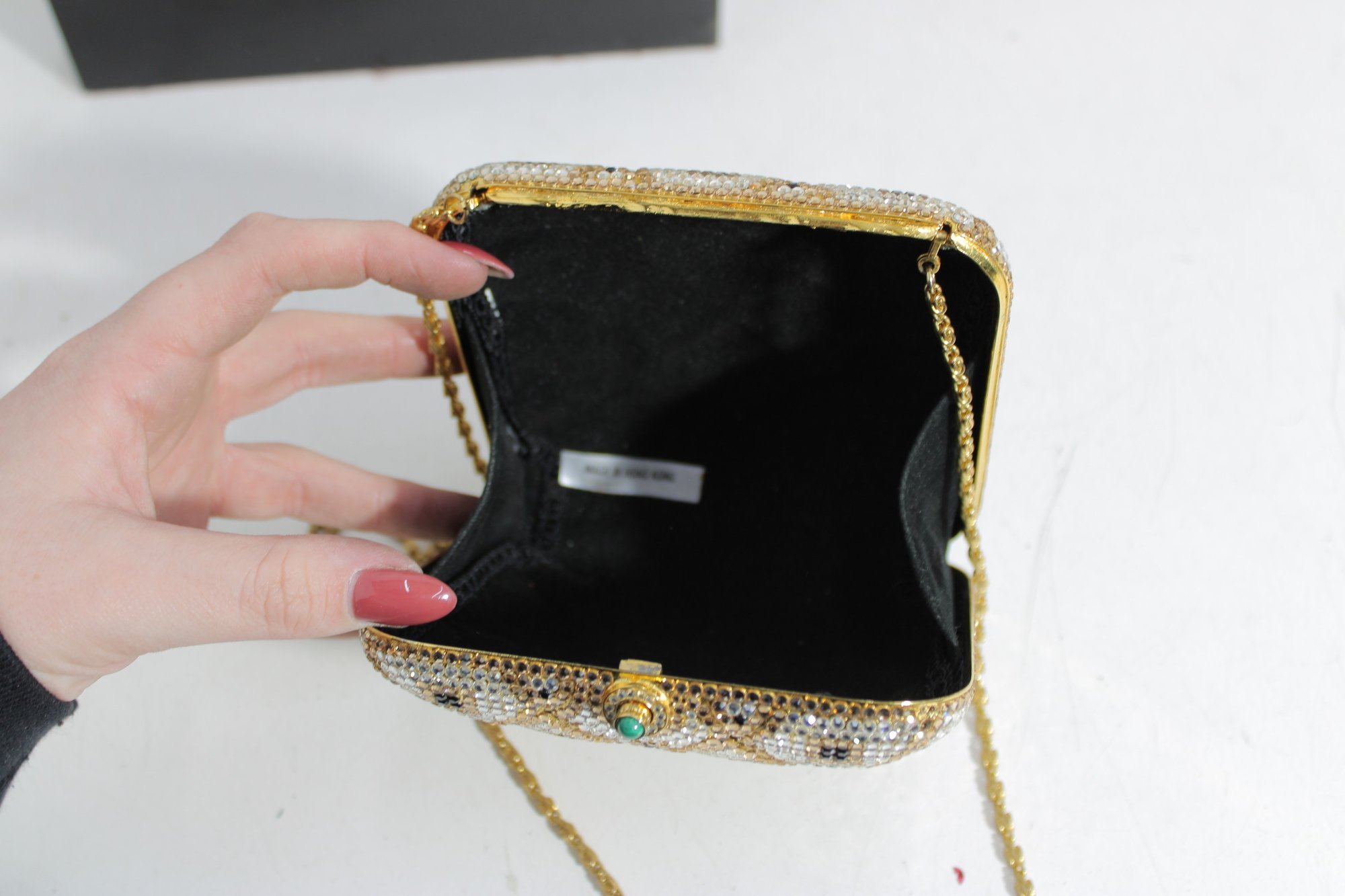 The structured box-style design opens to a black fabric-lined interior and includes a delicate gold-tone chain strap for shoulder or crossbody wear. A decorative green stone clasp adds a lovely finishing touch.