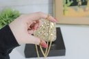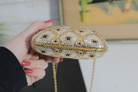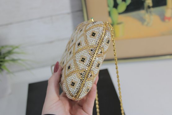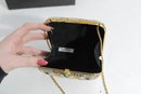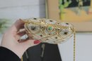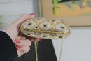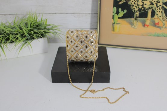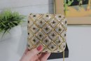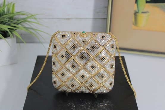 Stunning vintage evening clutch featuring an elegant gold and ivory beaded geometric pattern with black accents. This glamorous purse sparkles beautifully in the light and is perfect for formal events, weddings, or special nights out.