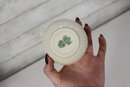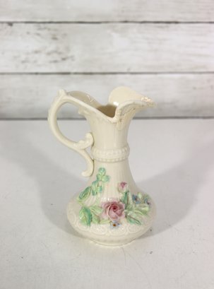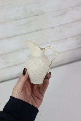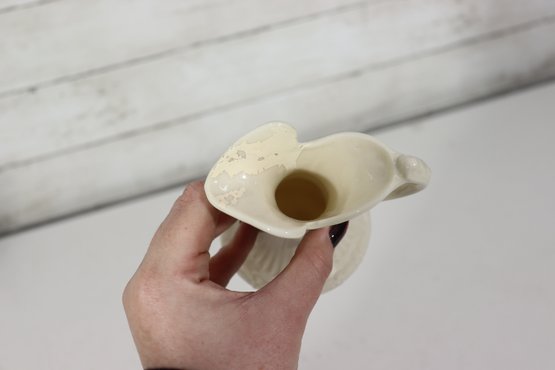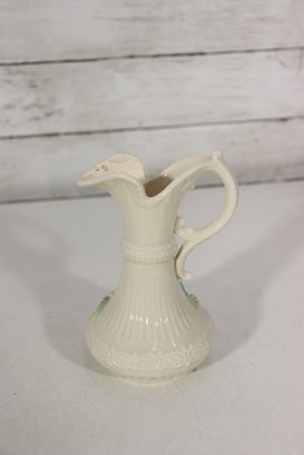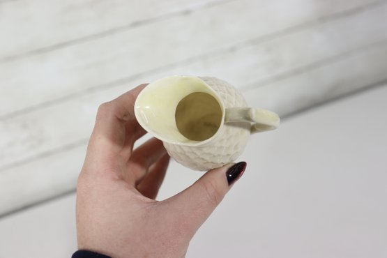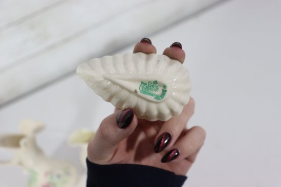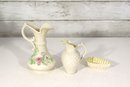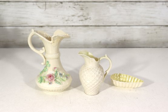 vintage Belleek-style porcelain set featuring two miniature pitchers and a matching shell-shaped dish, all crafted in classic ivory creamware with delicate detailing. The pieces display traditional basket-weave textures, floral accents, and soft glazed finishes, characteristic of Irish Belleek-inspired design. Green maker’s marks are present on the bases (see photos).