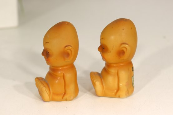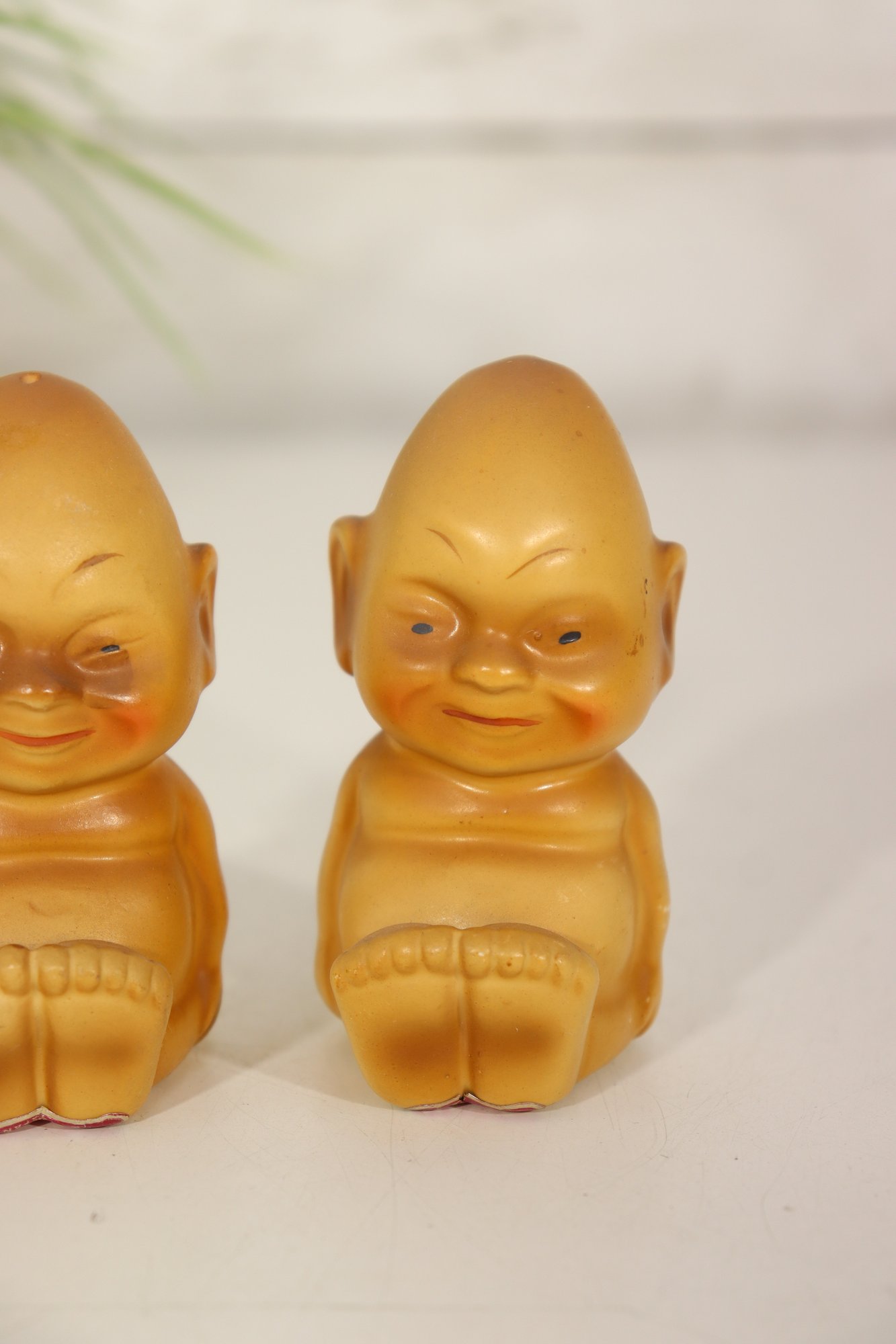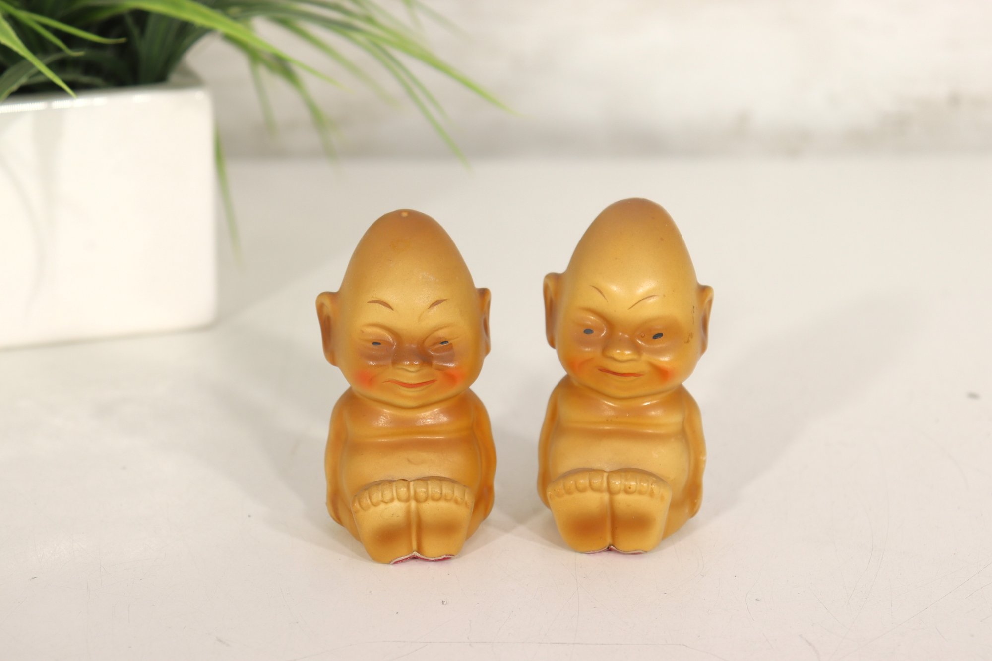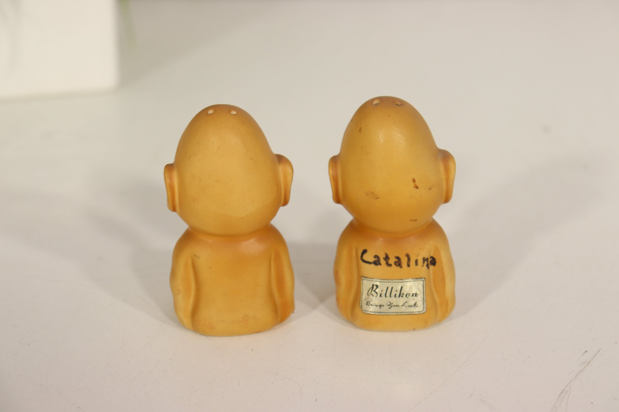 Pair of vintage Billiken figural salt & pepper shakers marked Catalina with original labeling underneath. These classic Billiken style figures have great character faces and seated form. Nice warm tan finish, each shaker approx. 3.5” tall.