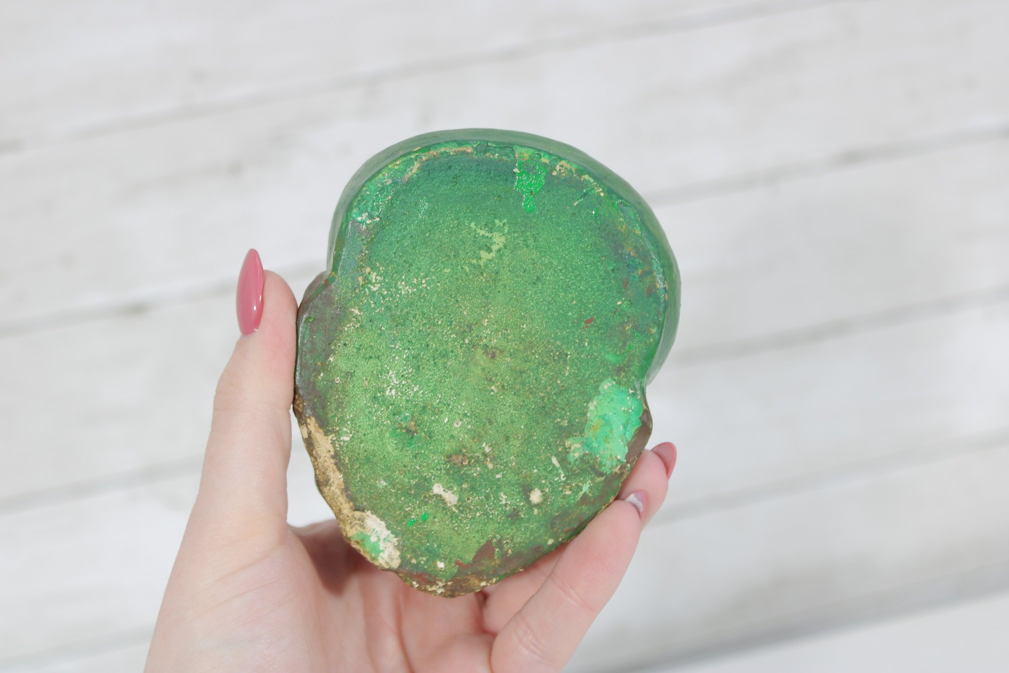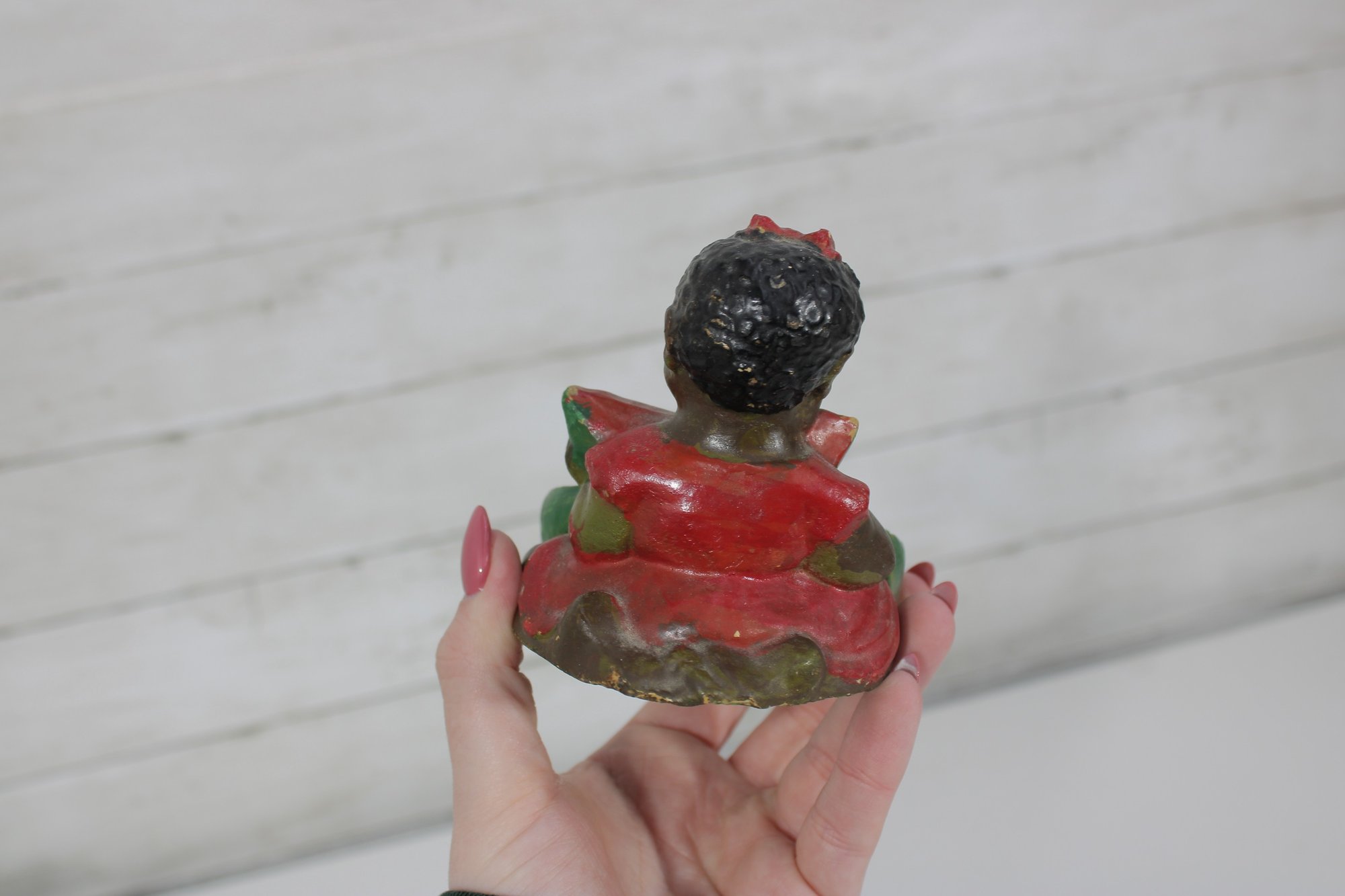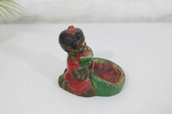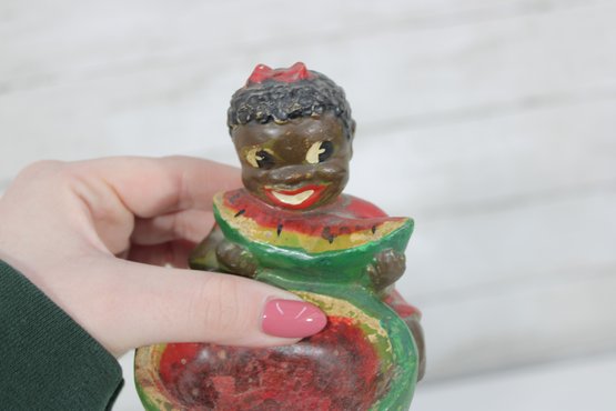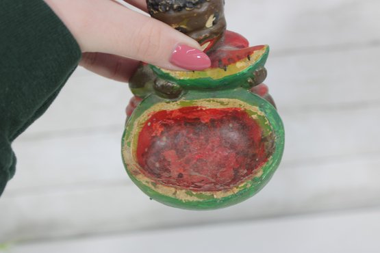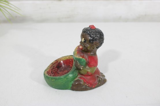 vintage figural ashtray measuring approximately 4 inches high, featuring a hand-painted design of a child holding a slice of watermelon above a watermelon-shaped tray.
