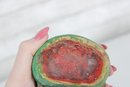 The piece is finished in bright red and green tones with hand-painted facial details and expressive features. The lower portion forms a small ashtray styled as a cut watermelon, giving the piece a distinctive novelty design typical of mid-20th century figural smoking accessories.