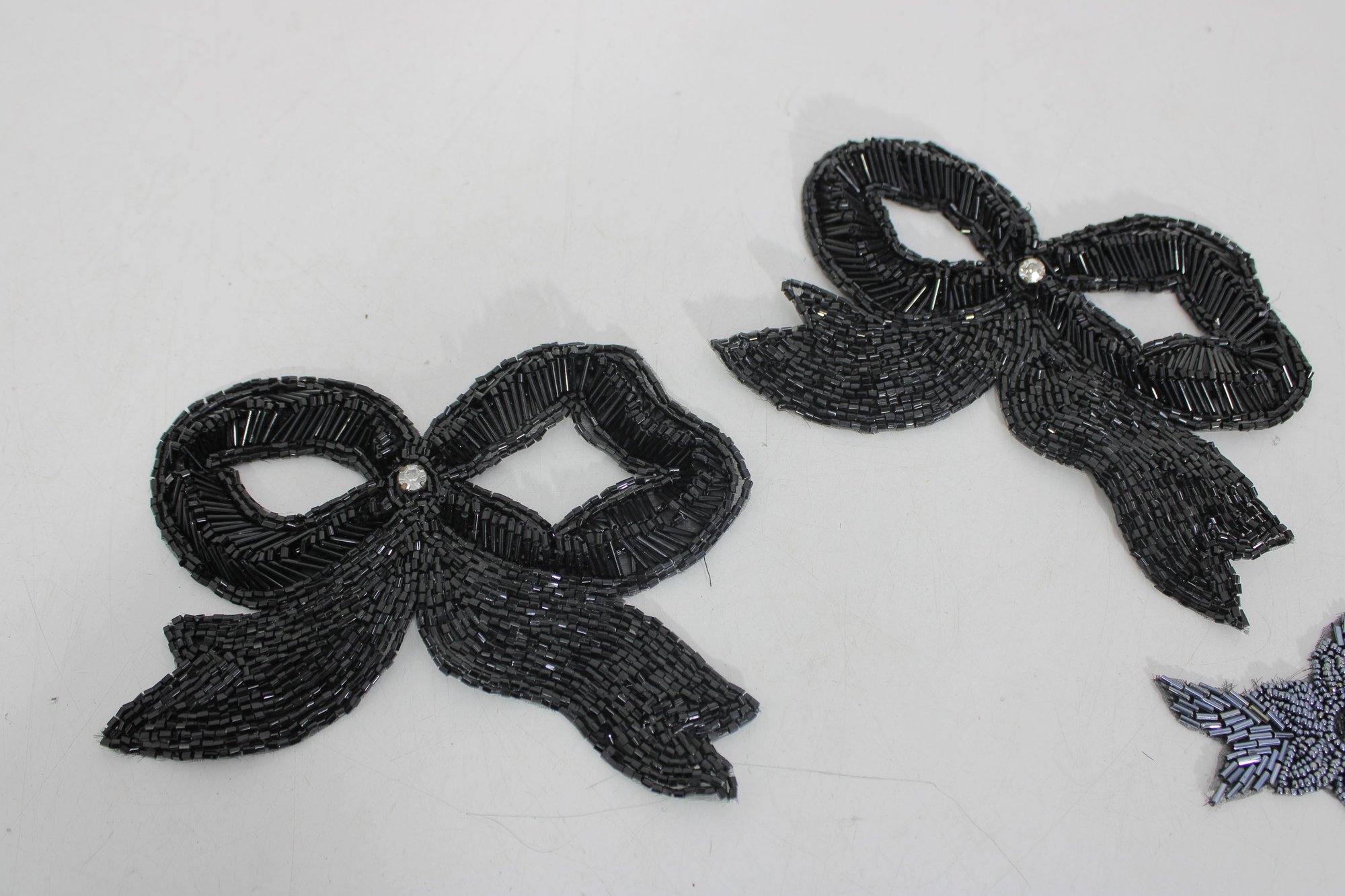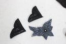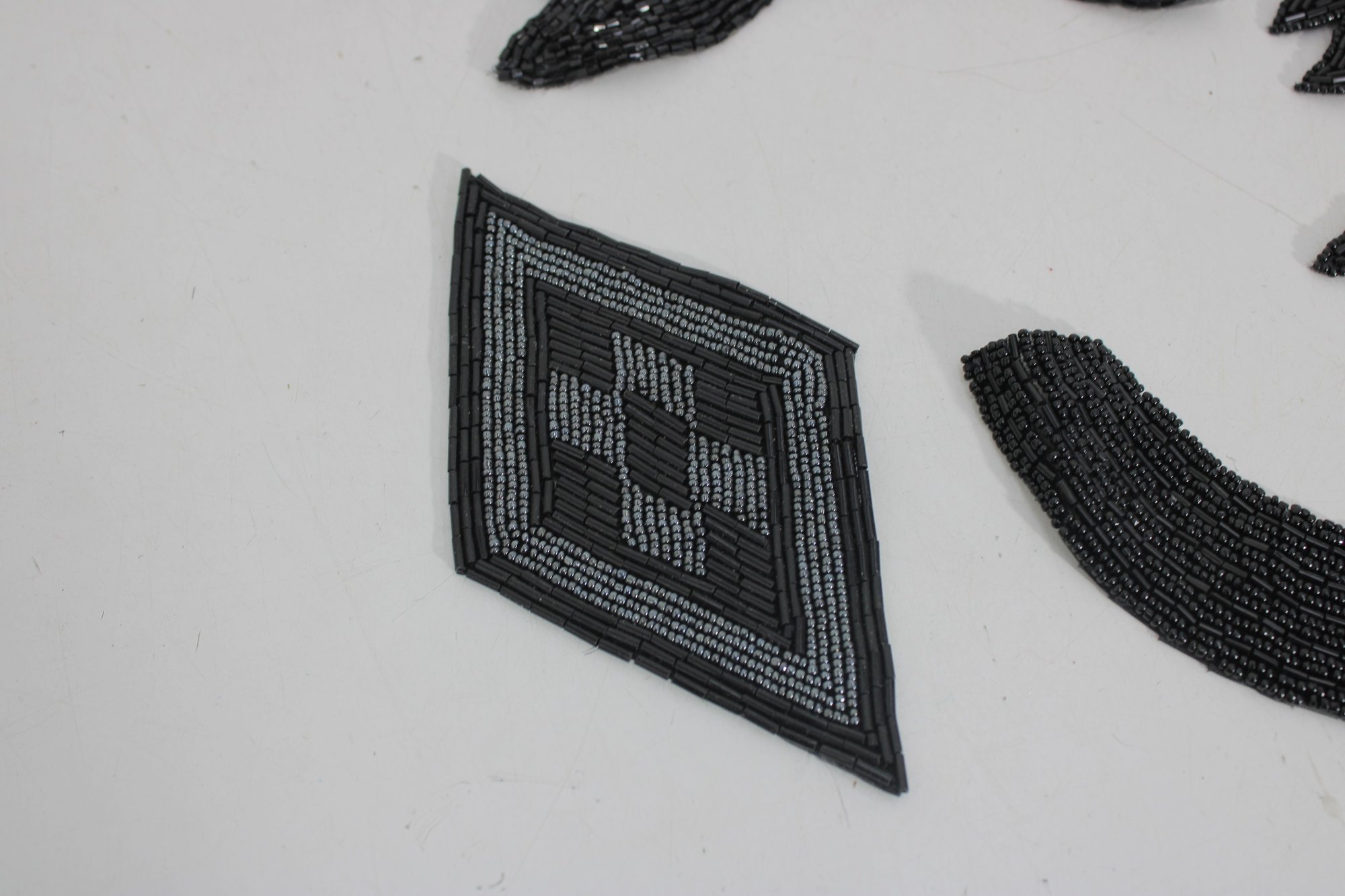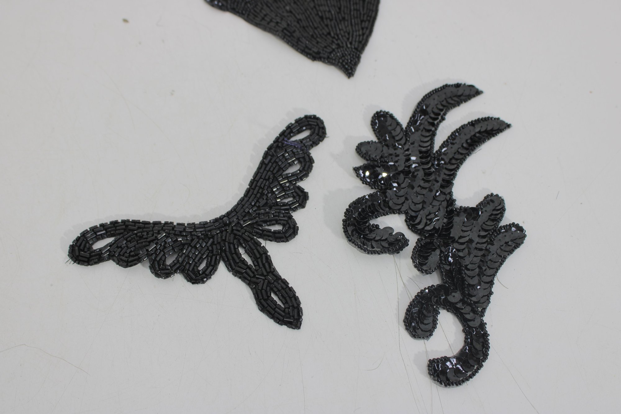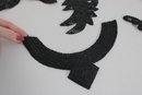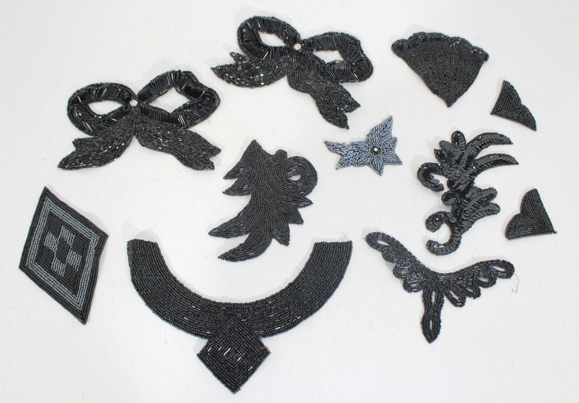 collection of vintage black beaded and sequin appliquƩ patches featuring sophisticated bow, collar, bird, and ornamental motifs. These richly textured embellishments are perfect for eveningwear, costume design, millinery, or creative upcycling projects.