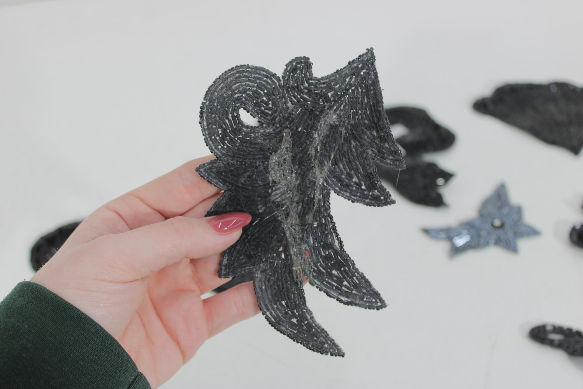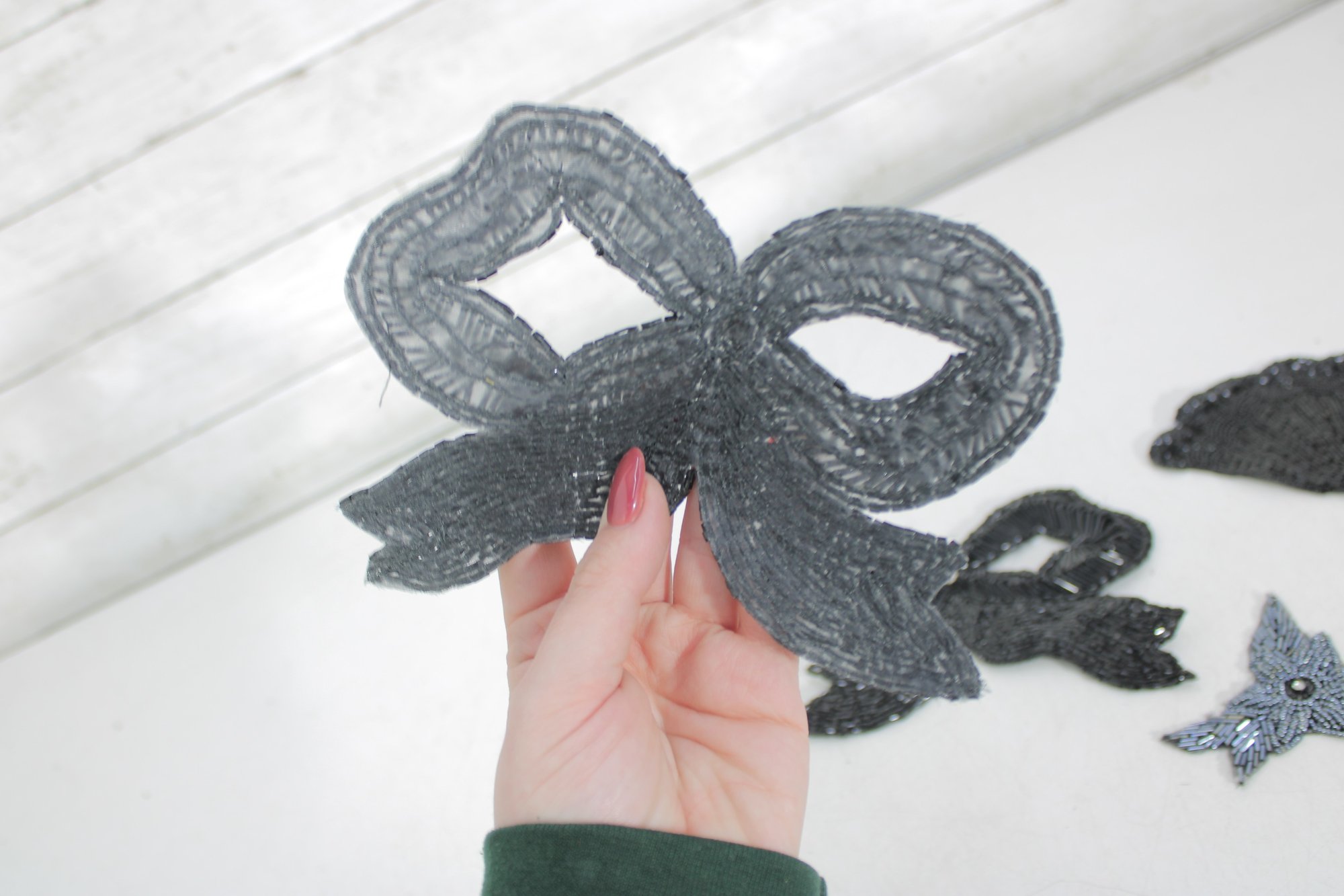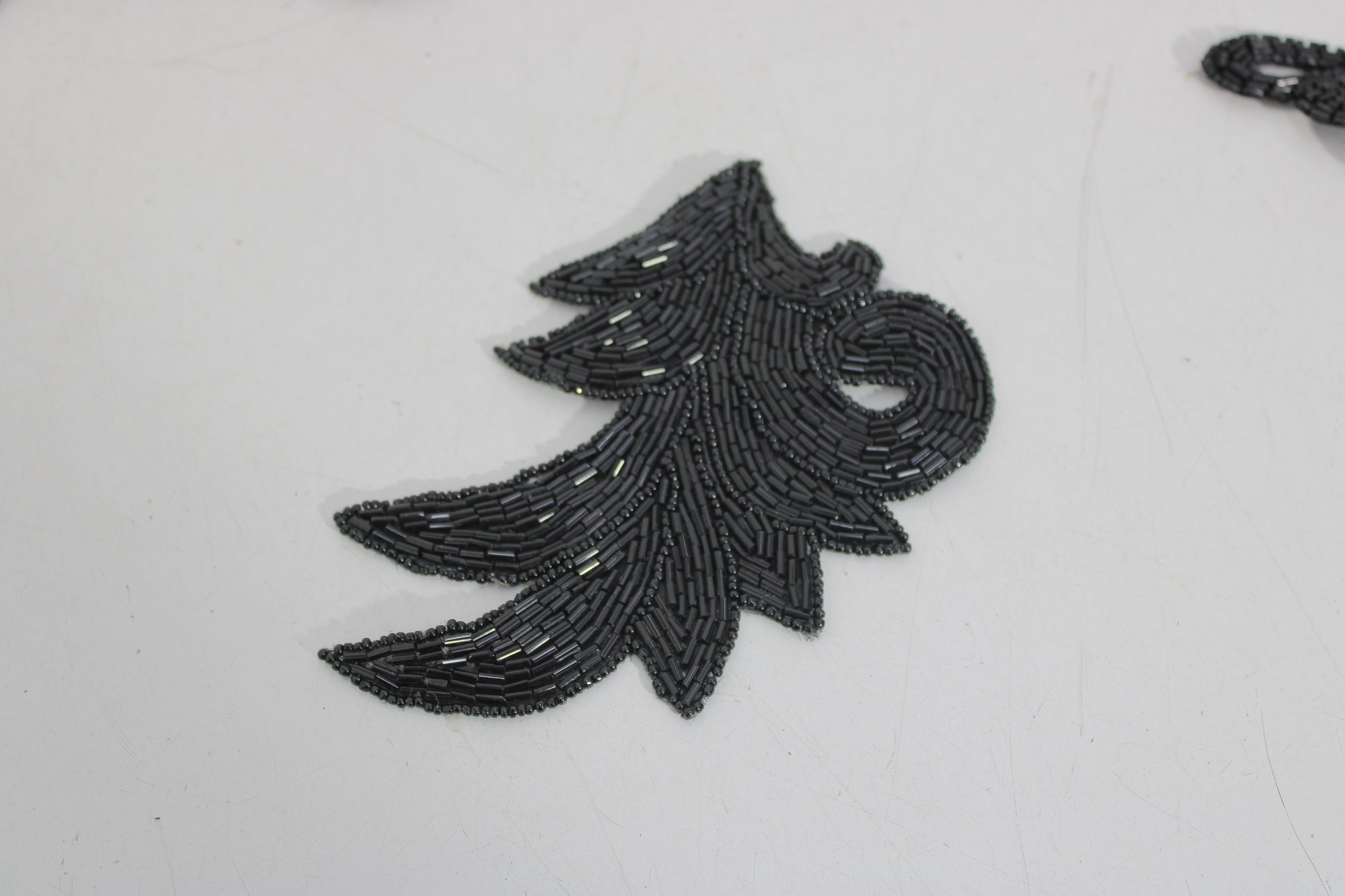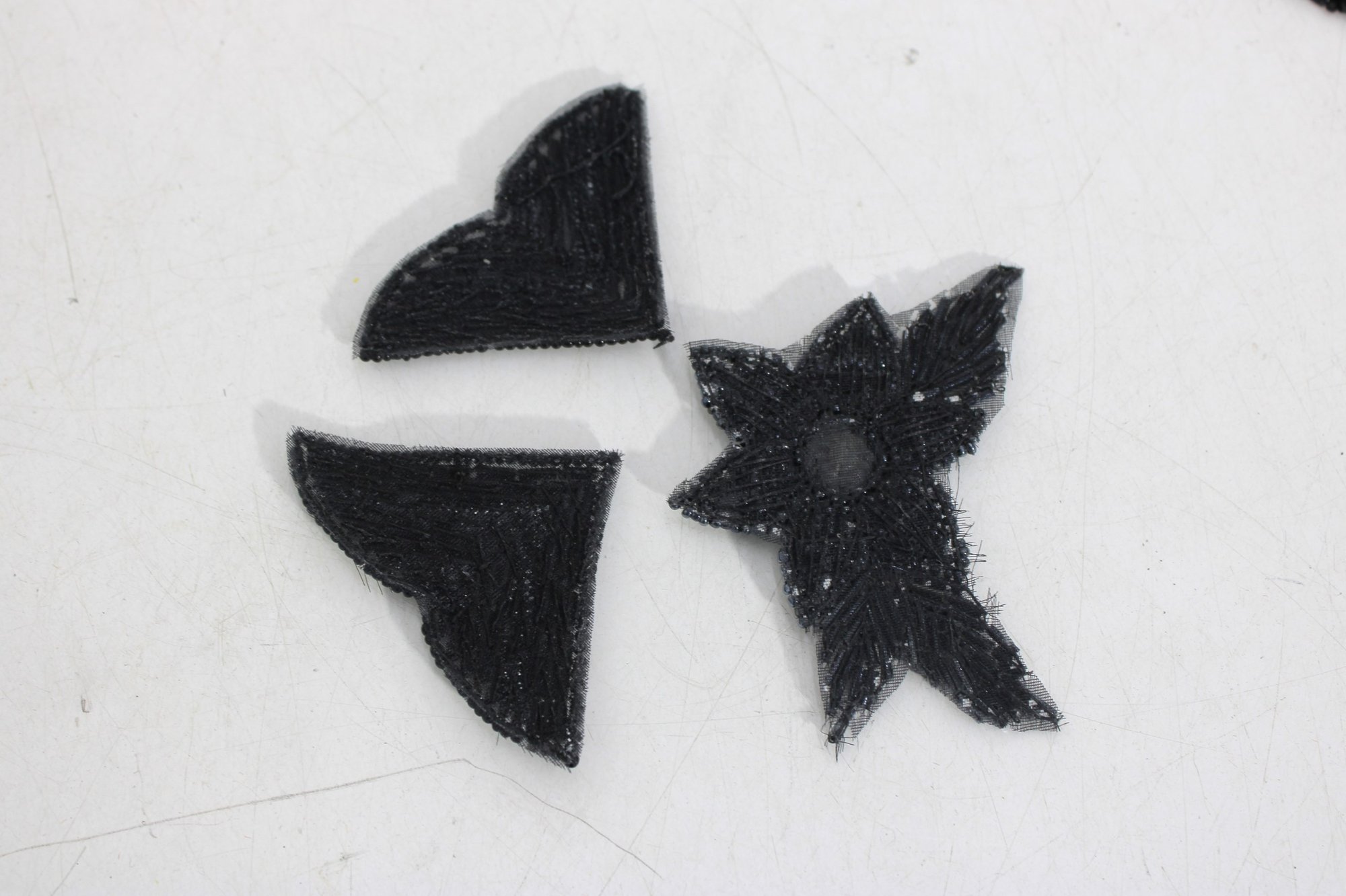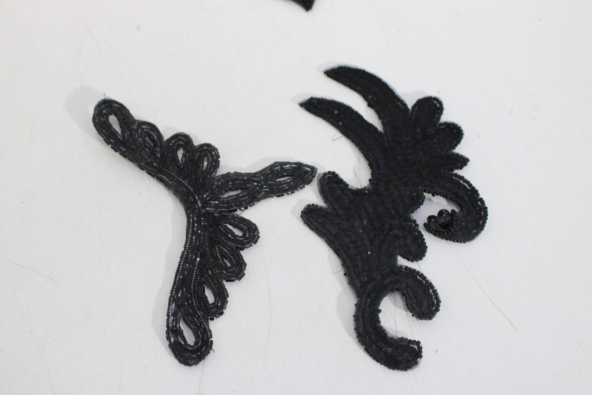 collection of vintage black beaded and sequin appliquƩ patches featuring sophisticated bow, collar, bird, and ornamental motifs. These richly textured embellishments are perfect for eveningwear, costume design, millinery, or creative upcycling projects.