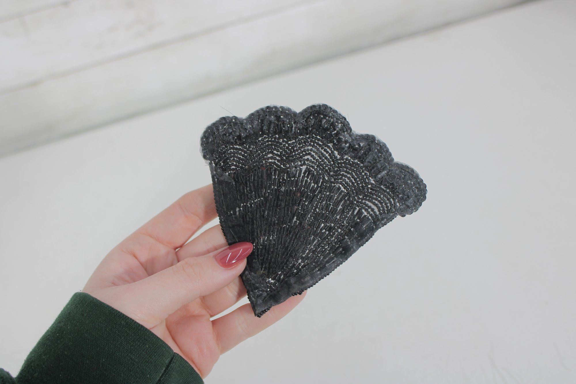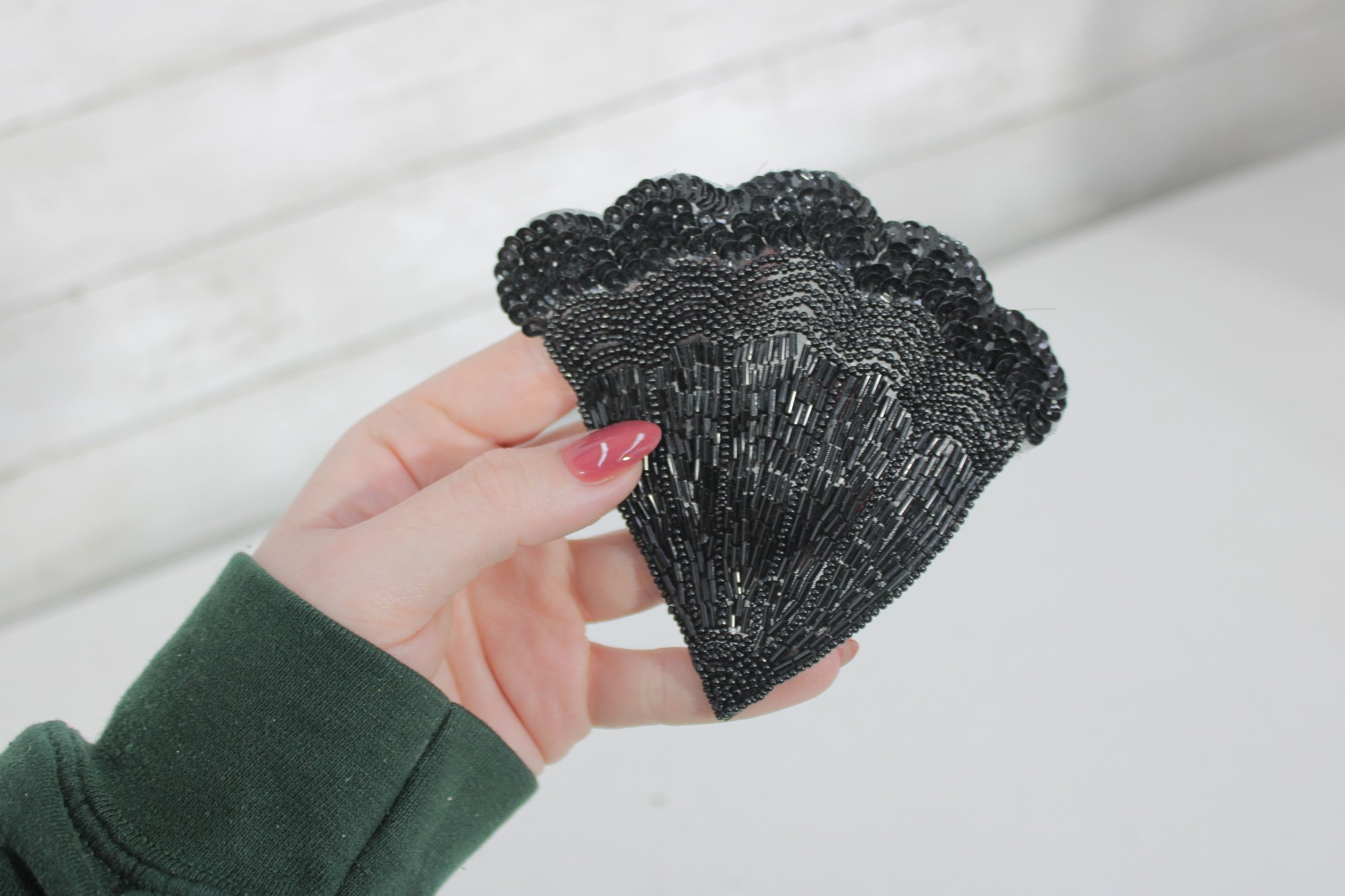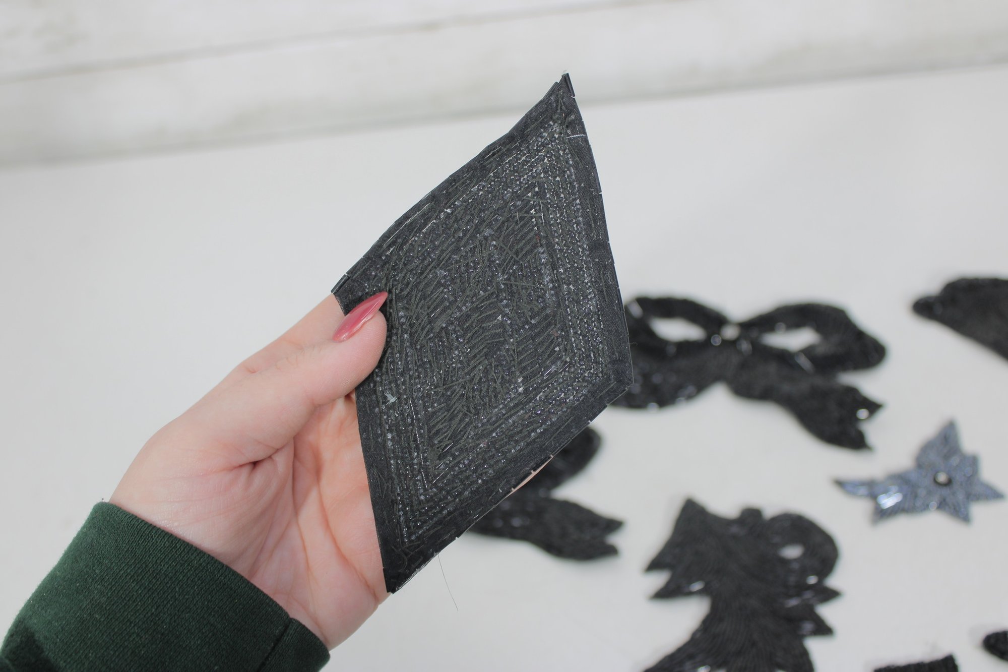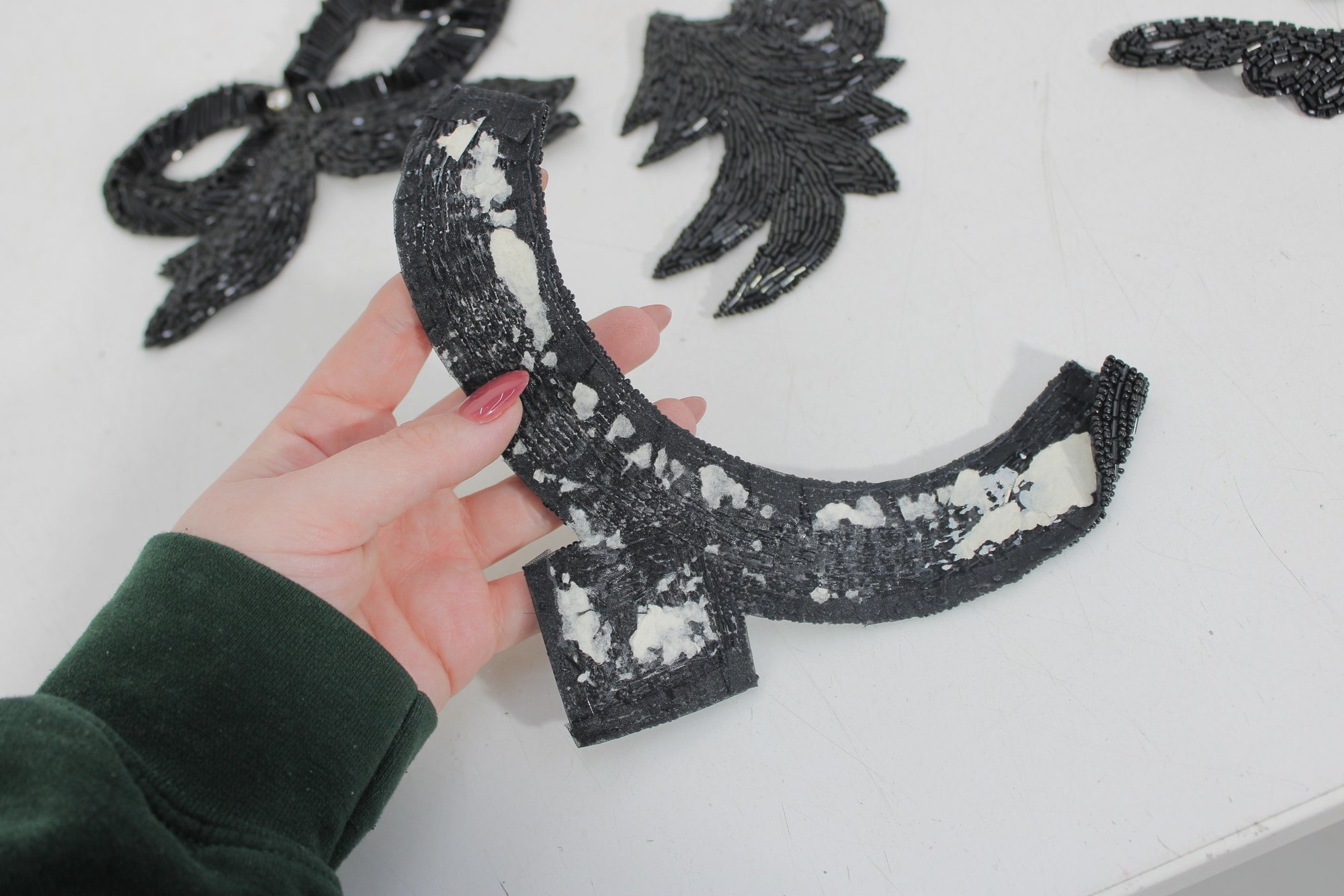 collection of vintage black beaded and sequin appliquƩ patches featuring sophisticated bow, collar, bird, and ornamental motifs. These richly textured embellishments are perfect for eveningwear, costume design, millinery, or creative upcycling projects.