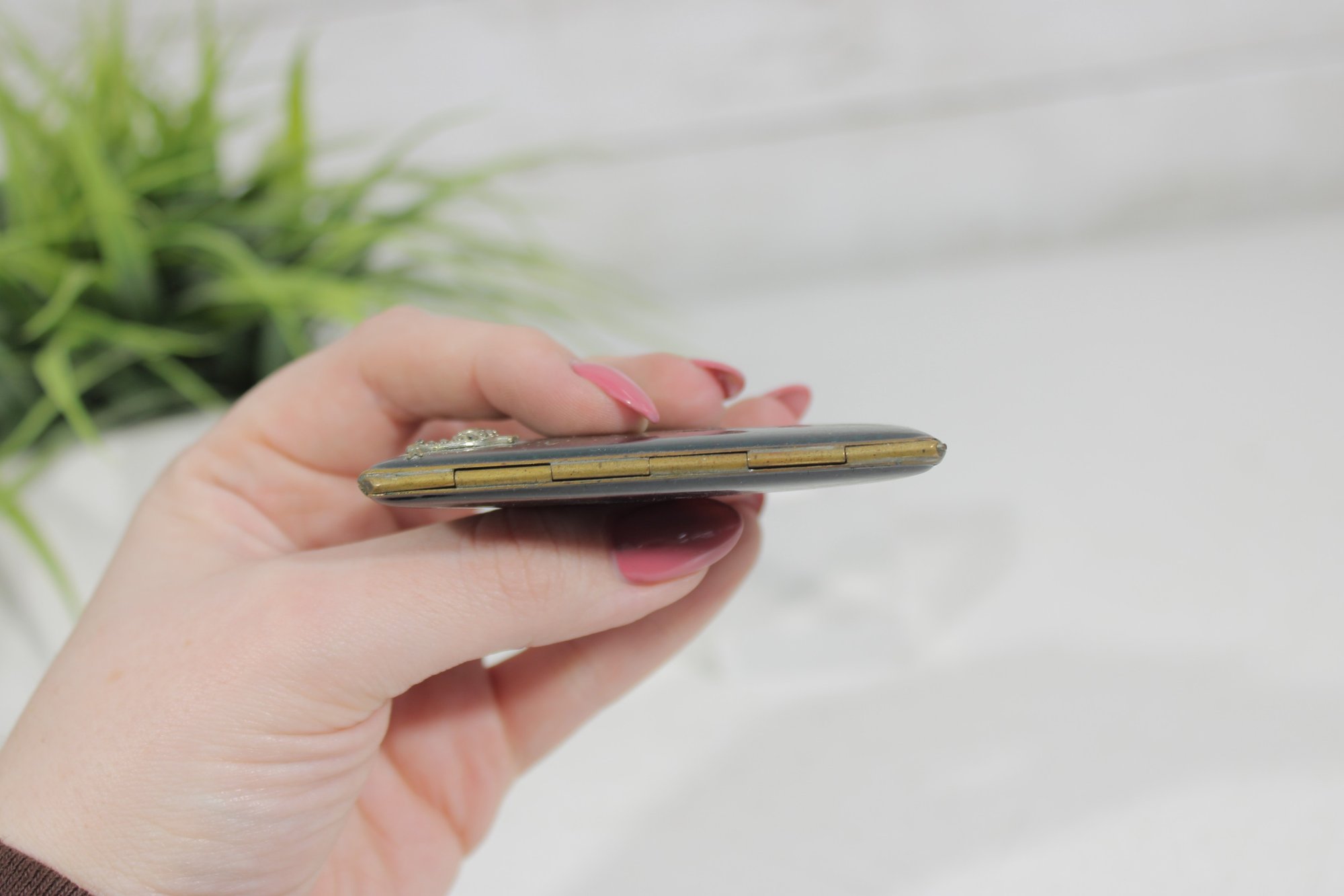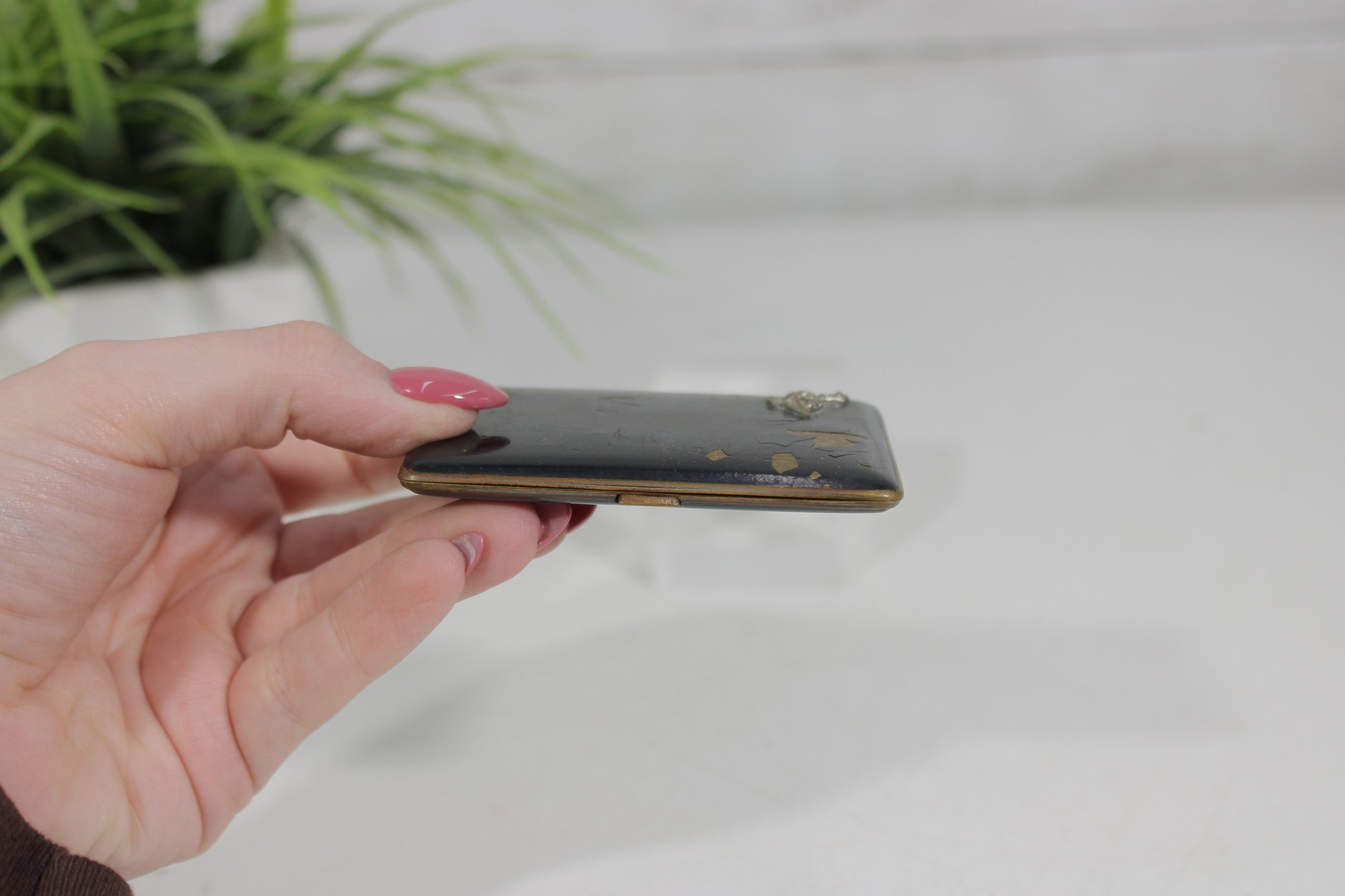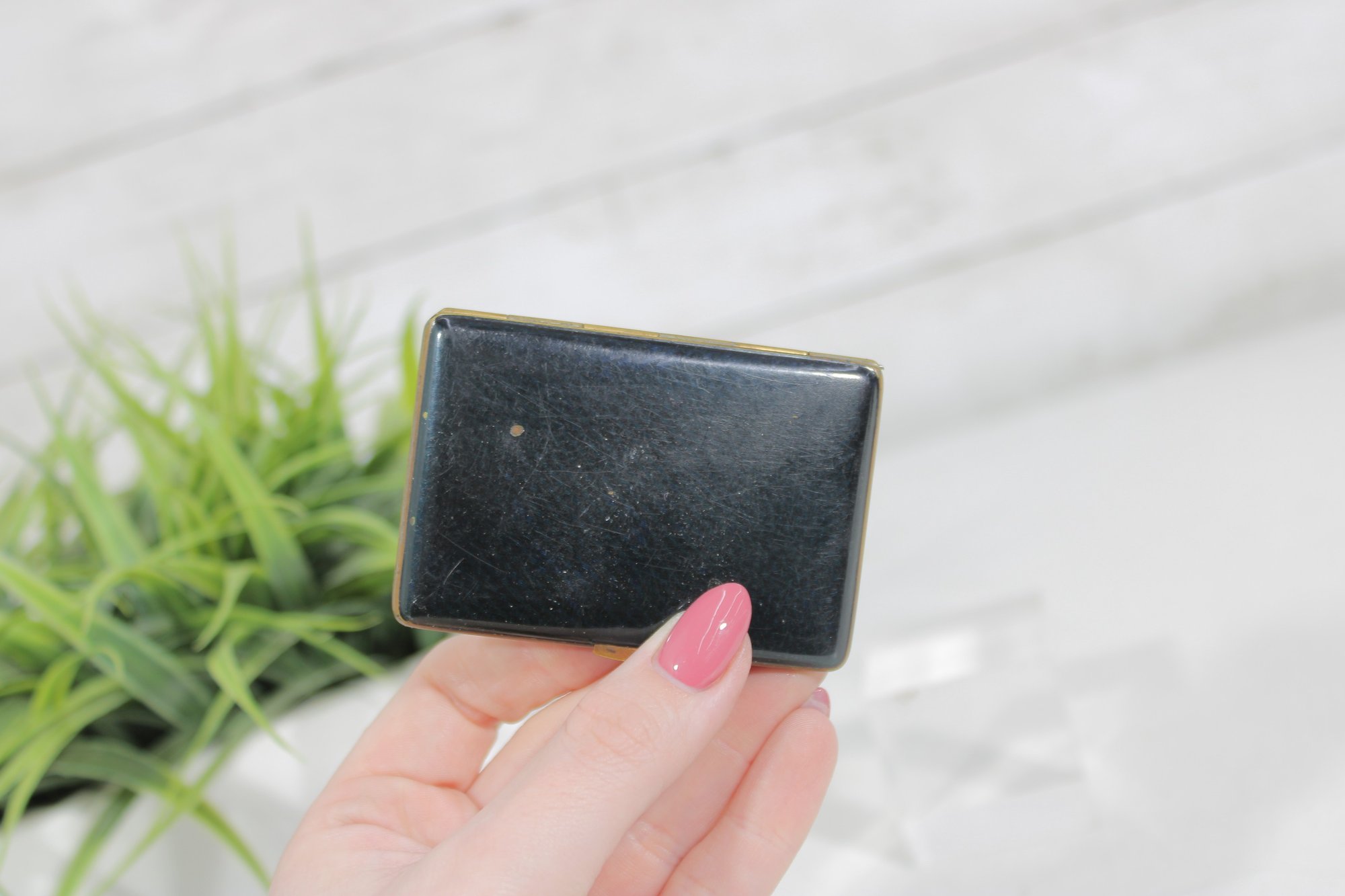 vintage black enamel business card holder, a classic pocket accessory designed to neatly store business or calling cards. The case features a black enamel exterior with a brass-tone interior, giving it a simple yet elegant vintage look.