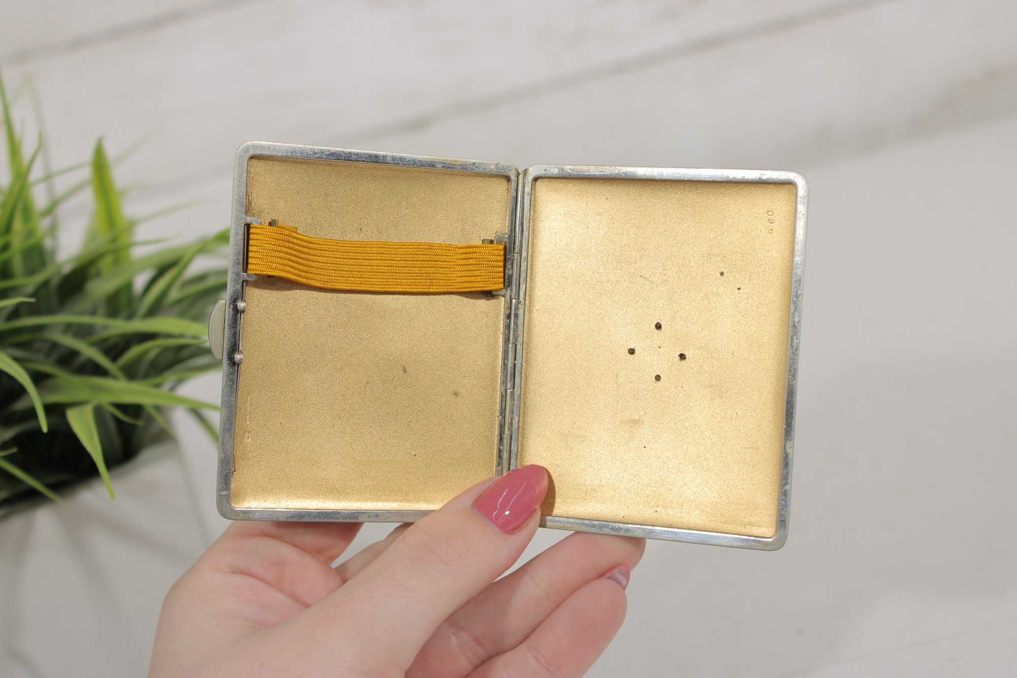 The case opens to a gold-tone interior with an elastic band designed to hold cigarettes securely in place. Its slim rectangular form makes it convenient for carrying in a purse or pocket and also works well as a small keepsake holder.