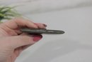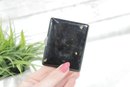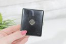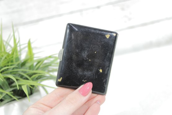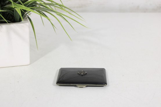 Classic vintage cigarette case featuring a sleek black enamel exterior accented with a small decorative rhinestone emblem at the center. The minimalist design and compact size give it a timeless mid-century style.