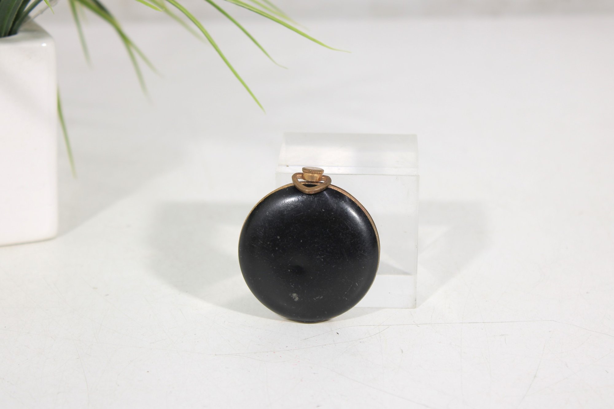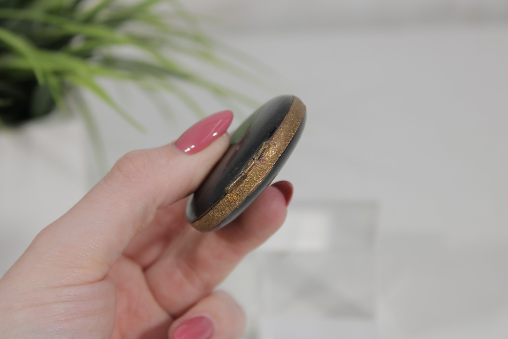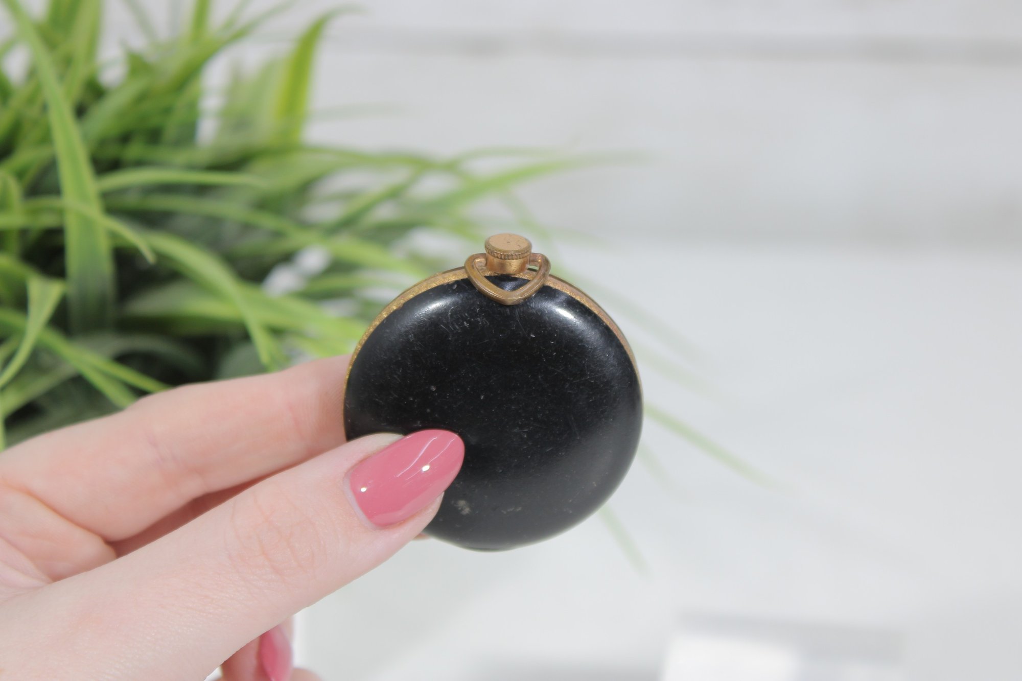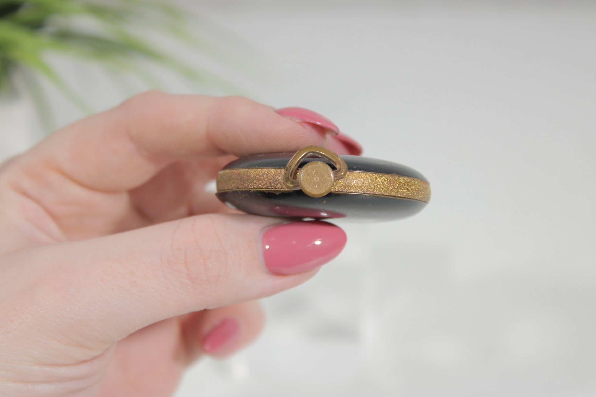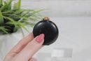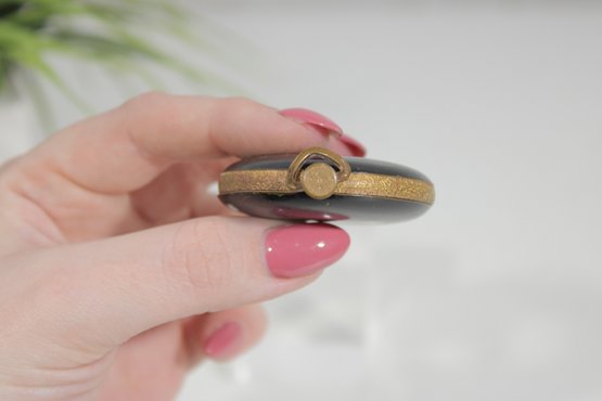 vintage round powder compact featuring a classic black enamel exterior with gold-tone trim. The compact has a timeless, minimalist design typical of early to mid-20th century vanity accessories.