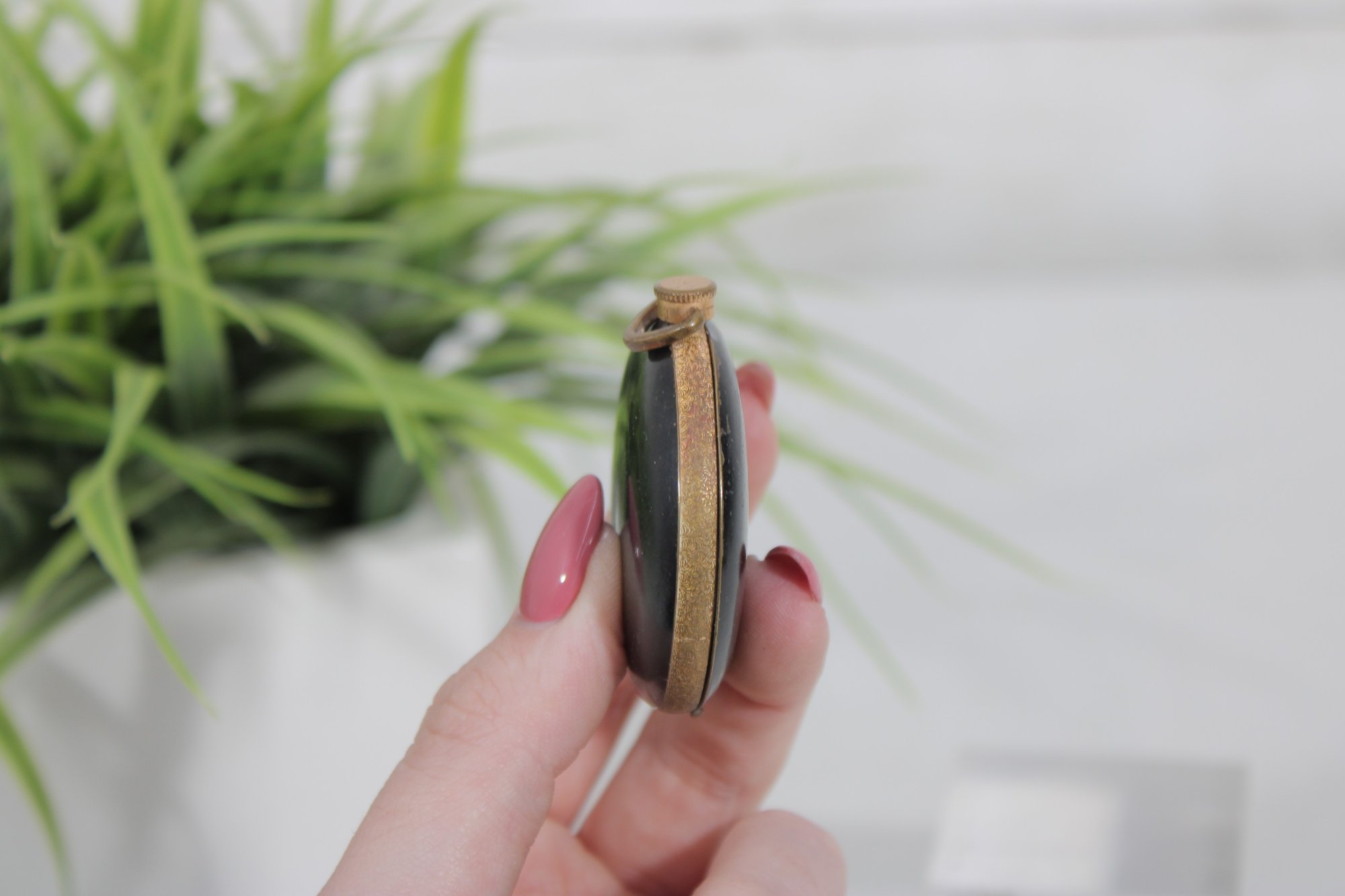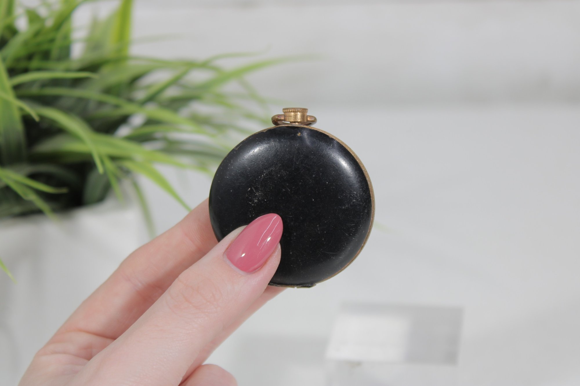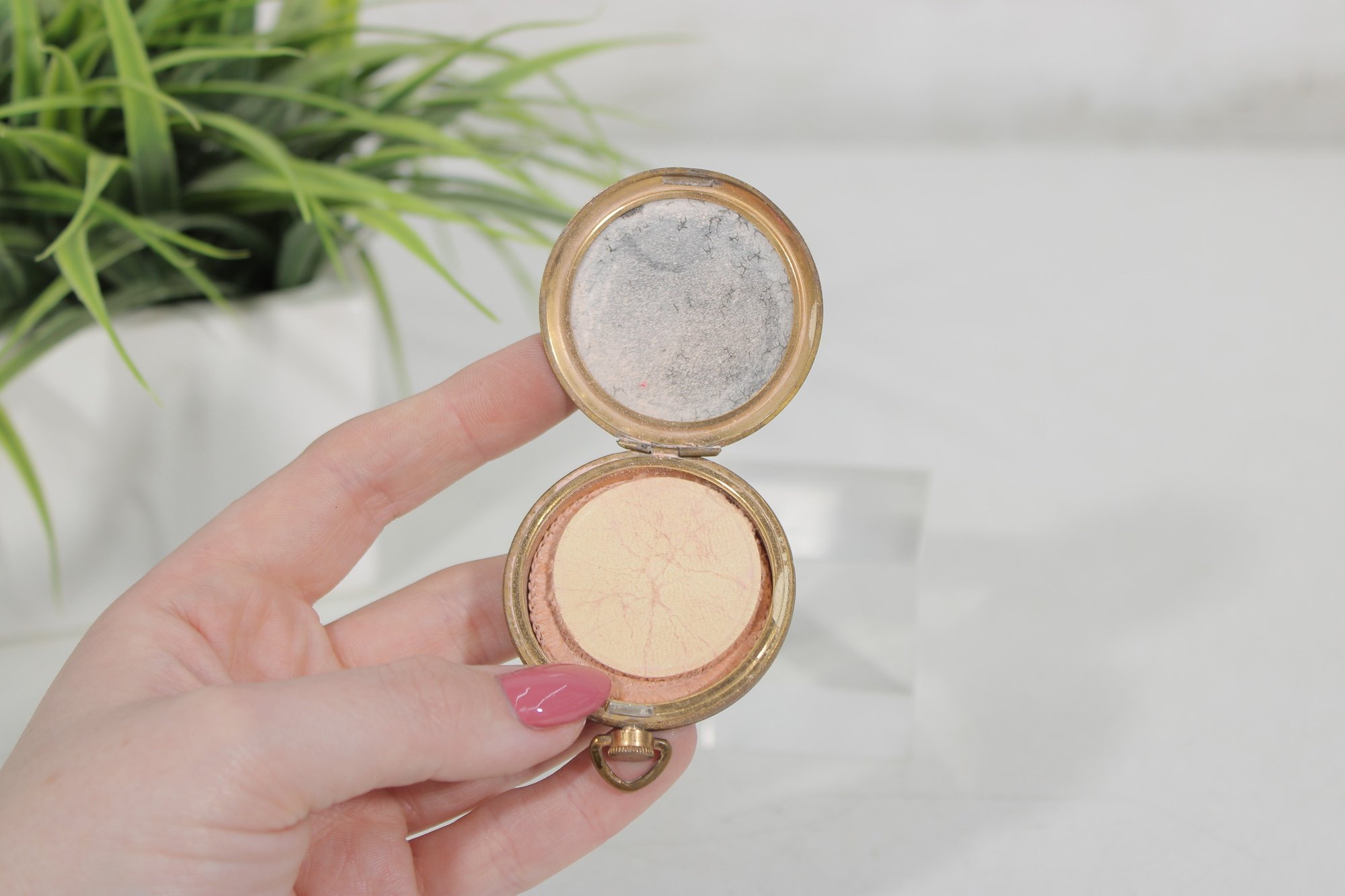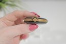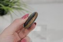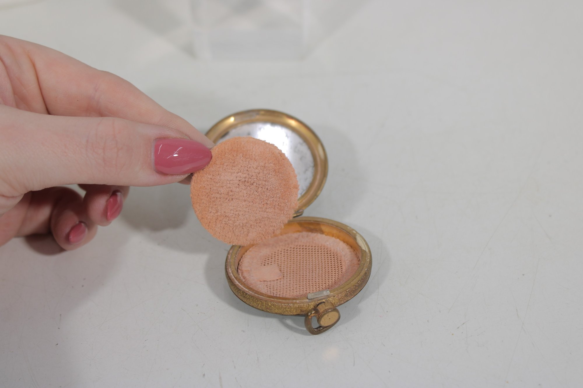 The compact opens to reveal a powder compartment with the original powder puff, making it both a charming collectible and a functional example of vintage cosmetic accessories. Its petite 2-inch size made it ideal for carrying in a purse or evening bag.