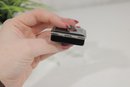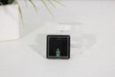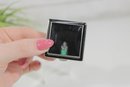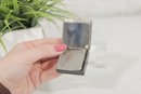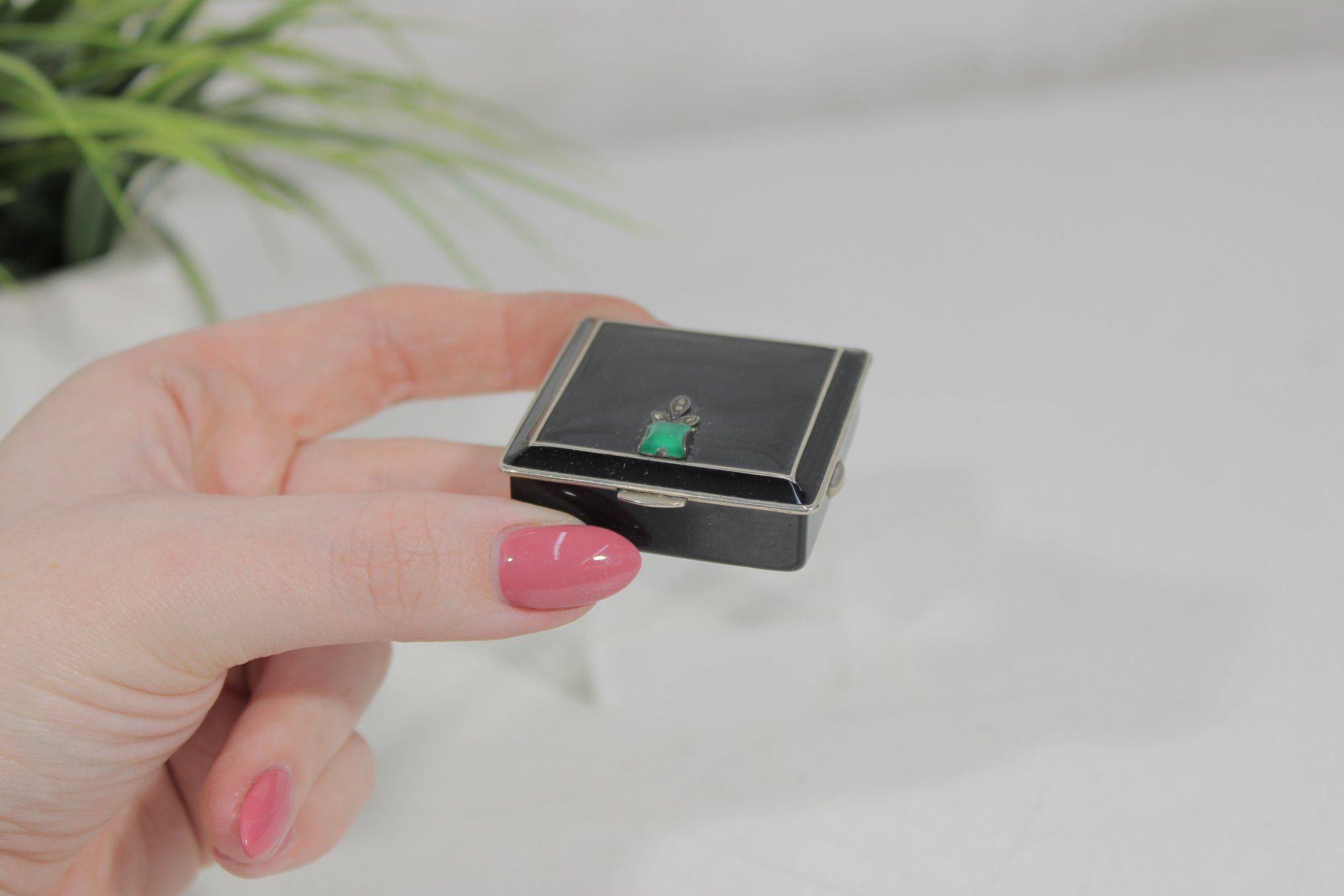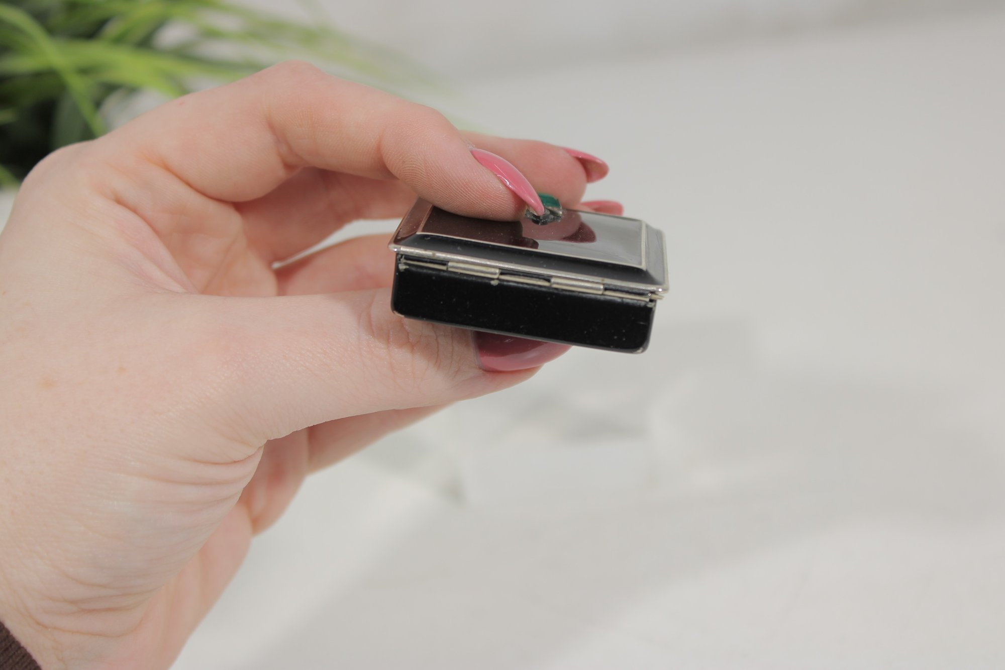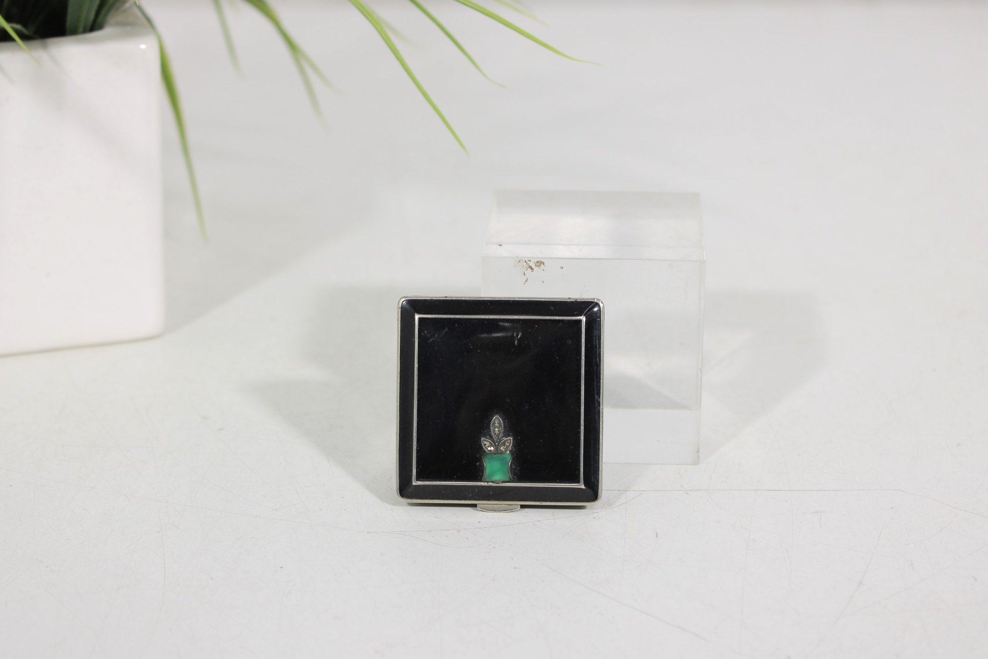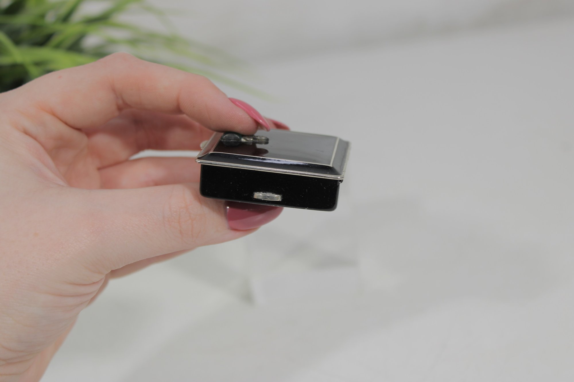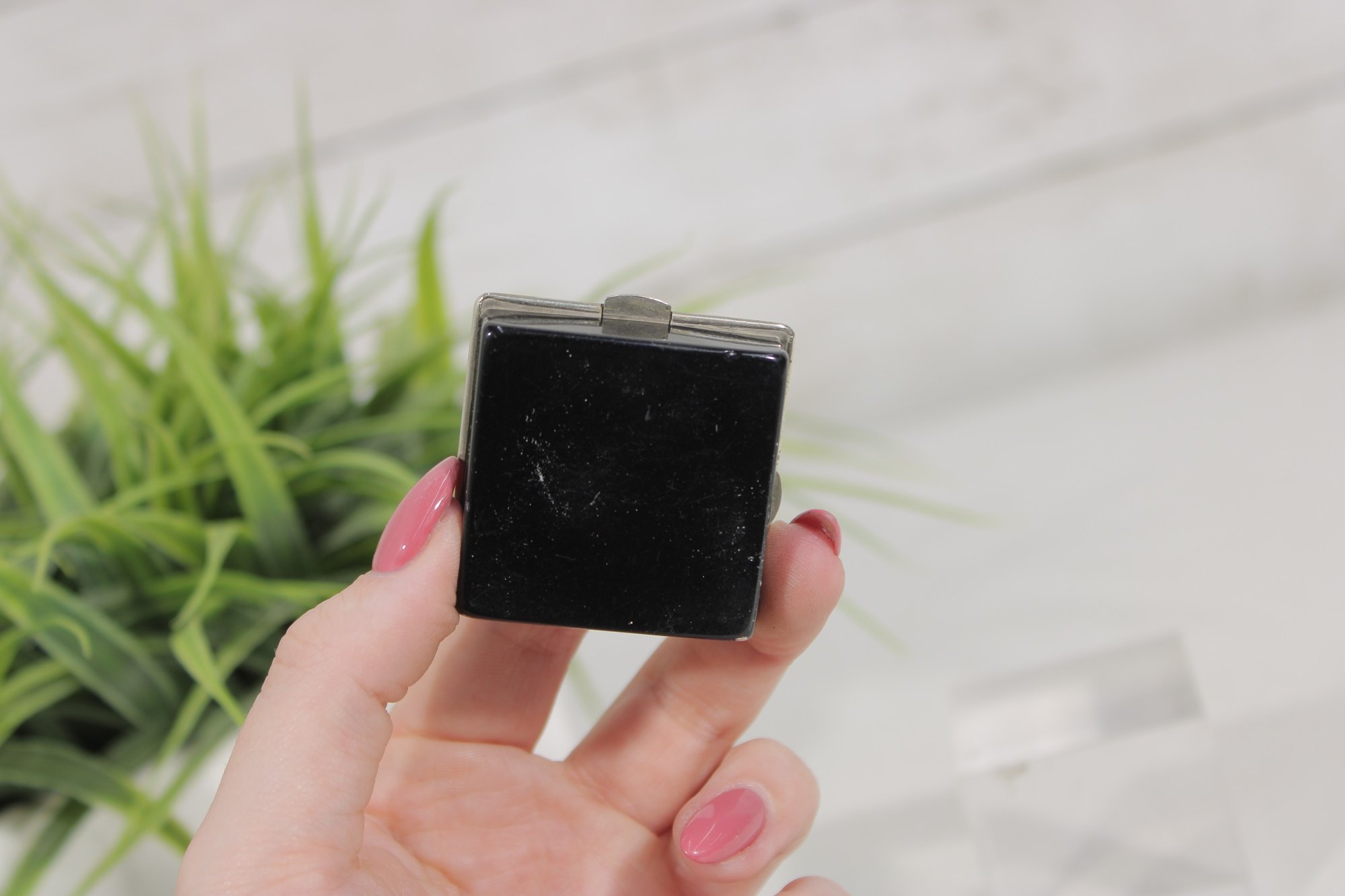 vintage square powder compact featuring a sleek black enamel lid accented with a small rhinestone-style decorative element. The minimalist design gives this piece a classic mid-century vanity look.