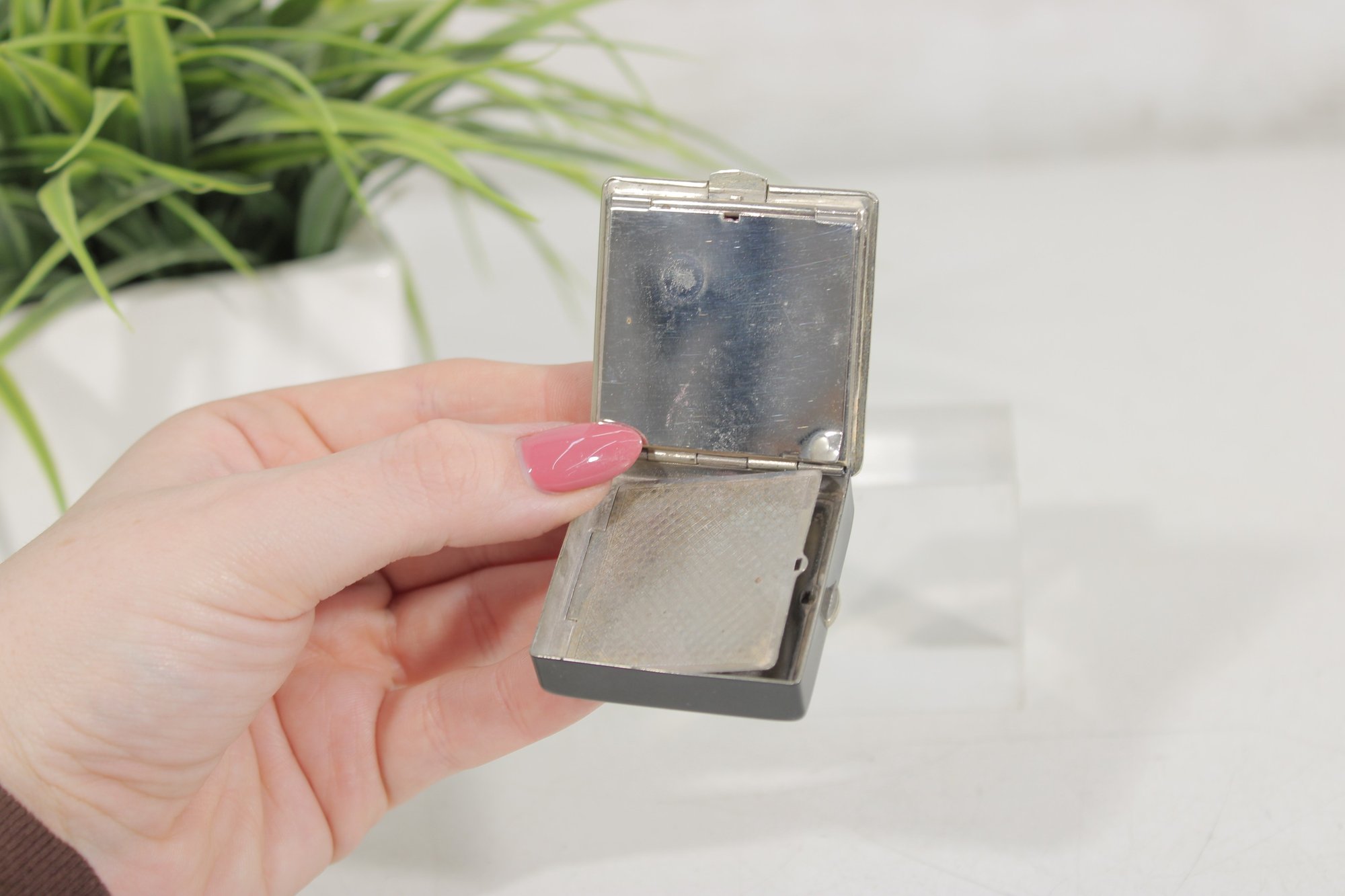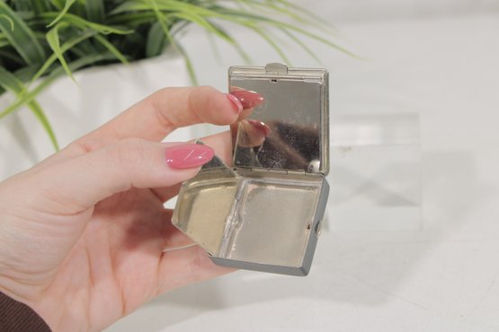 The compact opens to reveal a mirror and divided powder compartments, designed for face powder and cosmetics. Its compact size made it a convenient accessory carried in handbags or evening purses.