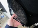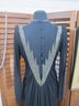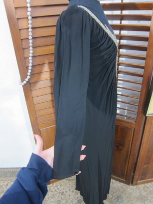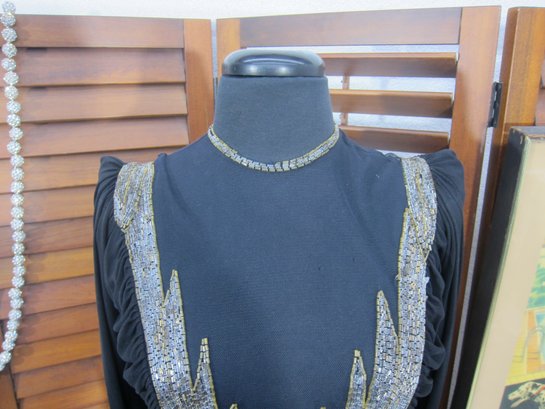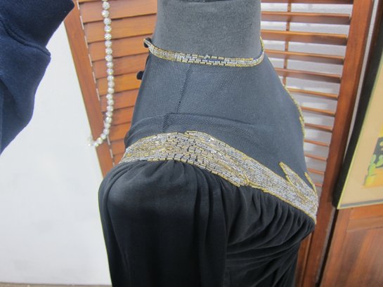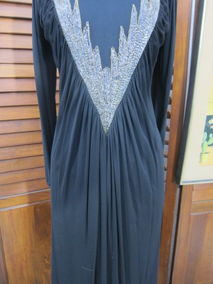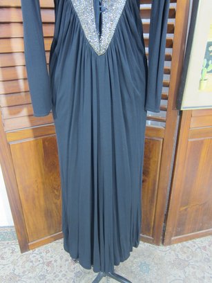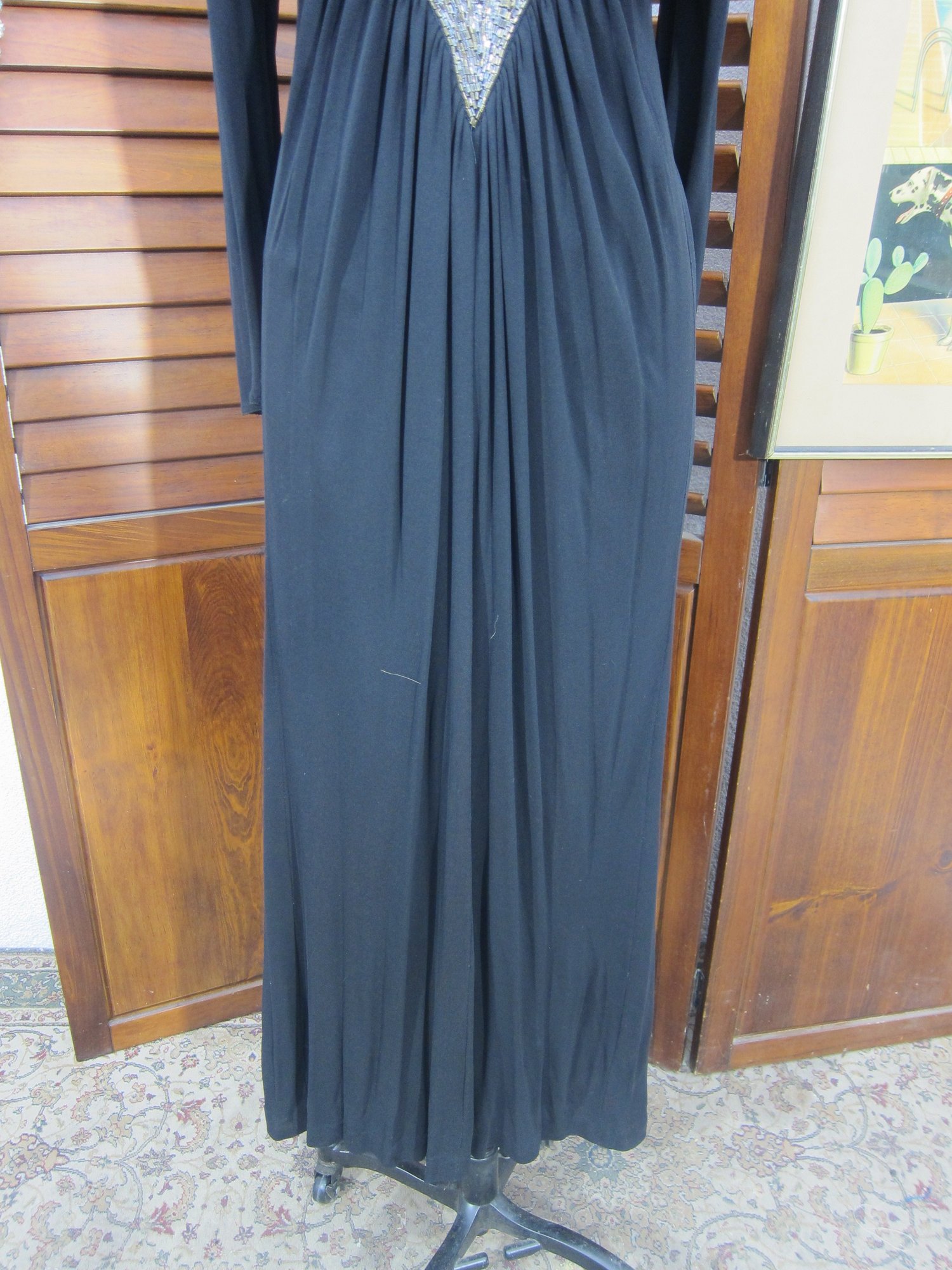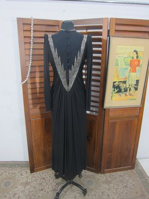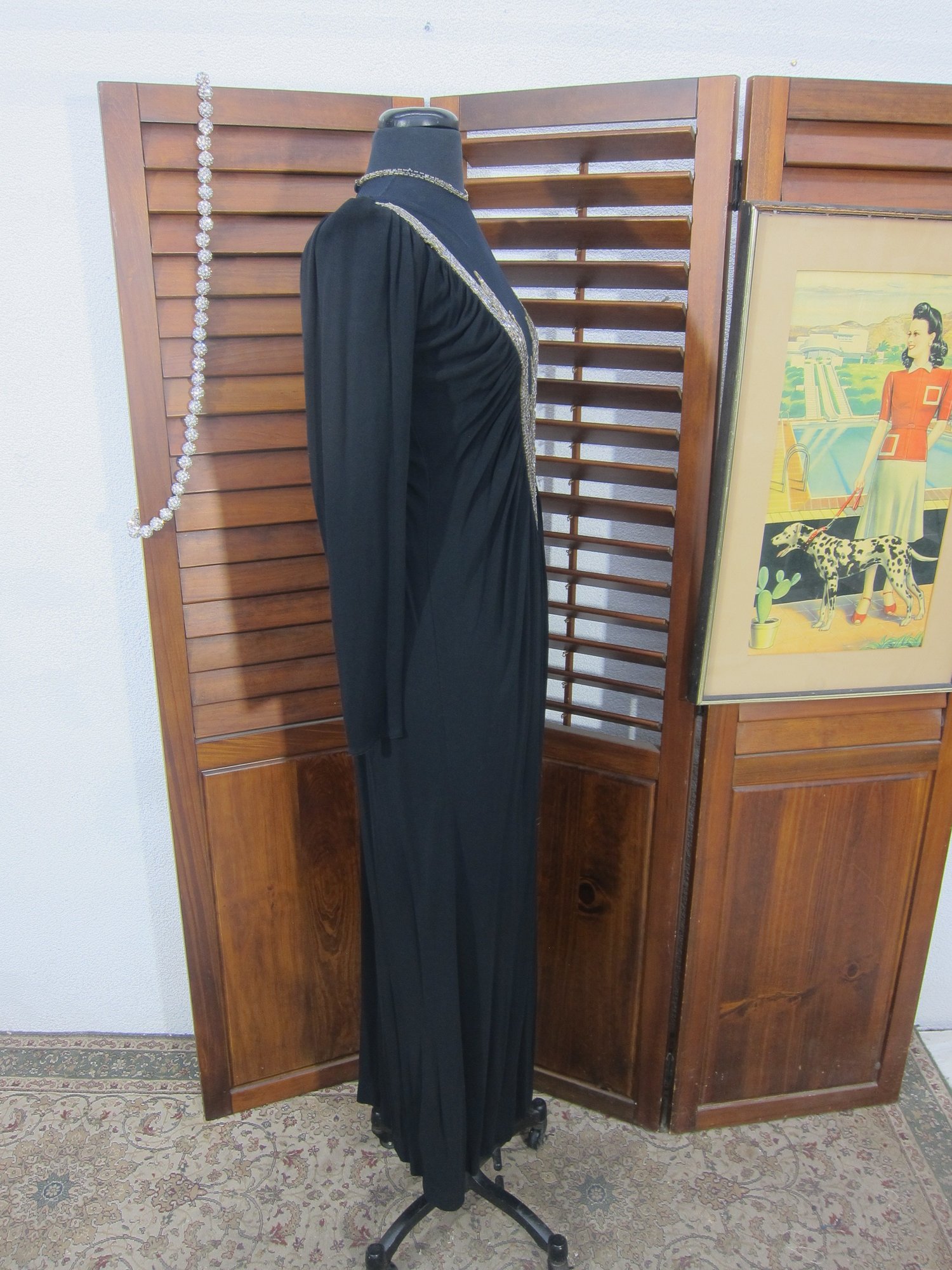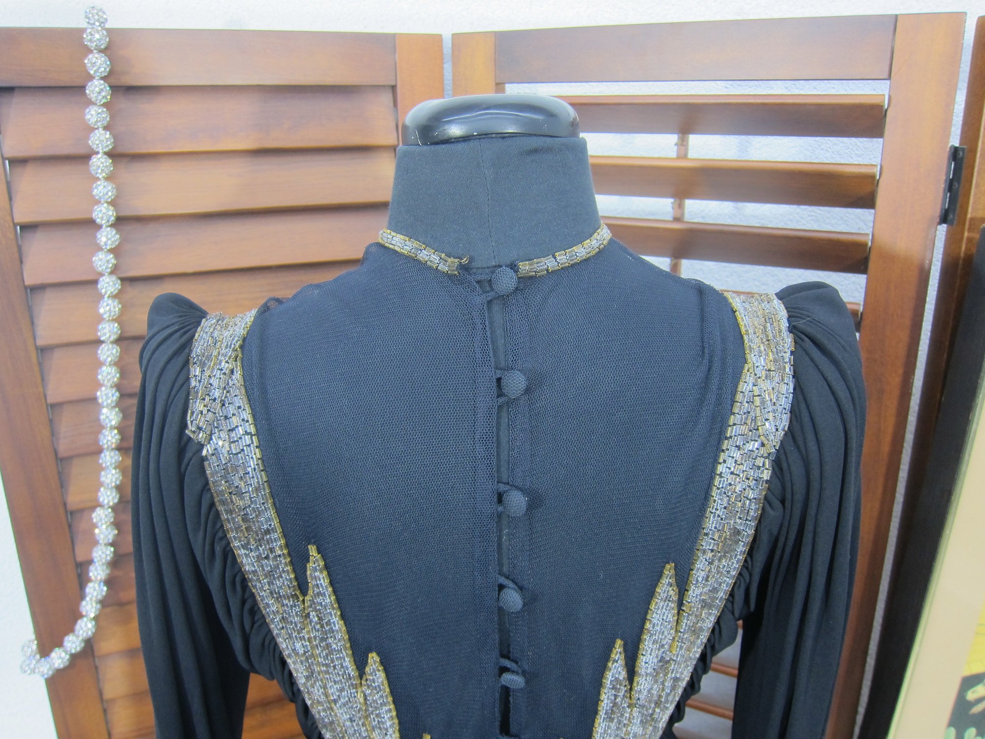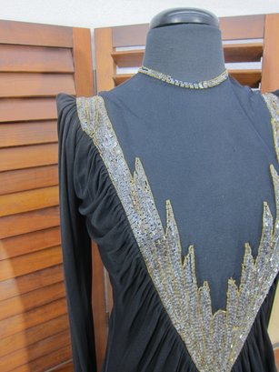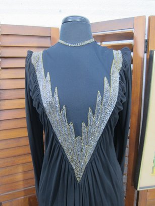 Dramatic vintage black evening gown featuring striking gold beaded chevron detailing across the bodice and back. This elegant dress offers long sheer sleeves, a softly gathered skirt, and a flowing full-length silhouette that moves beautifully. The bold V-shaped beadwork creates an Art Deco–inspired look, giving this gown timeless glamour and stage presence.