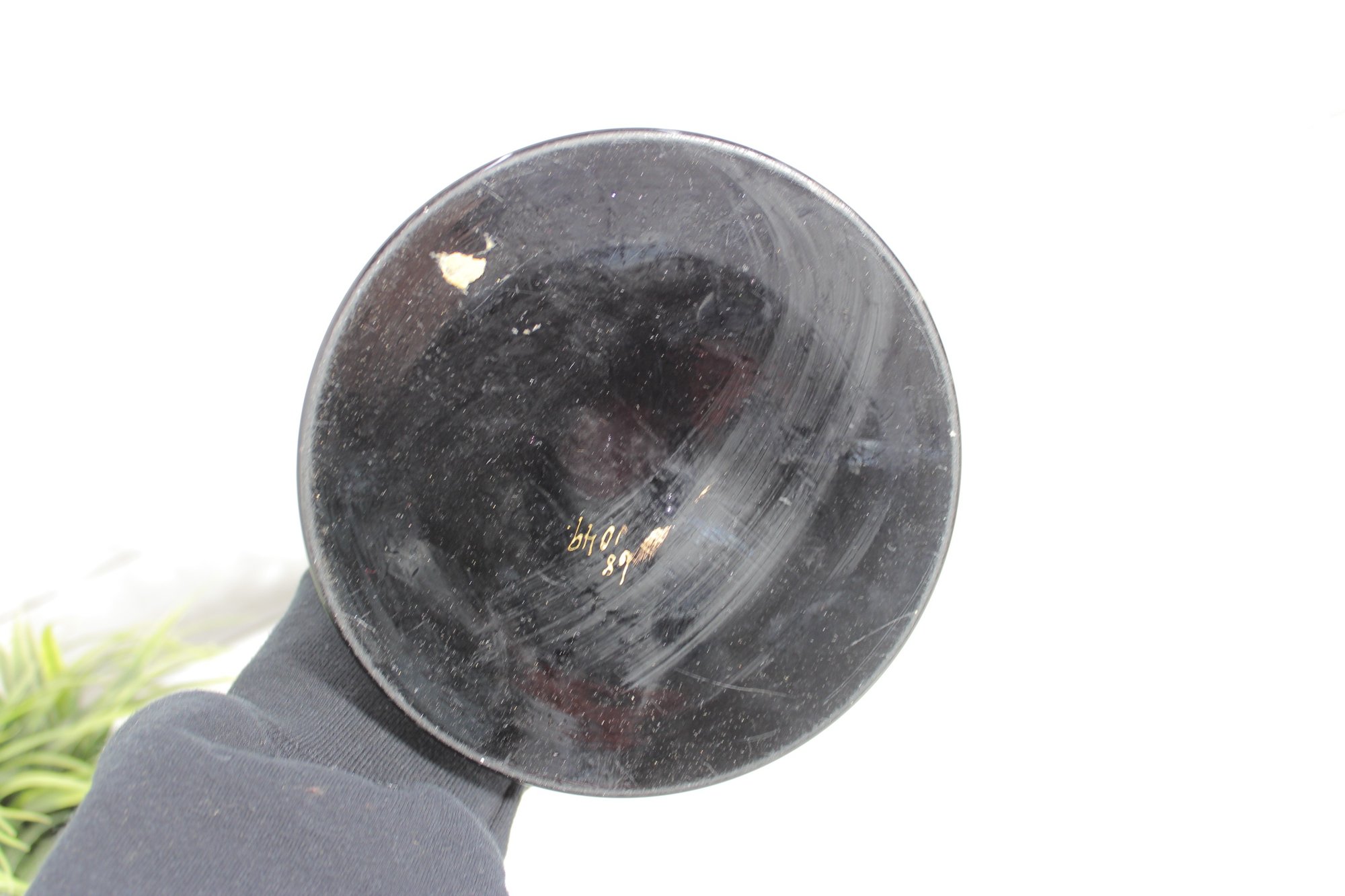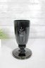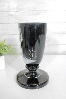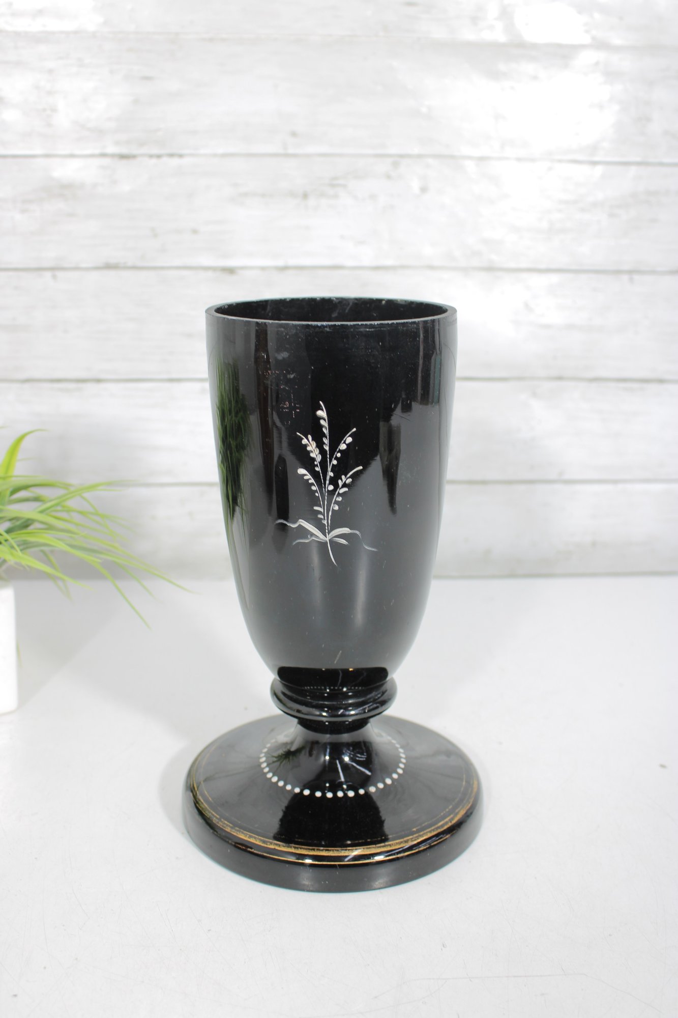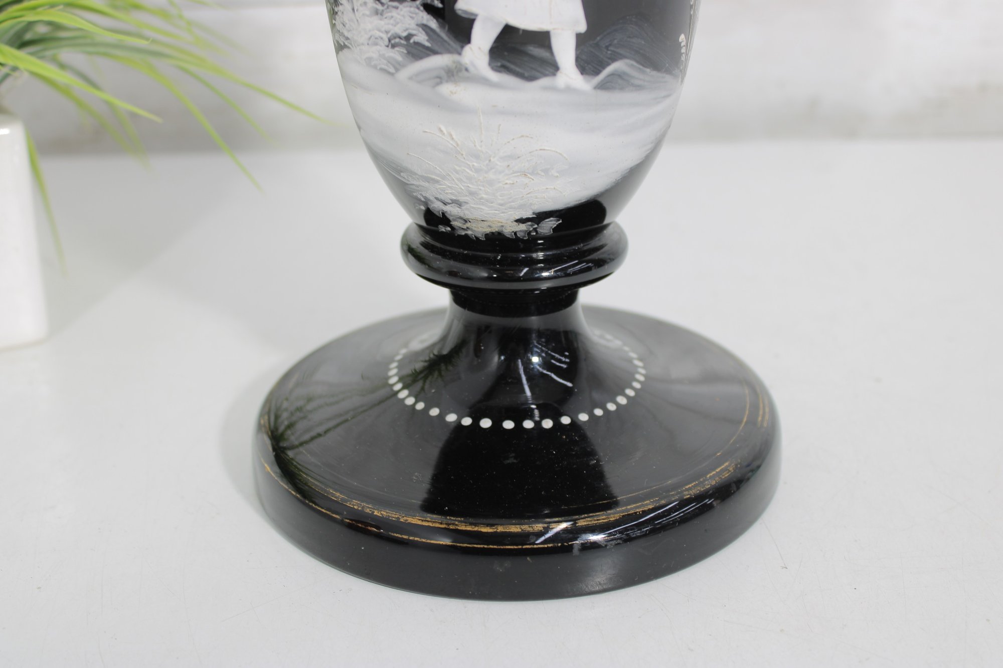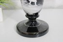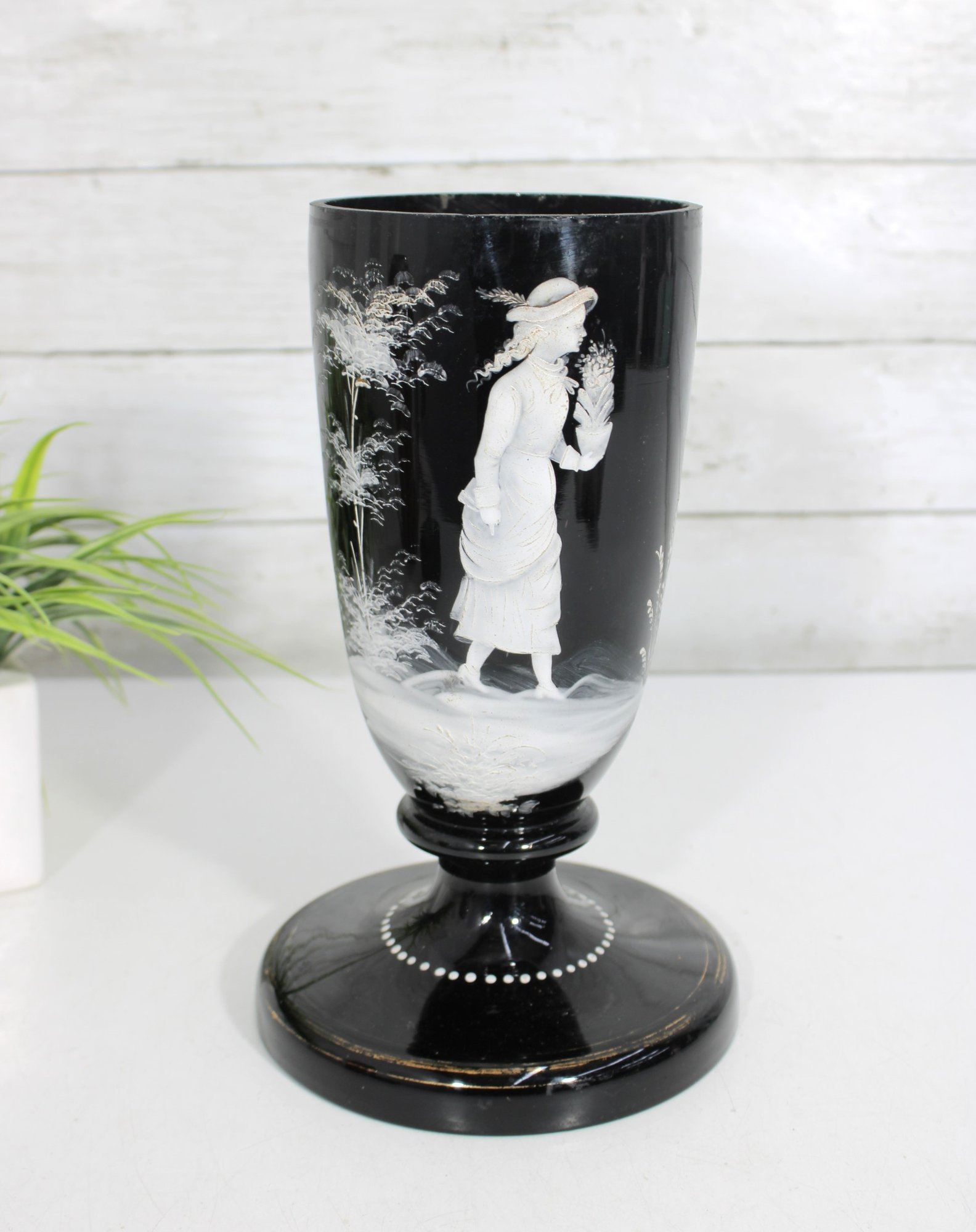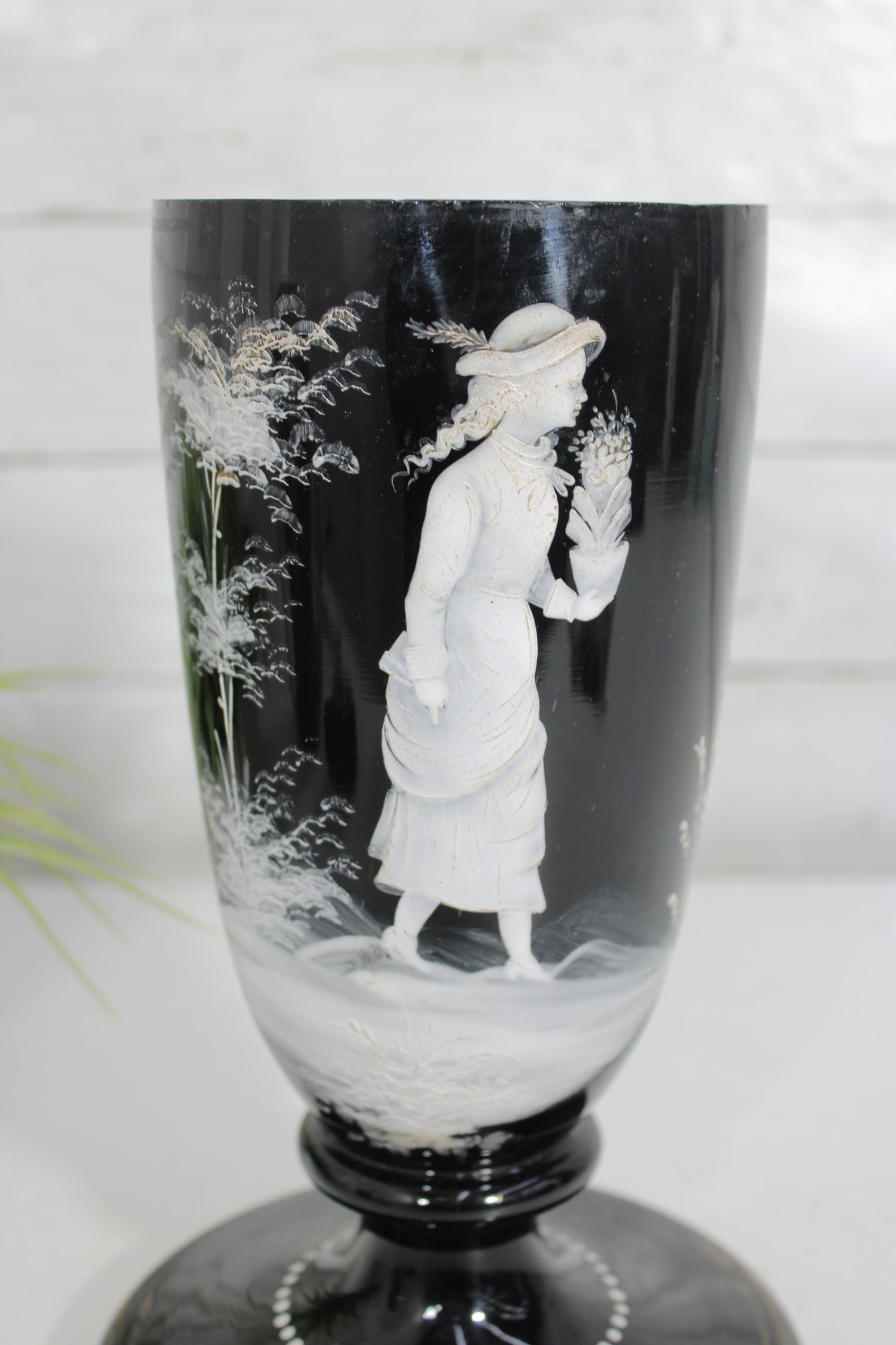 vintage black glass cameo-style vase featuring a beautifully etched white figural scene. The design depicts a woman in period dress set against a delicate landscape, creating a striking contrast against the deep black glass.