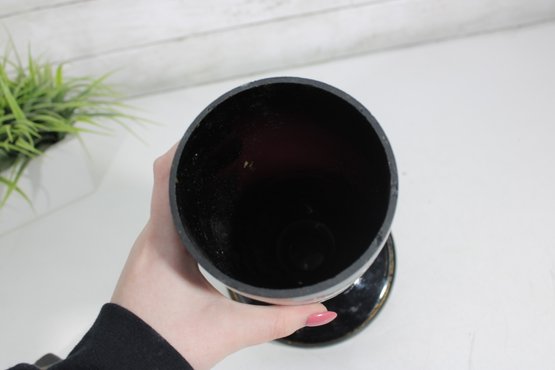 The vase is raised on a classic pedestal base accented with subtle decorative detailing, adding to its refined and timeless appeal. The interior reveals a rich dark tone when viewed from above, enhancing its visual depth.