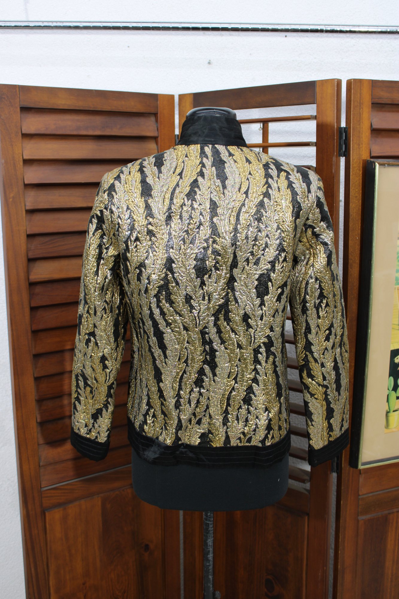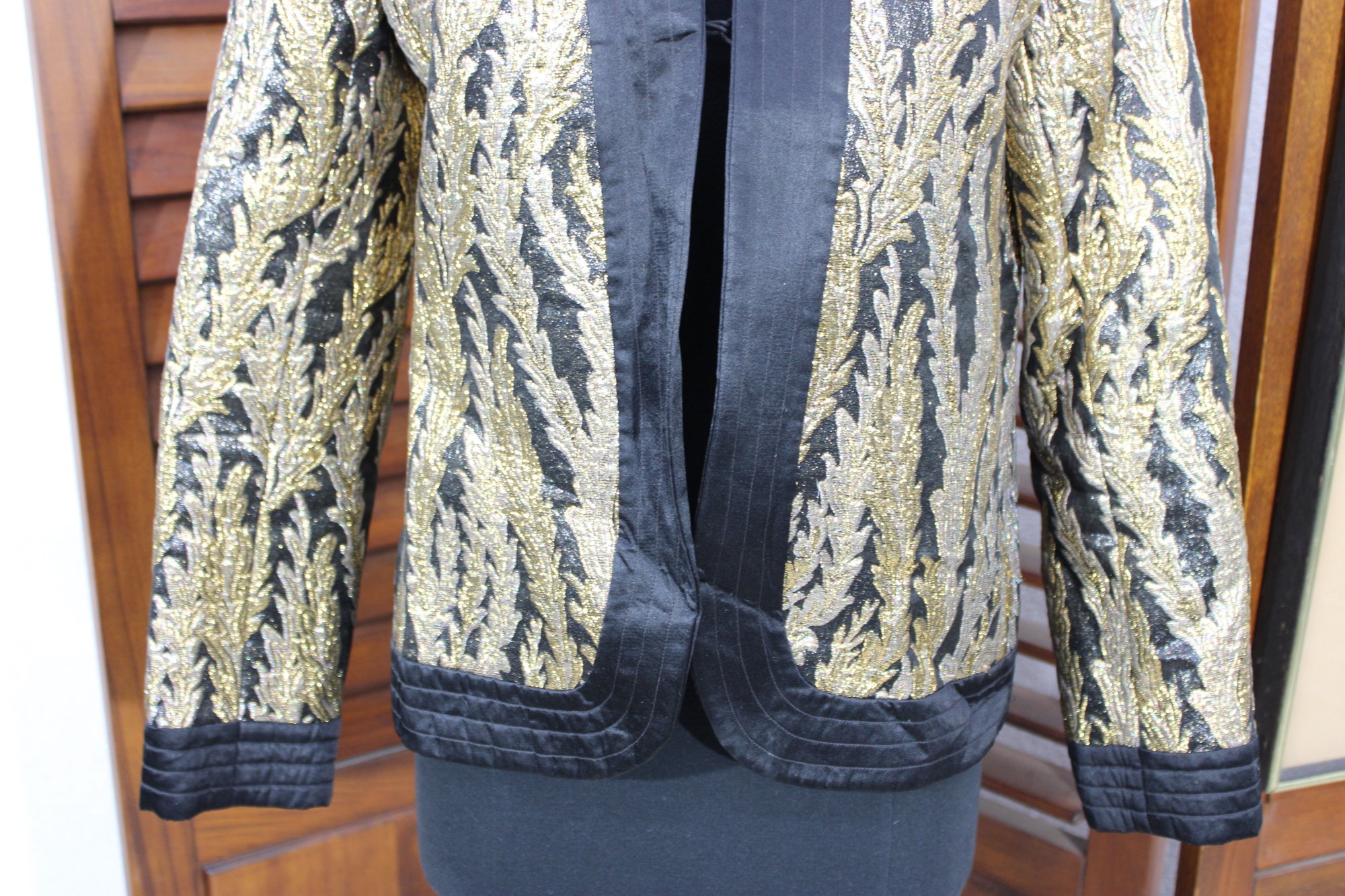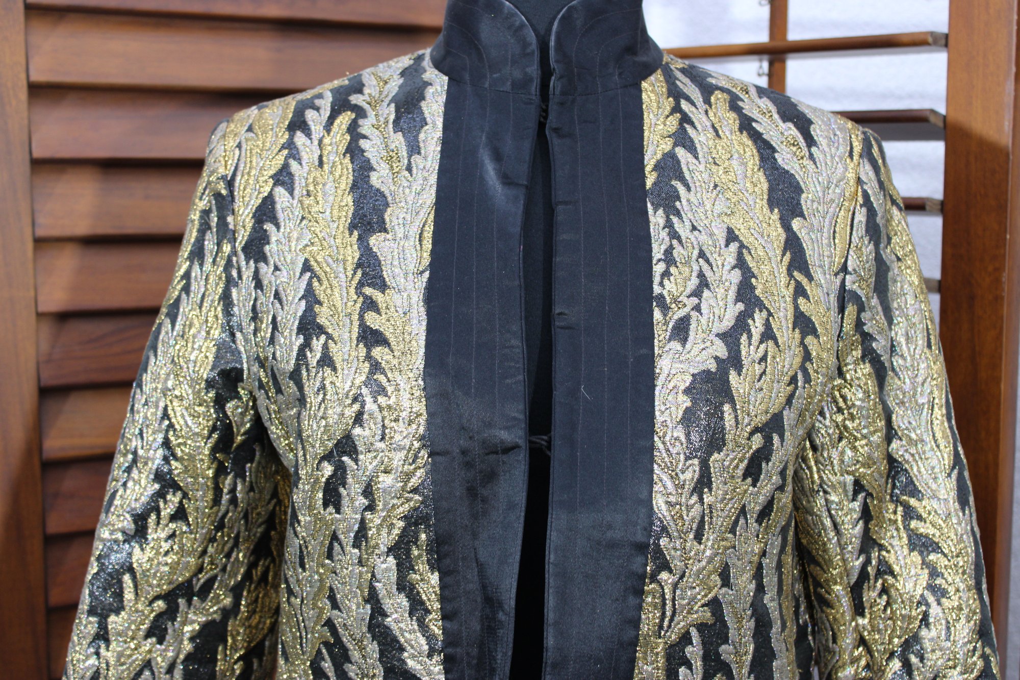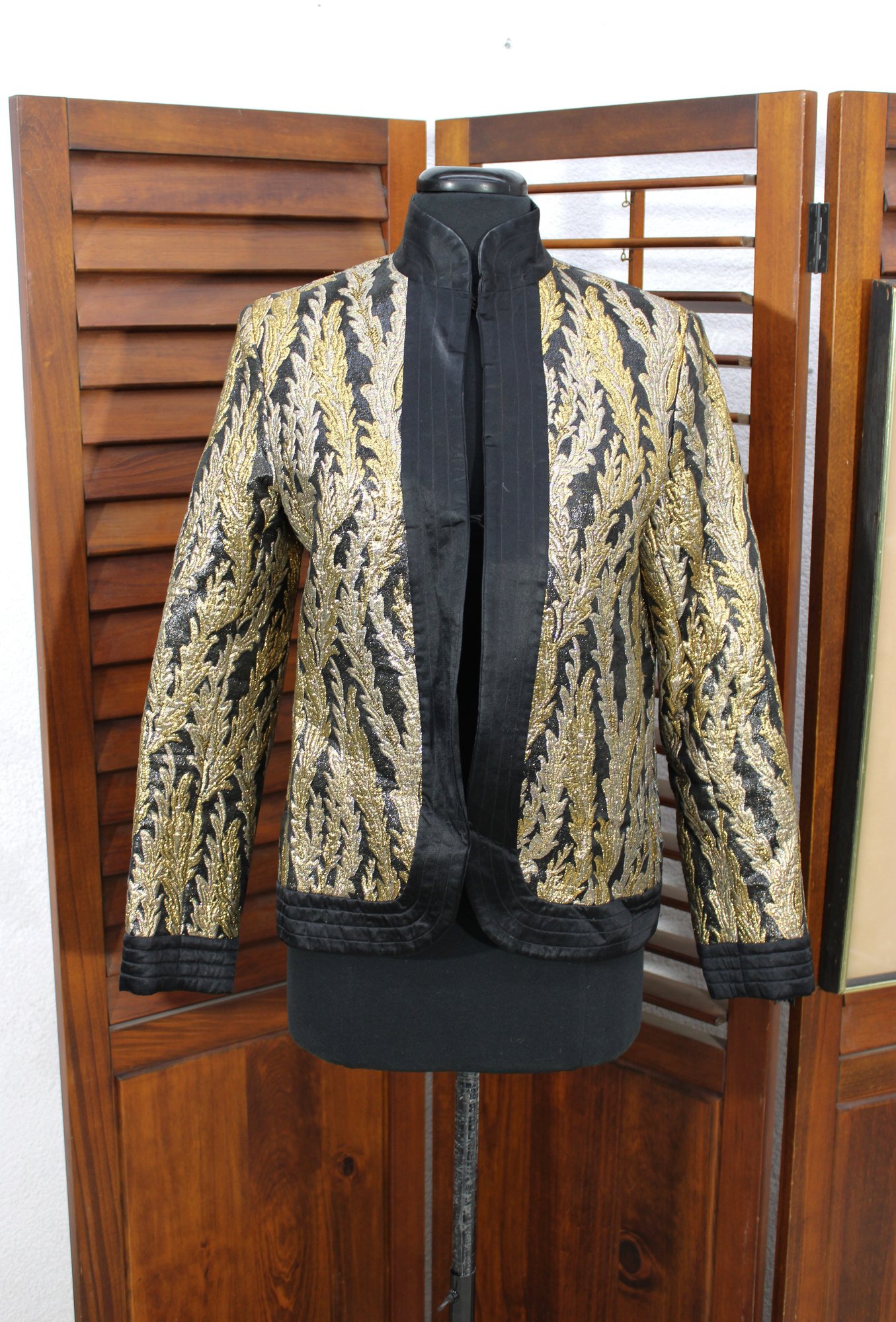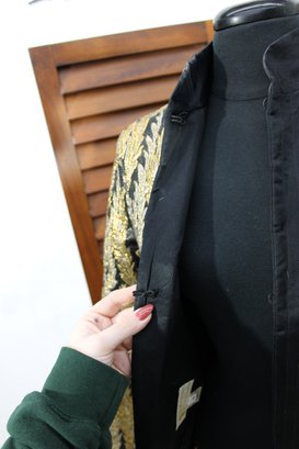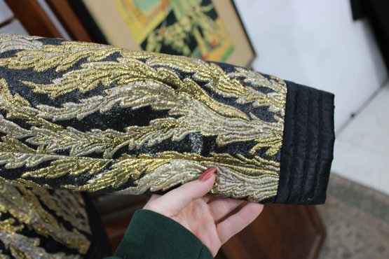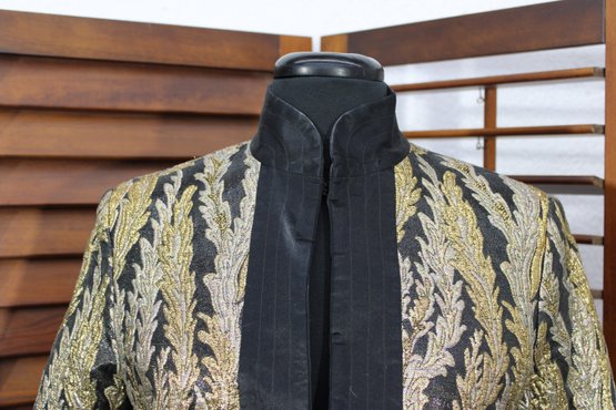 Striking and elegant, this vintage black and gold brocade jacket features an allover woven leaf motif that gives it a rich, timeless presence. The shimmering gold pattern contrasts beautifully against the black background, making this a standout piece for evening wear, formal occasions, or vintage fashion collections.