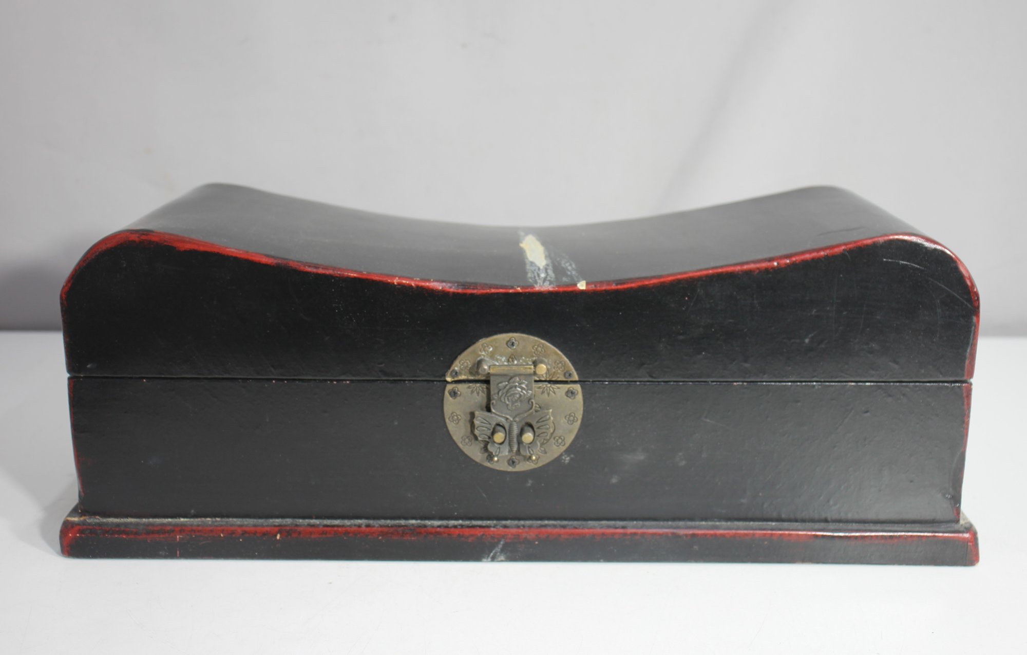 This stunning vintage black lacquered wooden storage box features a unique curved top and intricate brass hardware, making it a beautiful and functional addition to your space.
