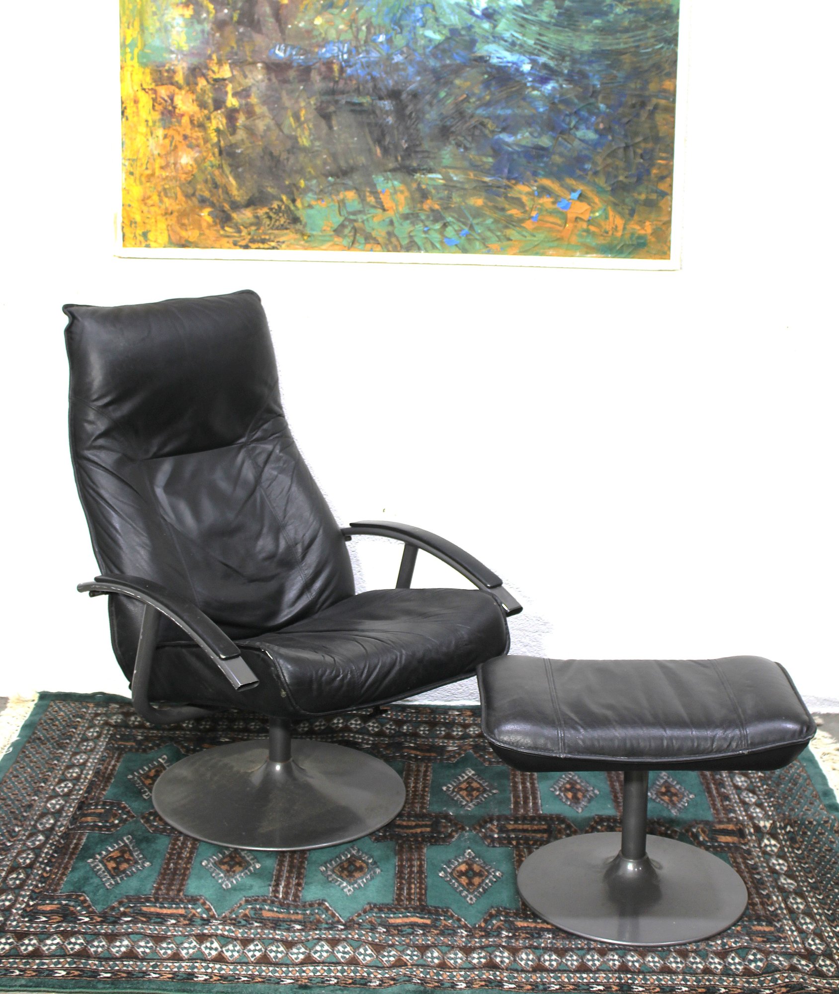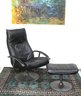 Relax in style with this sleek vintage black leather swivel recliner and matching ottoman.